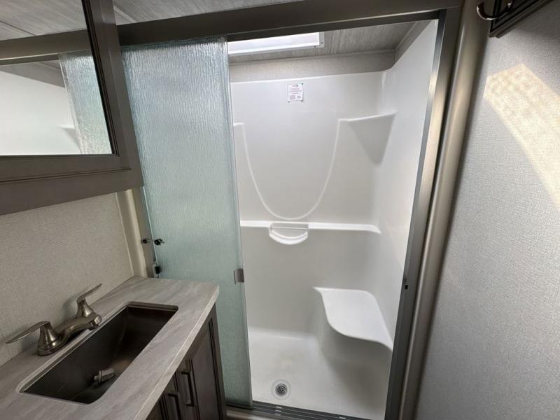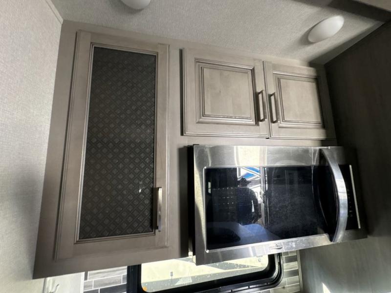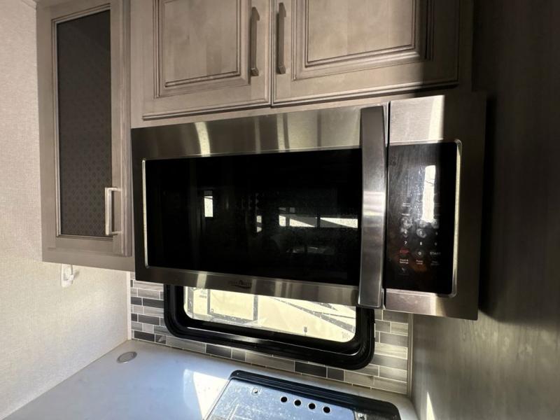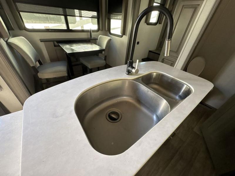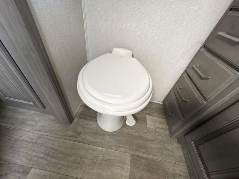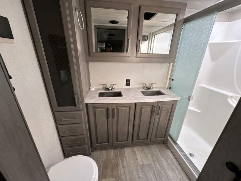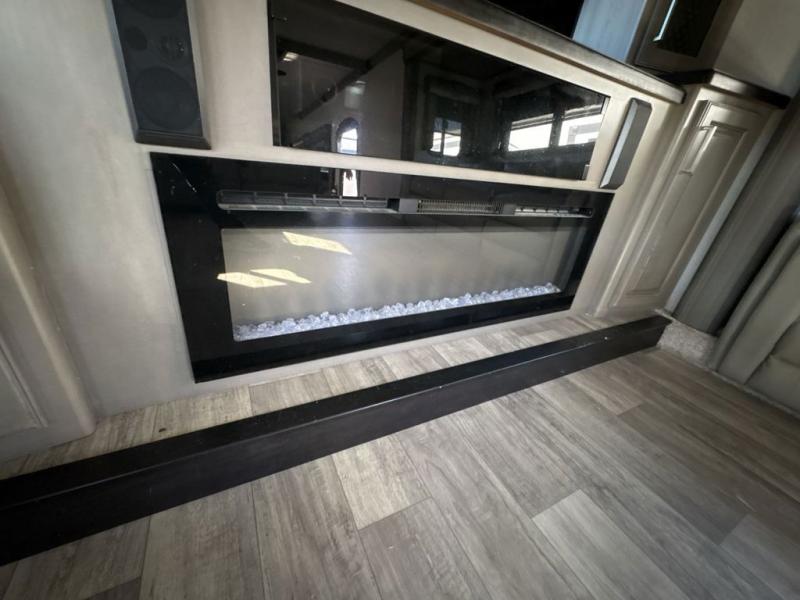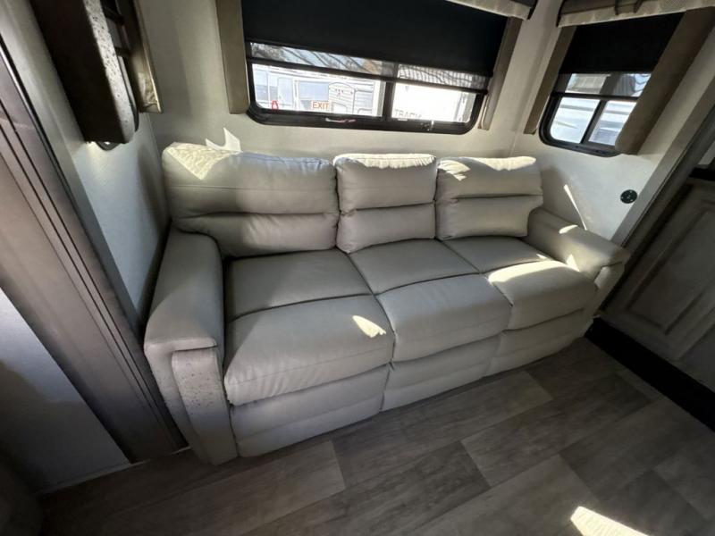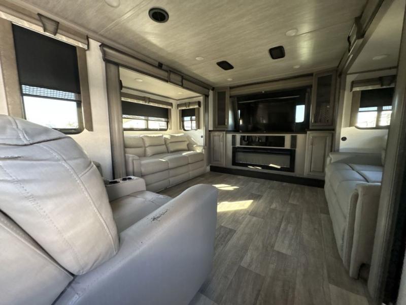 You and your family will feel the most at home when you are staying in this Montana fifth wheel because it has all of your favorite features from home, like a separate living room up front, a master suite with its own full bathroom, another half bathroom out in the kitchen, and an island in the kitchen for prep work. The other aspect of this unit that you will love is all of the comfortable seating with the two hide-a-bed sofas and power theater seating in the living room. There is also a fireplace and 50" LED HDTV in the living room to finish it off, and you will even find a second LED HDTV back within the master suite.