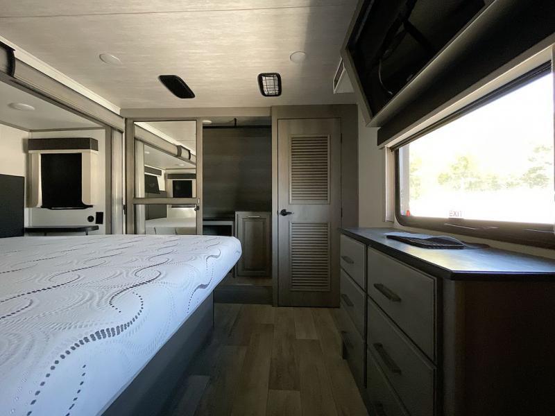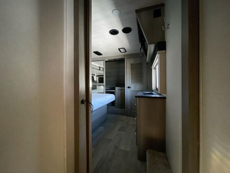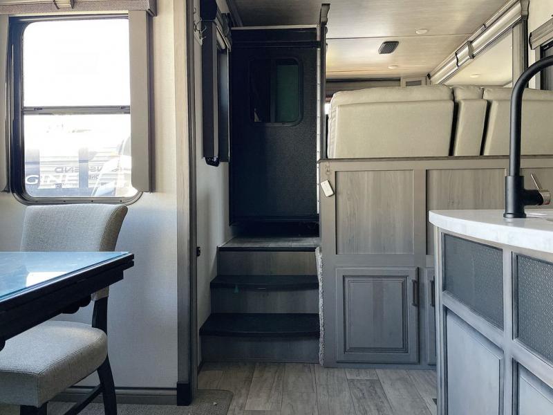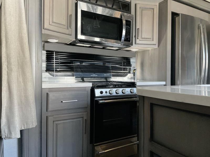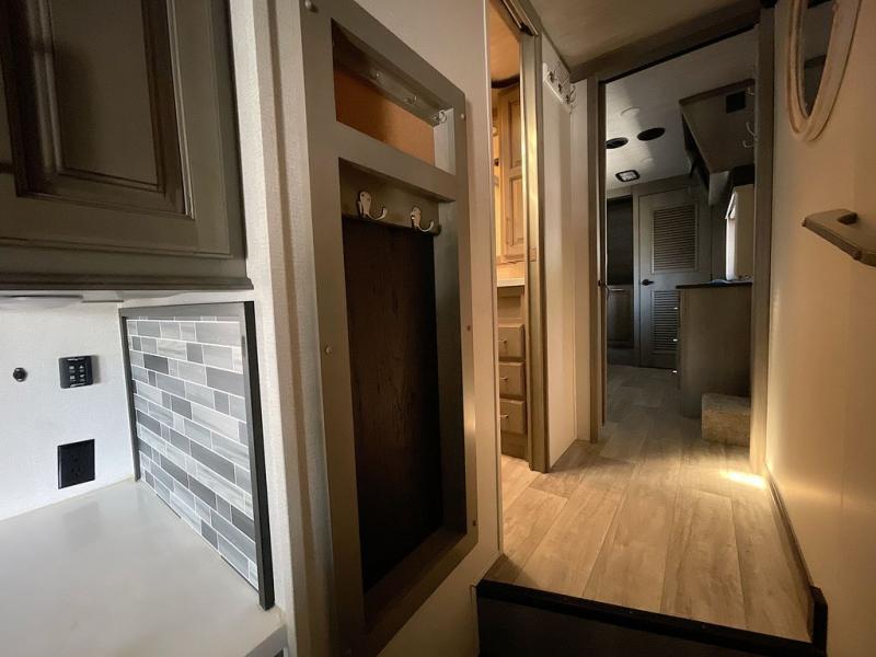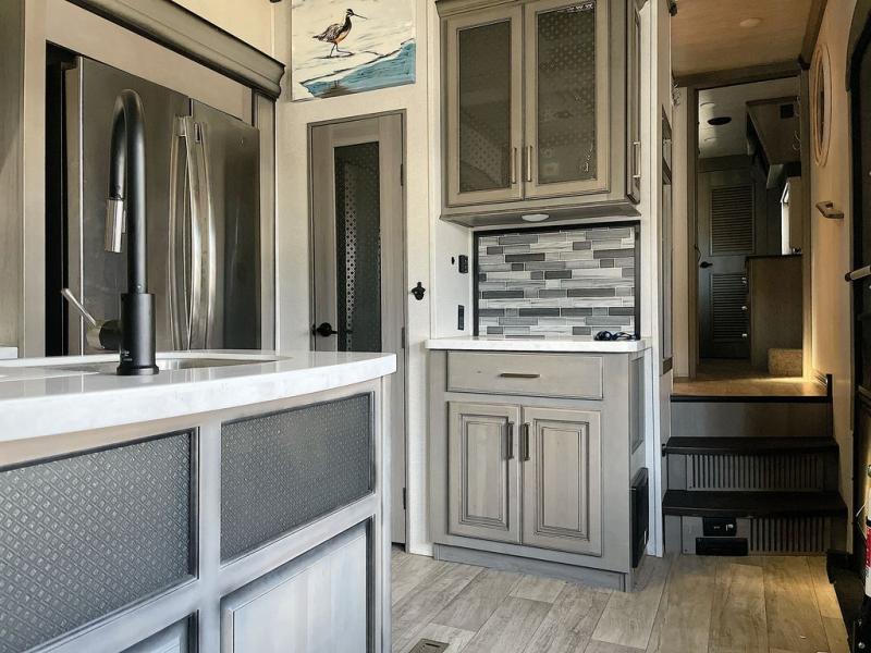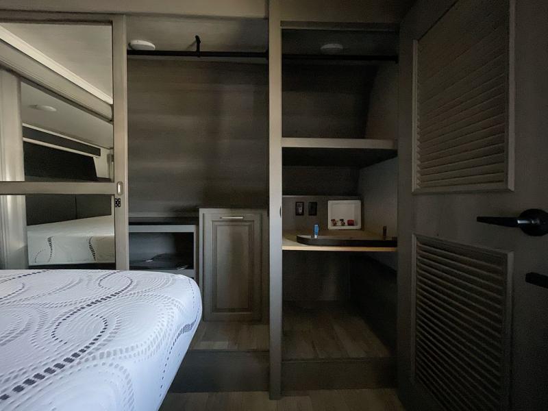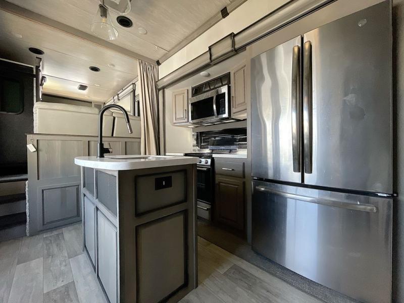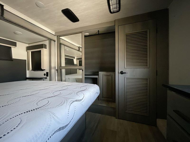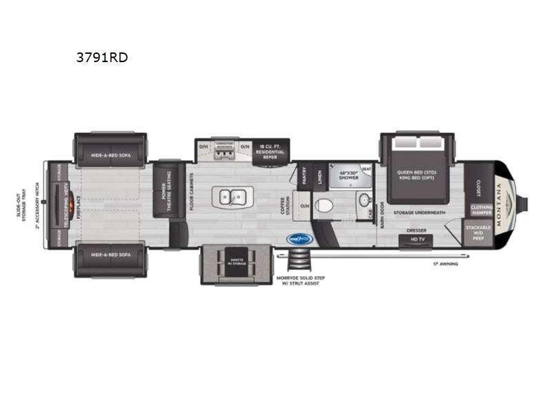 The thing that you will love most about this Montana fifth wheel is the kitchen! Because the kitchen has opposing slides, you have plenty of space to work around the island. There is also a coffee station that you can use whenever you need a specialty brew, and the pantry, floor cabinets, and overhead cabinets provide you with great storage. Right next to the kitchen is the separate living room which also has opposing slides so that you have room to lounge on the two hide-a-bed sofas or on the power theater seating, and if you need some privacy while you relax, you can simply head up to the queen bed slide in the private bedroom. The bedroom is where you will find the clothing hamper, under-bed storage, preparations for the optional washer/dryer, and a barn door to close it off.