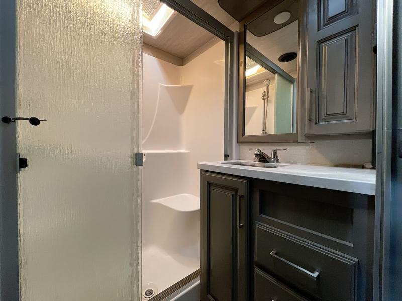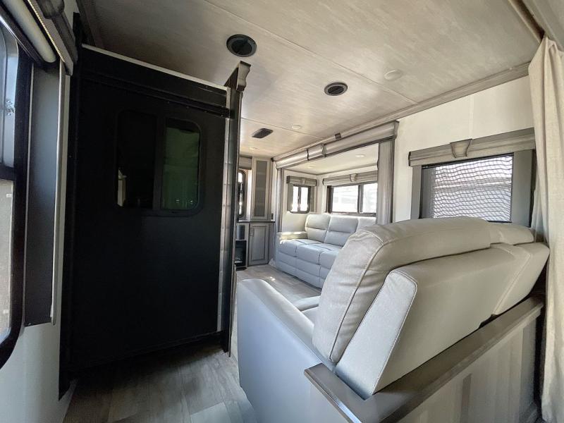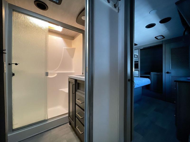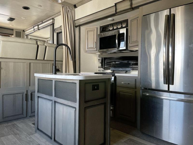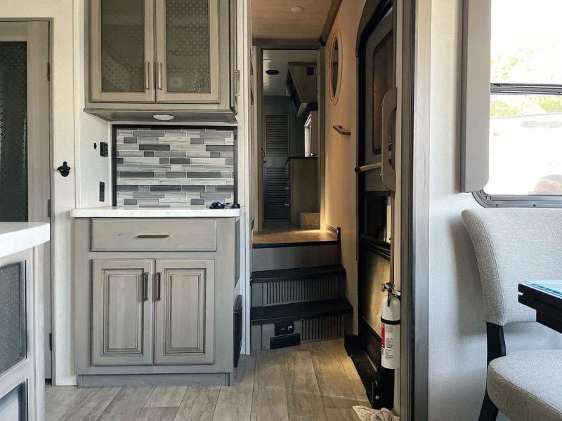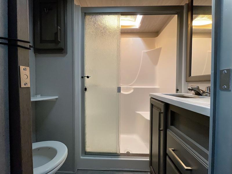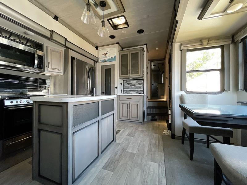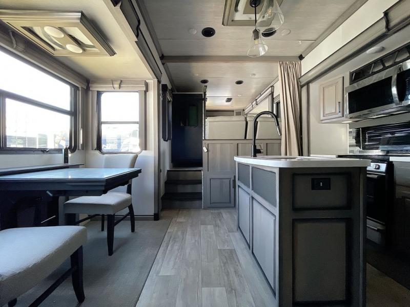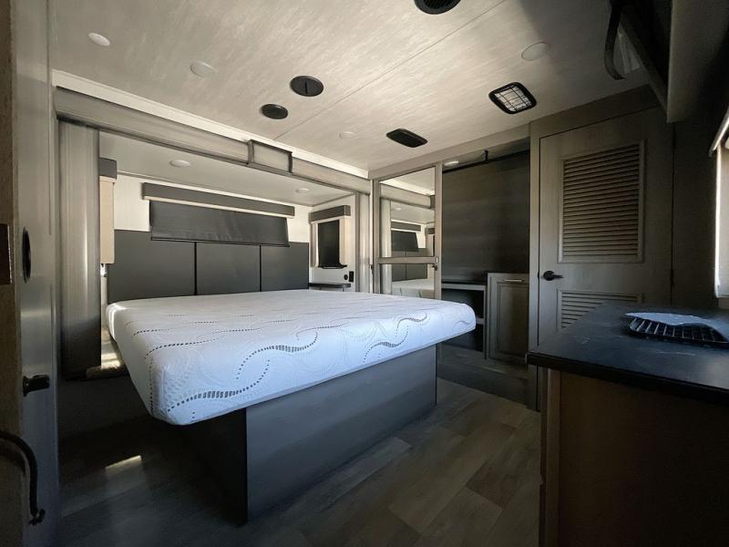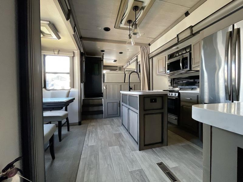 The thing that you will love most about this Montana fifth wheel is the kitchen! Because the kitchen has opposing slides, you have plenty of space to work around the island. There is also a coffee station that you can use whenever you need a specialty brew, and the pantry, floor cabinets, and overhead cabinets provide you with great storage. Right next to the kitchen is the separate living room which also has opposing slides so that you have room to lounge on the two hide-a-bed sofas or on the power theater seating, and if you need some privacy while you relax, you can simply head up to the queen bed slide in the private bedroom. The bedroom is where you will find the clothing hamper, under-bed storage, preparations for the optional washer/dryer, and a barn door to close it off.