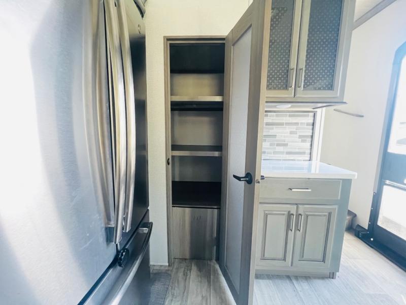 The thing that you will love most about this Montana fifth wheel is the kitchen! Because the kitchen has opposing slides, you have plenty of space to work around the island. There is also a coffee station that you can use whenever you need a specialty brew, and the pantry, floor cabinets, and overhead cabinets provide you with great storage. Right next to the kitchen is the separate living room which also has opposing slides so that you have room to lounge on the two hide-a-bed sofas or on the power theater seating, and if you need some privacy while you relax, you can simply head up to the queen bed slide in the private bedroom. The bedroom is where you will find the clothing hamper, under-bed storage, preparations for the optional washer/dryer, and a barn door to close it off.