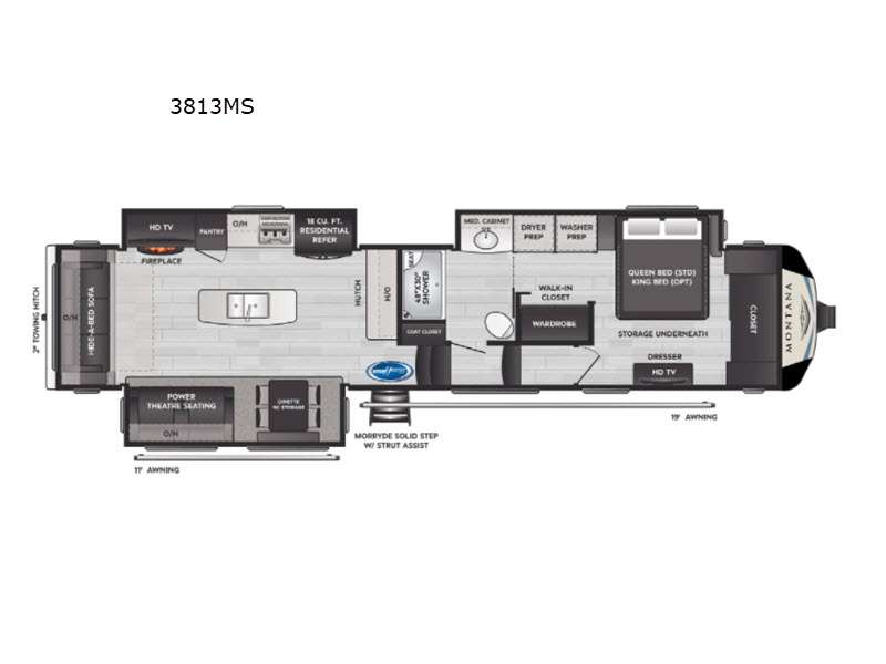 With a large, unique master suite, this Montana fifth wheel is sure to provide you with the very best vacations! Not only does the bedroom have one full-width closet, but it also has a second walk-in closet which makes this space feel glamorous. Plus, you have even more storage space with the under-bed storage, and the 32" LED HDTV rests on the dresser across from the queen-size bed so that you can easily view the news before bed. The bedroom connects to the dual-entry bathroom so that you can have discreet access into the 48" x 30" shower in the morning, and once you make your way out into the main living area, you'll be pleasantly surprised to find power theater seating across from the fireplace and 50" LED HDTV for an additional lounge space.
