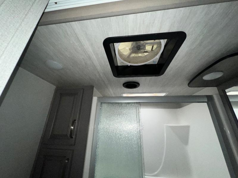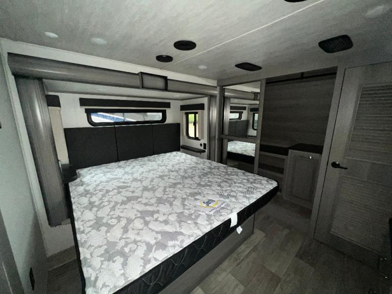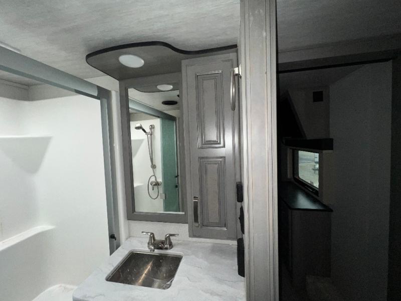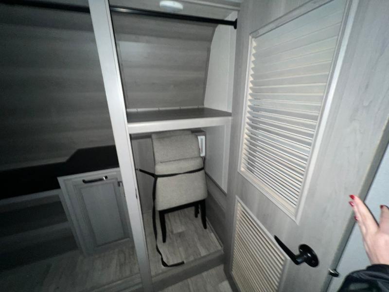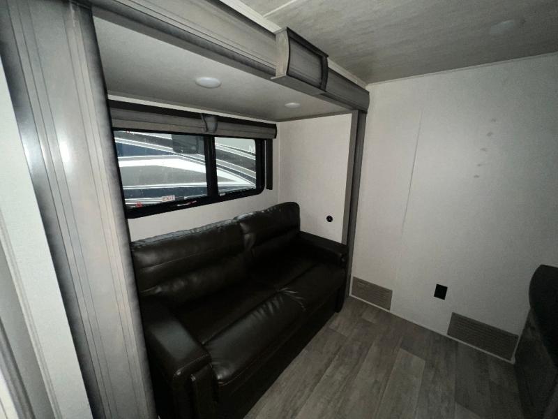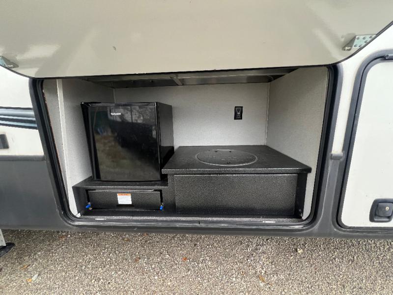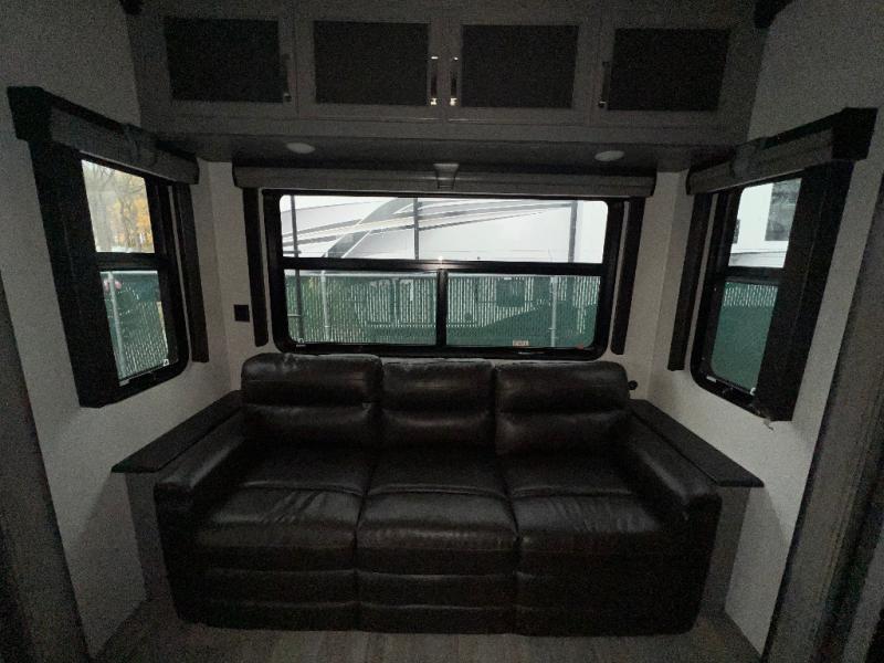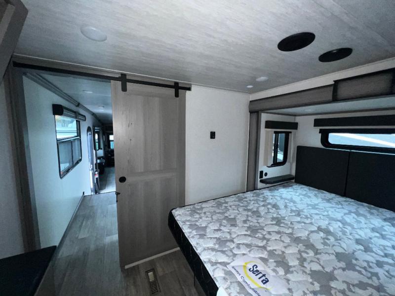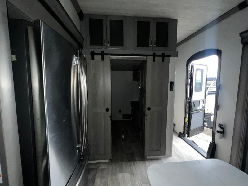 Whether it's a weekend at your local state park or a month-long journey across the country, you'll find great comfort in this Montana fifth wheel! The best feature on this unit is the bonus room because it can serve as a bedroom with its hide-a-bed sofa, or it can be used as an office since it contains a work desk. A set of barn doors closes this space off from the rest of the unit, and there is also a loft above where you can place storage bins or overnight guests. As you all gather together in the main living area, you'll appreciate the comfortable seating with the hide-a-bed sofa and power theater seating. You can also sit in one of the four chairs at the free-standing dinette. Up in the private bedroom, the clothing hamper will allow you to keep your floors free of dirty laundry, and the under-bed storage will allow you to keep your bulky sweaters and hiking boots hidden.