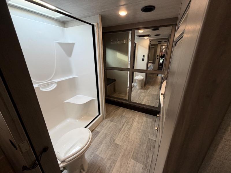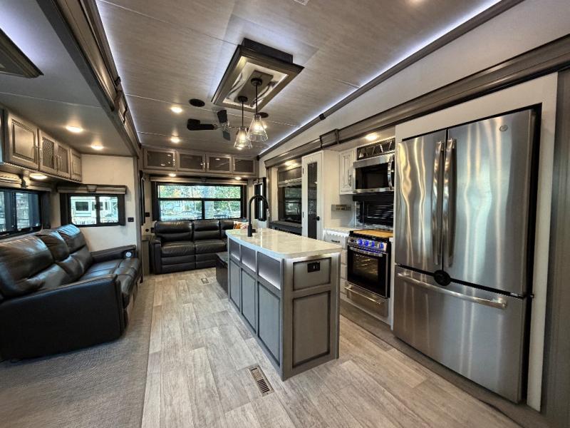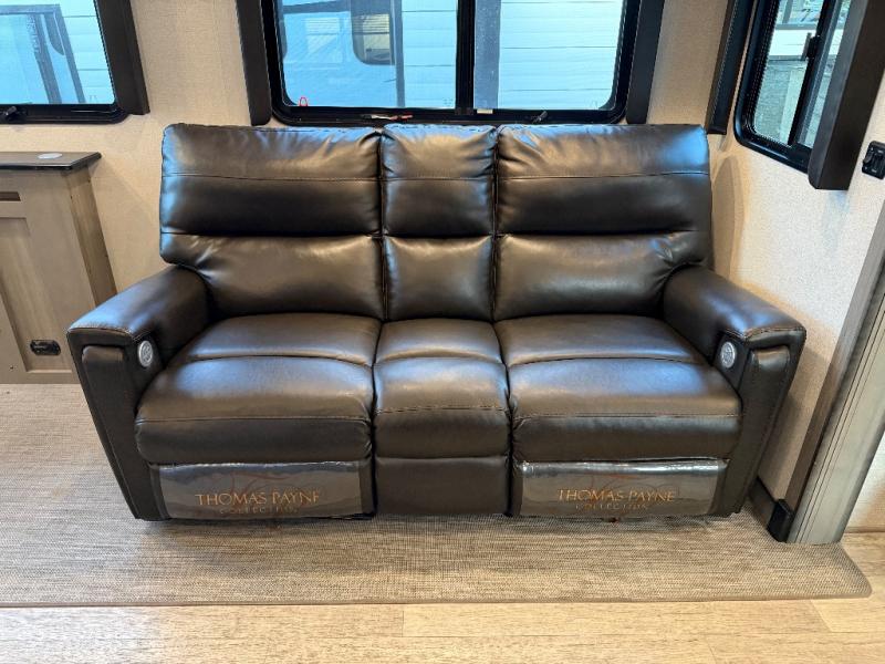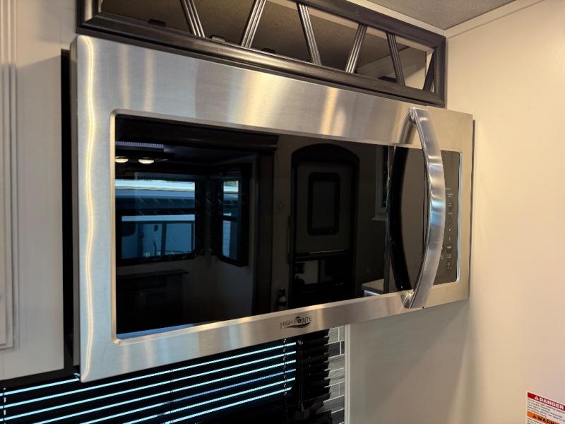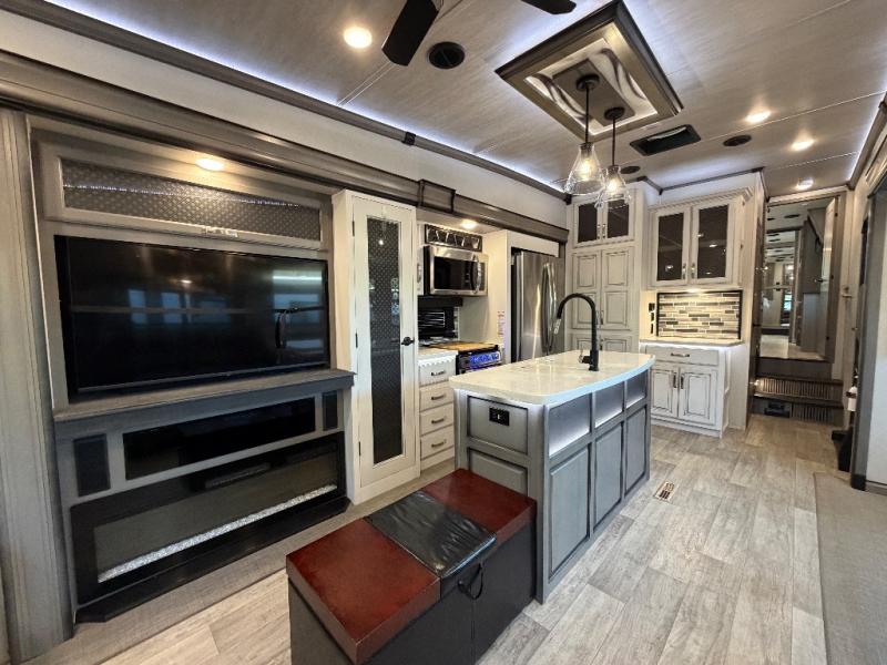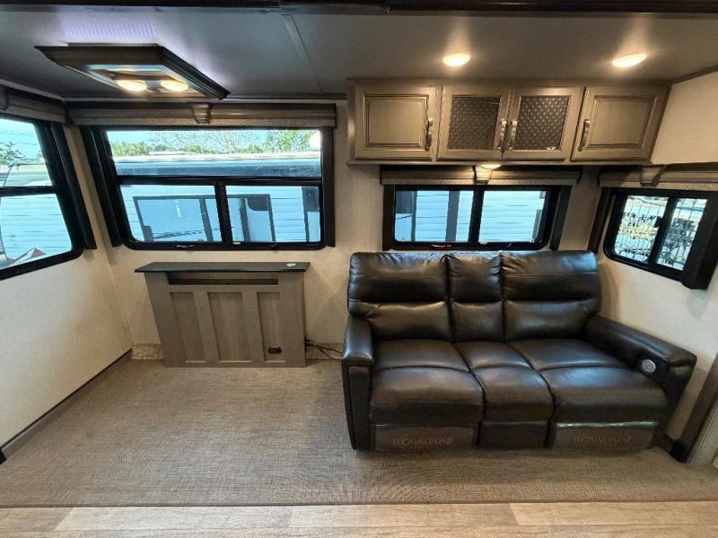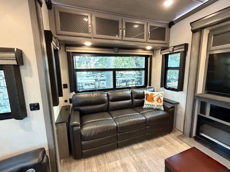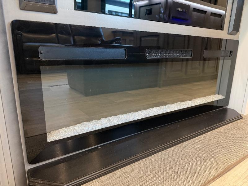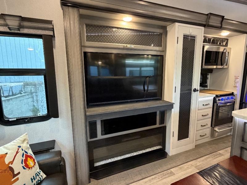 You will constantly find new reasons to appreciate this luxurious and stunning Montana fifth wheel! The best feature of this unit is the huge master suite up at the front. A set of steps leads you up to the bedroom, and there is a barn door that separates the large full bathroom from the bedroom. Within this front bathroom is a full-width closet, a bench seat, a 48" x 30" shower, and a dual-sink vanity. You will feel so glamorous spending your mornings getting ready here. Back out in the main living area, there is a half bath so that your fellow travelers can also get ready in the morning, and they will find the hide-a-bed sofa to provide them with comfortable sleeping arrangements each night. Since the sofa is right next to the fireplace, it will provide everyone with a cozy place to sit down with a book and hot chocolate.