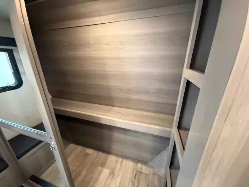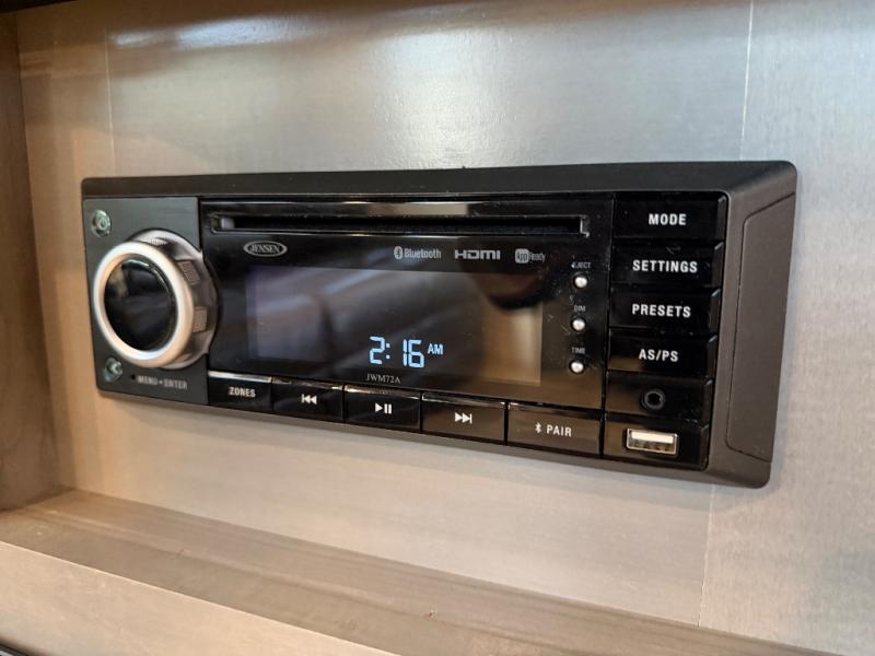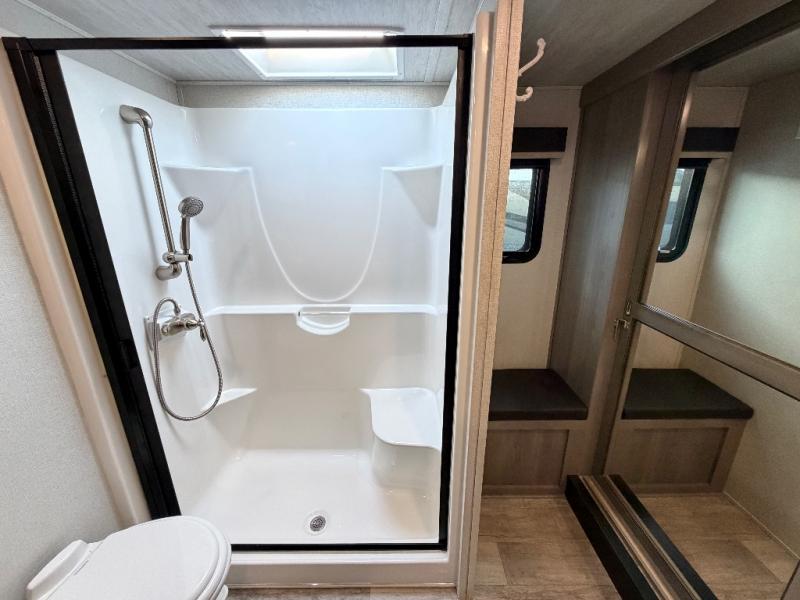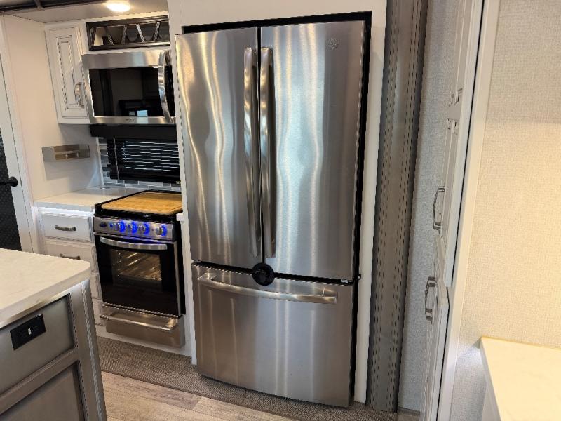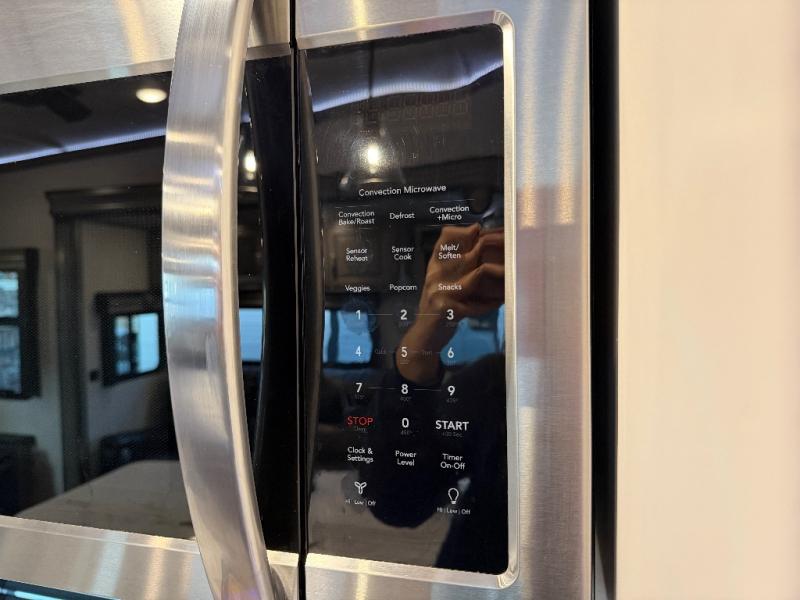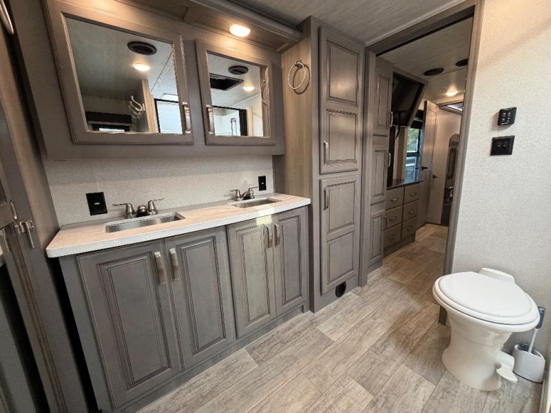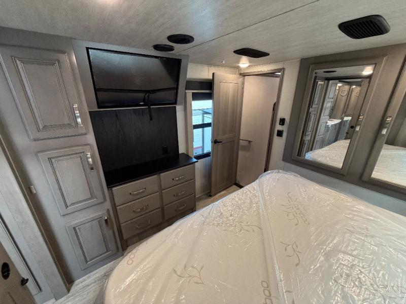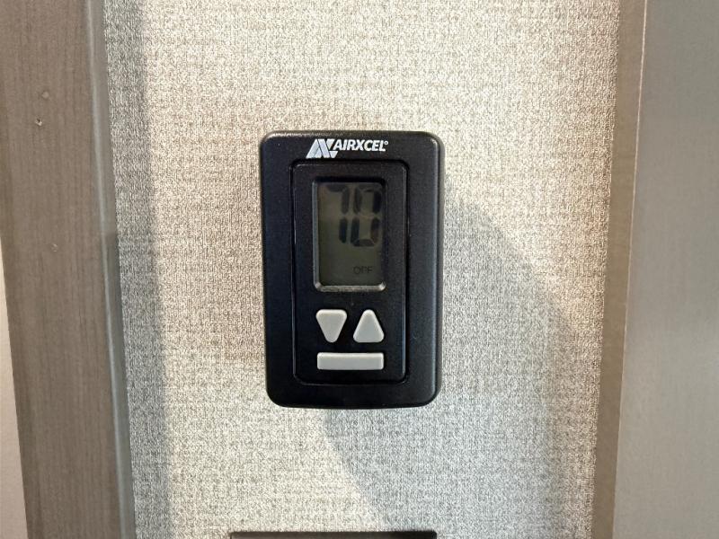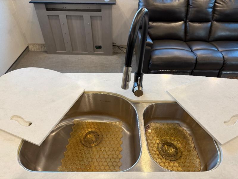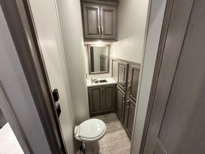 You will constantly find new reasons to appreciate this luxurious and stunning Montana fifth wheel! The best feature of this unit is the huge master suite up at the front. A set of steps leads you up to the bedroom, and there is a barn door that separates the large full bathroom from the bedroom. Within this front bathroom is a full-width closet, a bench seat, a 48" x 30" shower, and a dual-sink vanity. You will feel so glamorous spending your mornings getting ready here. Back out in the main living area, there is a half bath so that your fellow travelers can also get ready in the morning, and they will find the hide-a-bed sofa to provide them with comfortable sleeping arrangements each night. Since the sofa is right next to the fireplace, it will provide everyone with a cozy place to sit down with a book and hot chocolate.