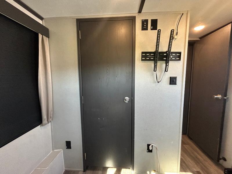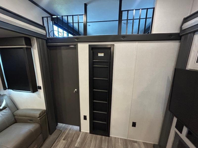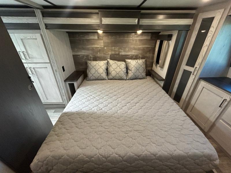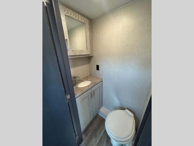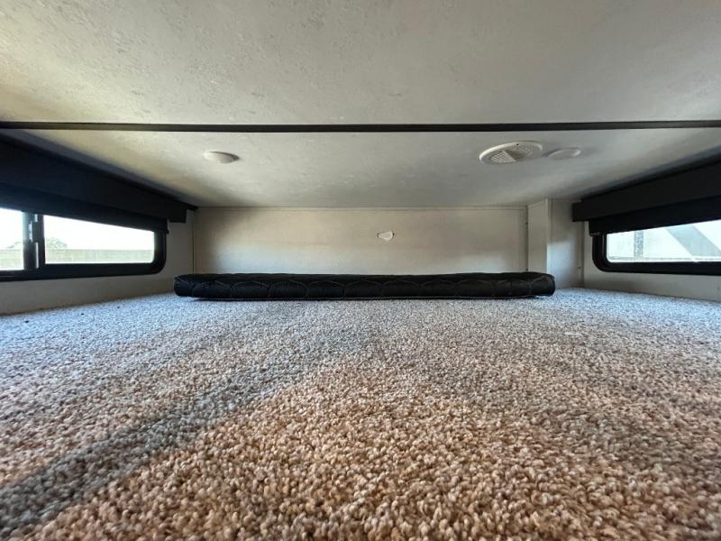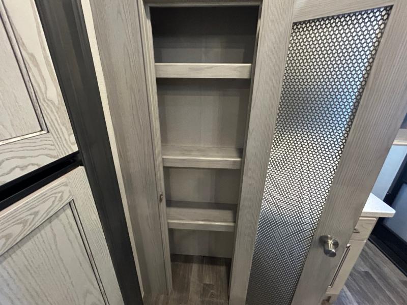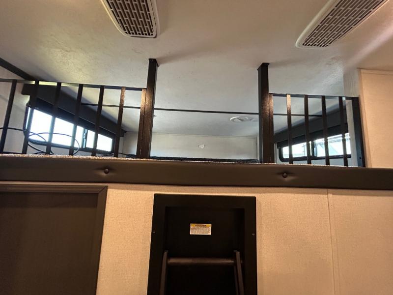 This unique layout allows you to enter into the front living area or straight into the rear private bunkhouse thanks to having two exterior entry/exit doors. The kids will have their own entry as well as bunk beds within a slide out, a half bath, and a wardrobe. There is a loft area above the bunkhouse that includes three bunk mats for more sleeping space. While the kids are playing, the adults can prepare dinner using the range with glass top, enjoy a cold drink together, and relax on the power theater seating. This kitchen is made complete with a center island, a coffee station, a pantry. Mom and dad will enjoy some privacy in the front master suite that includes a queen bed, access into the dual entry bath, and plenty of dresser and closet space for all their clothes.