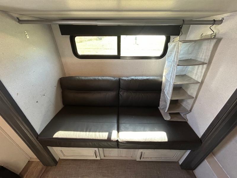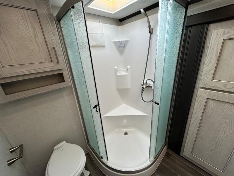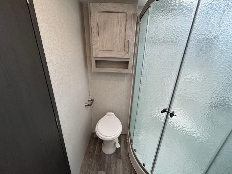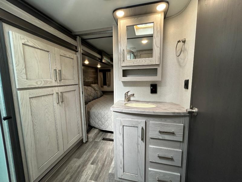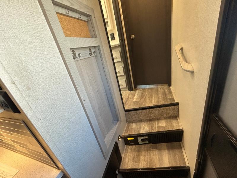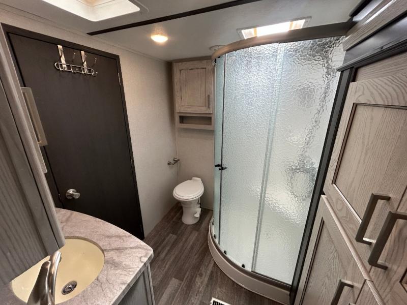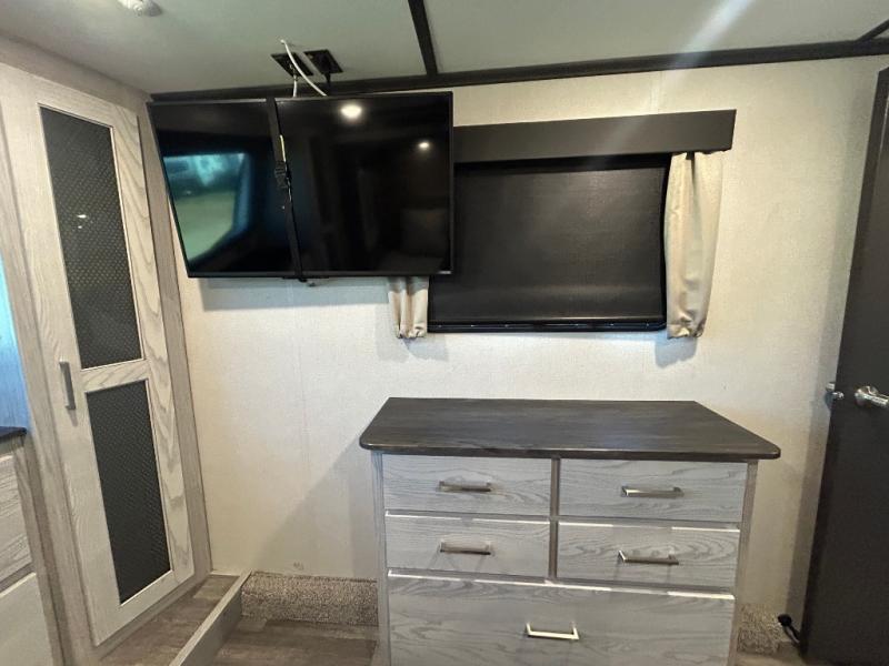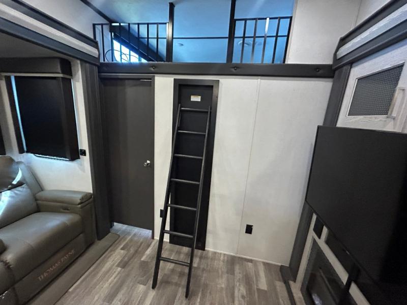 This unique layout allows you to enter into the front living area or straight into the rear private bunkhouse thanks to having two exterior entry/exit doors. The kids will have their own entry as well as bunk beds within a slide out, a half bath, and a wardrobe. There is a loft area above the bunkhouse that includes three bunk mats for more sleeping space. While the kids are playing, the adults can prepare dinner using the range with glass top, enjoy a cold drink together, and relax on the power theater seating. This kitchen is made complete with a center island, a coffee station, a pantry. Mom and dad will enjoy some privacy in the front master suite that includes a queen bed, access into the dual entry bath, and plenty of dresser and closet space for all their clothes.