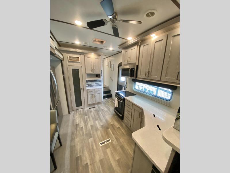 You'll be able to love this Montana High Country fifth wheel for years and years and years! The separated living room in the back feels just like your living room at home with its power theater seating, two hide-a-bed sofas, fireplace, and 50" LED Smart TV. The kitchen is also very residential with its three-burner range with glass top, residential microwave, residential refrigerator, pantry, and coffee station. When you enter this unit, there is a coat closet for you to place your boots and hats in, and for more clothing storage, just use the under-bed storage up in the private bedroom.