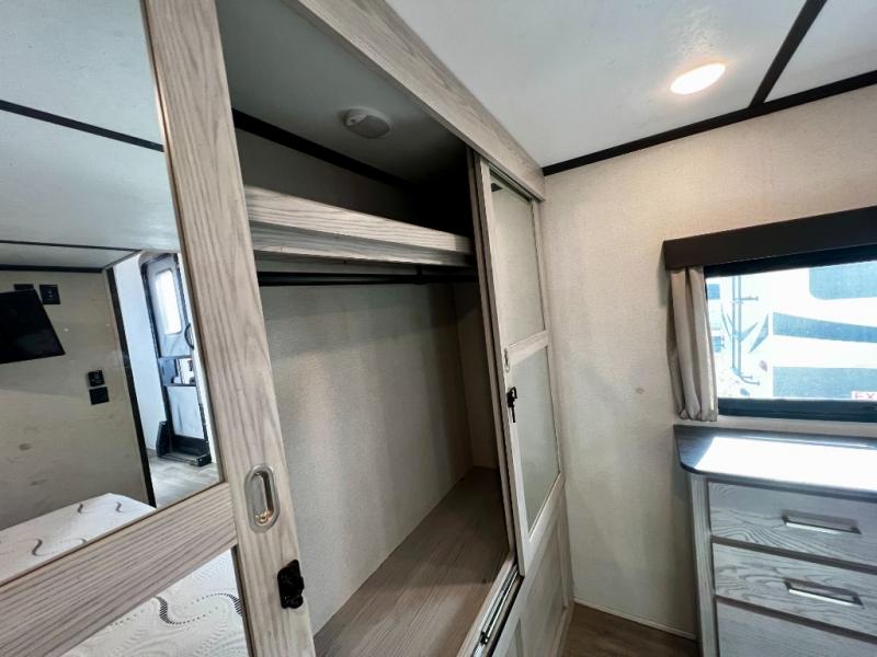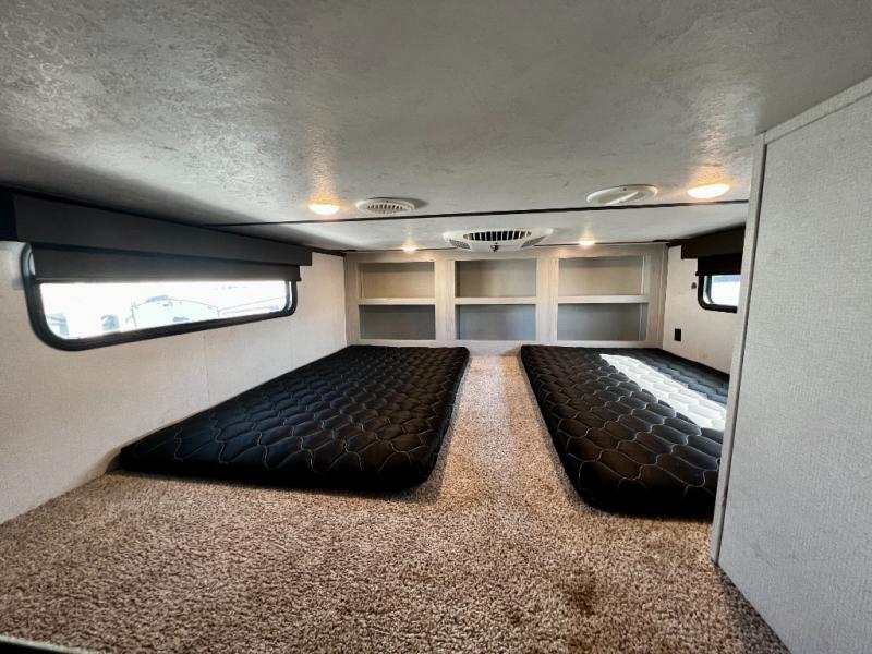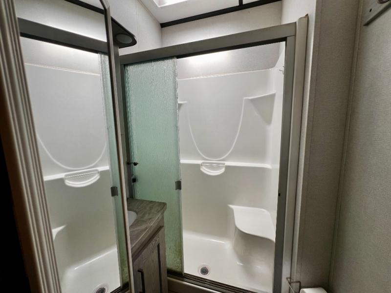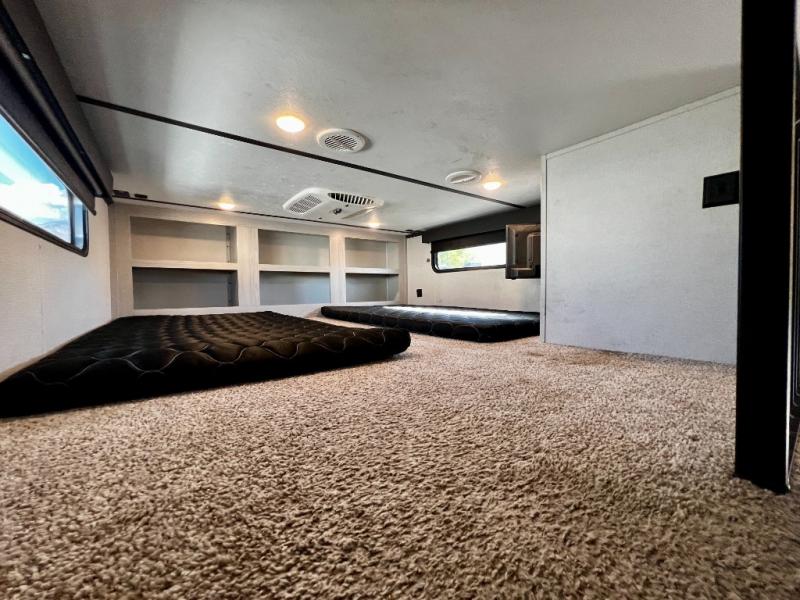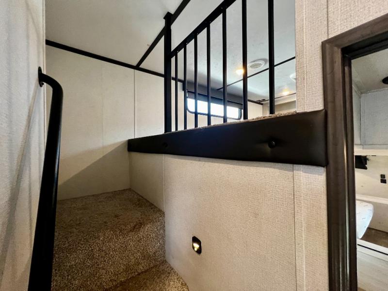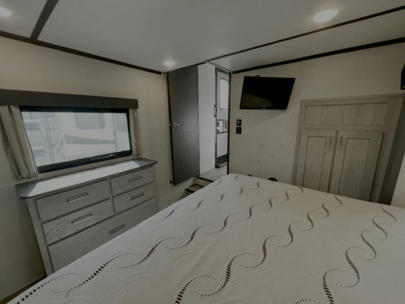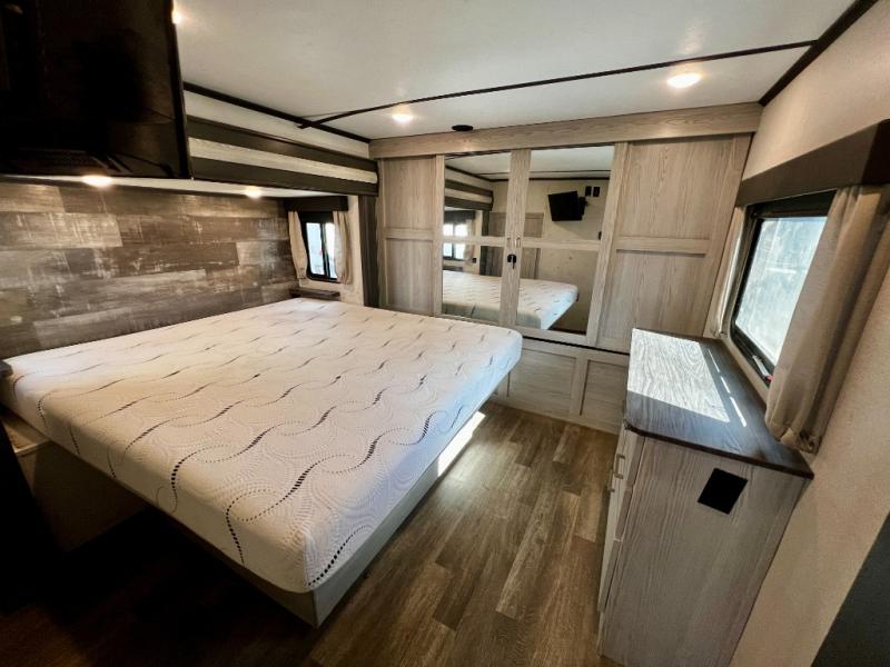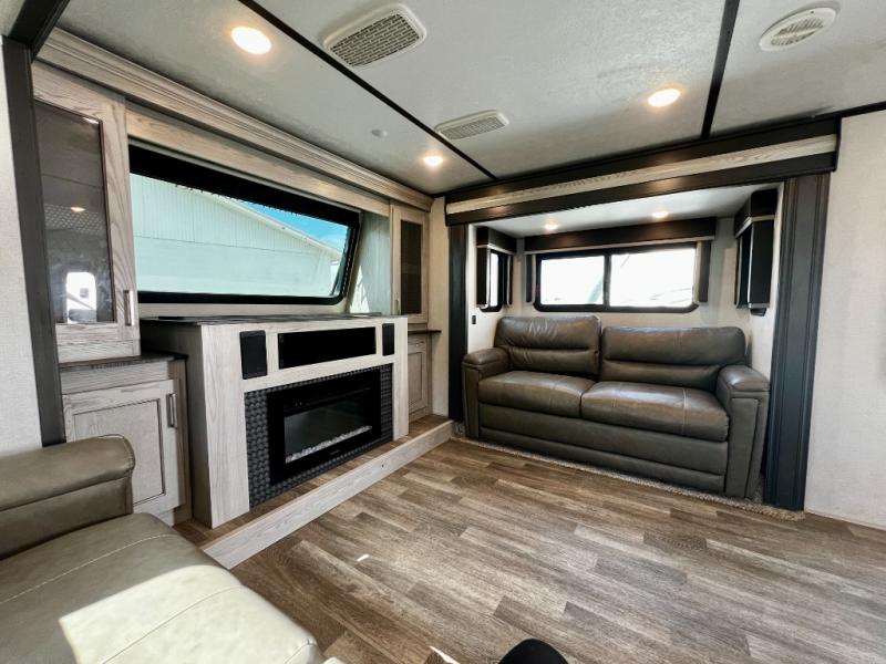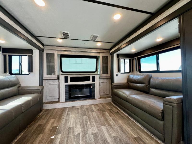 Your family will love this fifth wheel with a loft area over the rear master bedroom and the front living area which includes an entertainment center with a telescoping TV and a fireplace, a front windshield for great views, and dual opposing slides that open up the whole room for added comfort. Your guests can convert the two hide-a-bed sofas at night and you and your spouse will enjoy the rear private bedroom with a slide out queen bed. Let the chef of the family prepare breakfast on the three burner cooktop and the eggs and milk can go back in the 13 cu. ft. Dometic refrigerator. This model also features unique dual entry doors on opposite sides of the unit for added convenience, and you might like to add a few options such as a washer/dryer and a free-standing table with chairs.