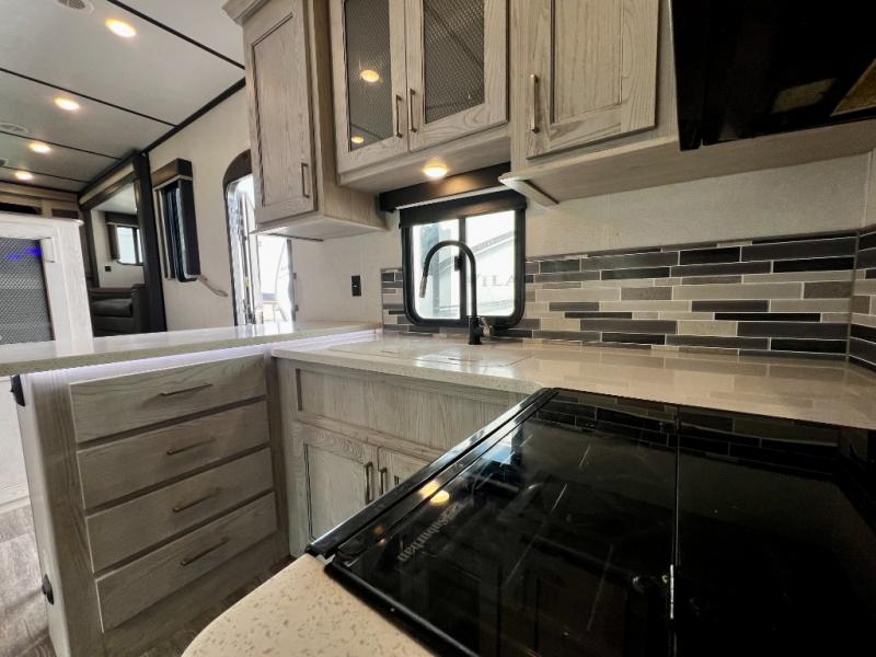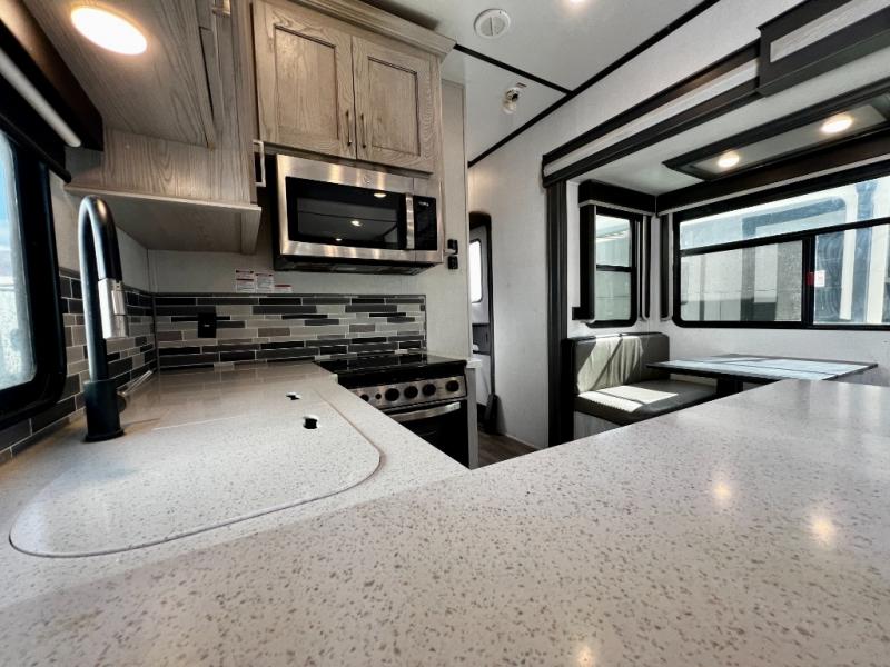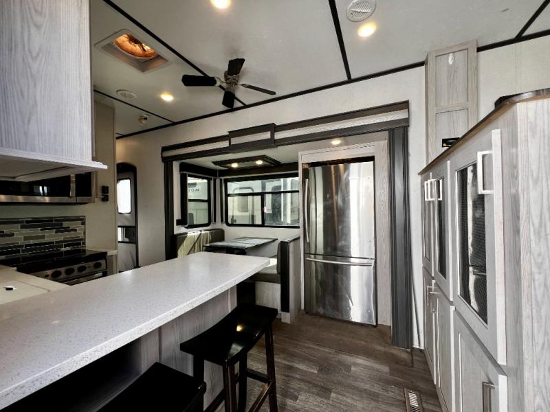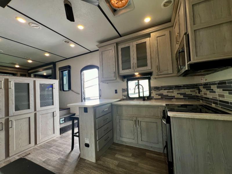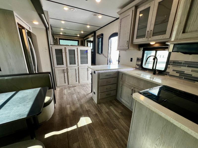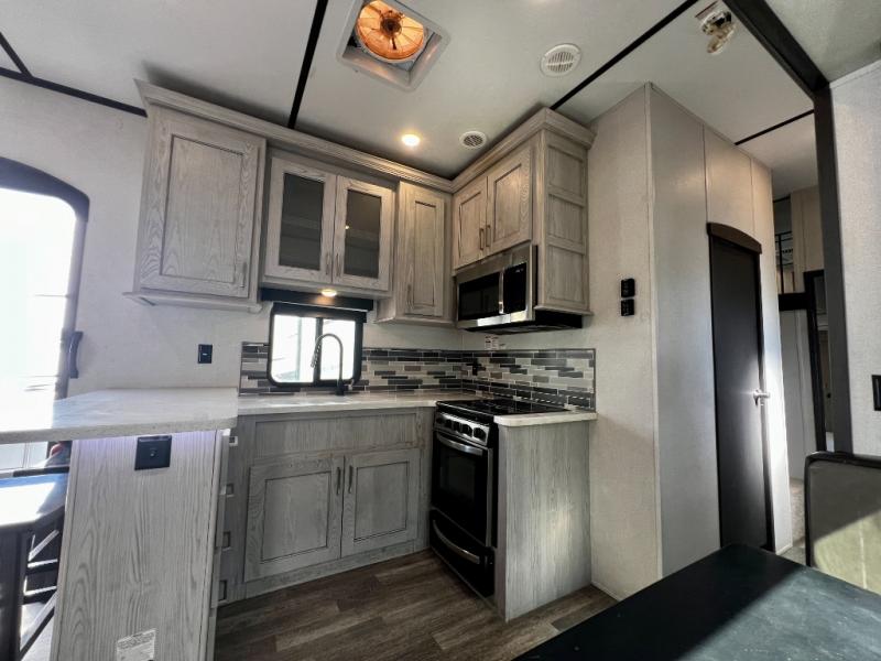 With each Montana High Country fifth wheel by Keystone you will enjoy family-friendly features, lightweight floorplans, and drop-frame construction for maximum storage. Each model is built for four season living with the heated and enclosed underbelly and the astrofoil insulated slide floors and underbelly. The Mystic Ash cabinetry, hardwood decorative slideout fascia, and accent crown molding create a luxurious fifth wheel everyone can get used to. These models include a Whisper Quiet A/C system to cool your space quietly and evenly, plus there is a 35,000 BTU furnace that will allow you to extend your camping season. The Montana High Country fifth wheels are equipped with a Road armor shock absorbing hitch pin for easy towing, and set-up will be a breeze with the Hitch Vision with LED lighting. There are many more features to love about these fifth wheels, like the MaxTurn front cap, the Solera series power awning(s), the residential appliances, and the list goes on!
