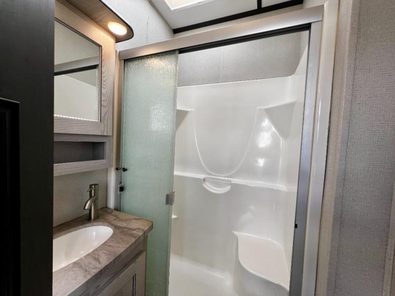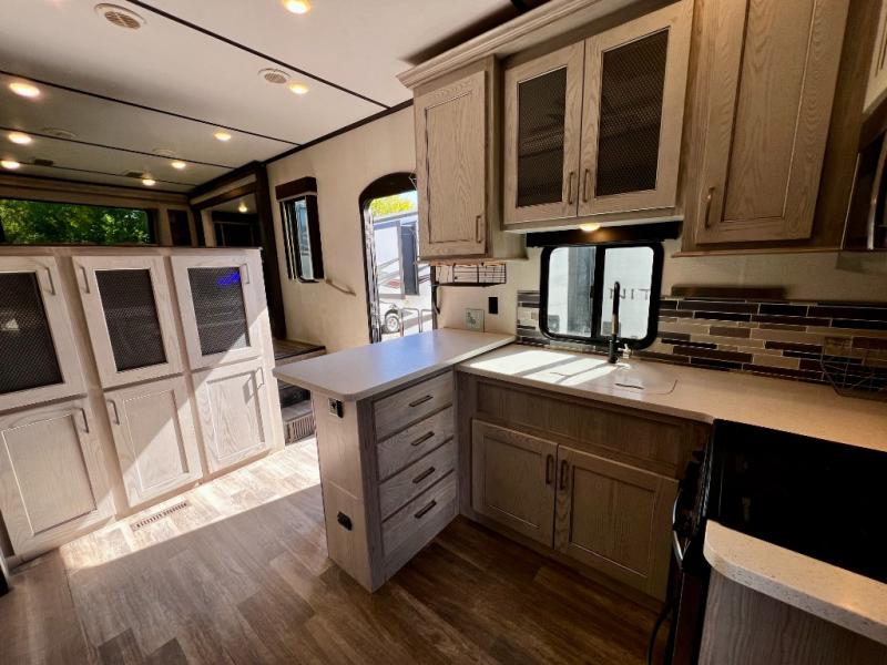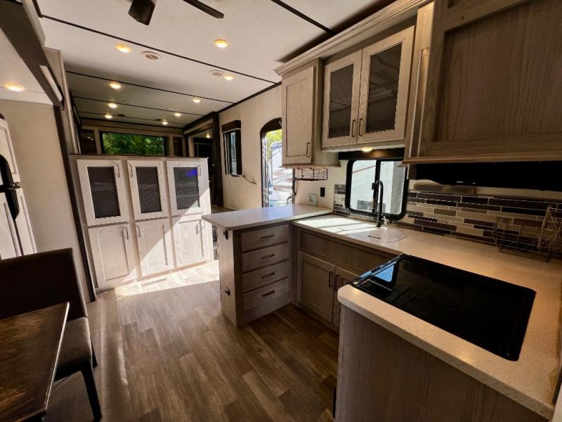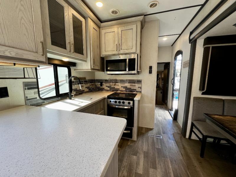 With each Montana High Country fifth wheel by Keystone you will enjoy family-friendly features, lightweight floorplans, and drop-frame construction for maximum storage. Each model is built for four season living with the heated and enclosed underbelly and the astrofoil insulated slide floors and underbelly. The Mystic Ash cabinetry, hardwood decorative slideout fascia, and accent crown molding create a luxurious fifth wheel everyone can get used to. These models include a Whisper Quiet A/C system to cool your space quietly and evenly, plus there is a 35,000 BTU furnace that will allow you to extend your camping season. The Montana High Country fifth wheels are equipped with a Road armor shock absorbing hitch pin for easy towing, and set-up will be a breeze with the Hitch Vision with LED lighting. There are many more features to love about these fifth wheels, like the MaxTurn front cap, the Solera series power awning(s), the residential appliances, and the list goes on!