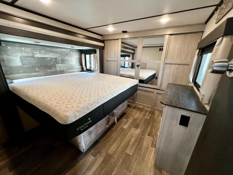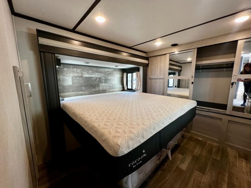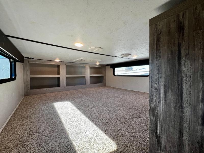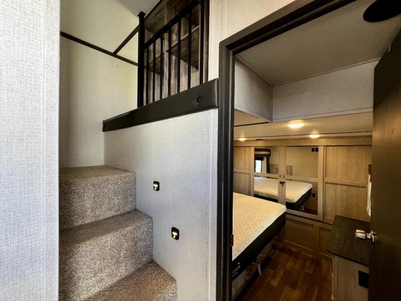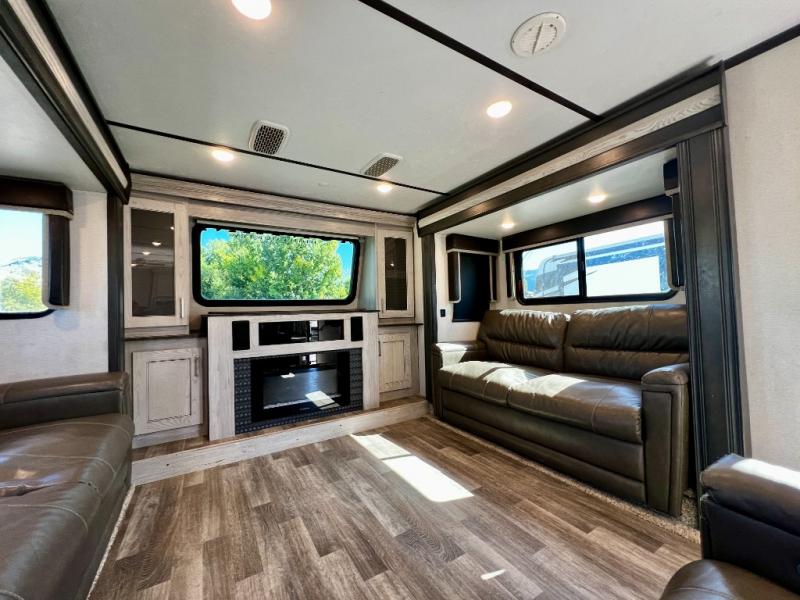 Your family will love this fifth wheel with a loft area over the rear master bedroom and the front living area which includes an entertainment center with a telescoping TV and a fireplace, a front windshield for great views, and dual opposing slides that open up the whole room for added comfort. Your guests can convert the two hide-a-bed sofas at night and you and your spouse will enjoy the rear private bedroom with a slide out queen bed. Let the chef of the family prepare breakfast on the three burner cooktop and the eggs and milk can go back in the 13 cu. ft. Dometic refrigerator. This model also features unique dual entry doors on opposite sides of the unit for added convenience, and you might like to add a few options such as a washer/dryer and a free-standing table with chairs.