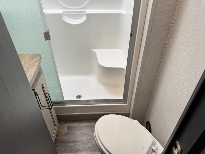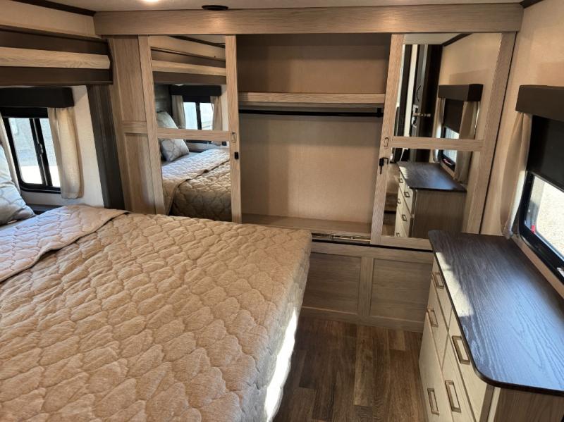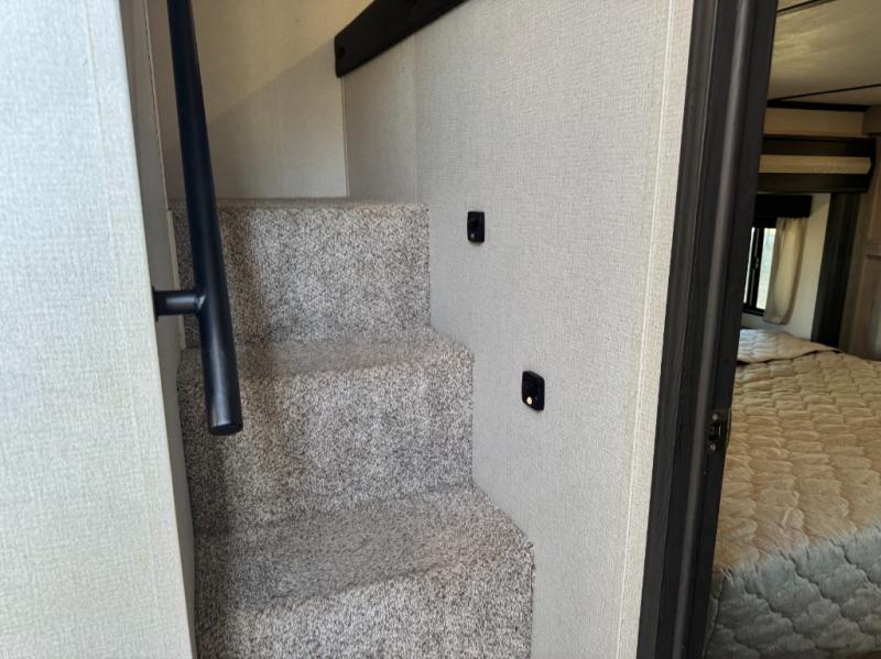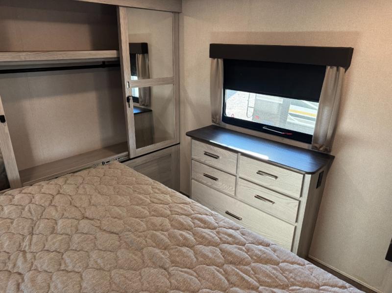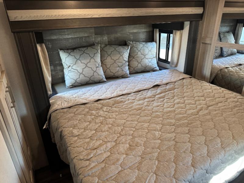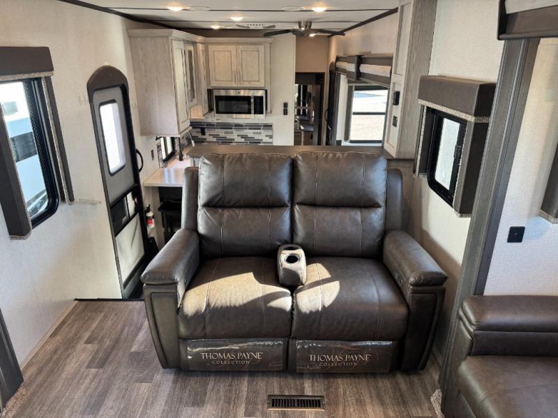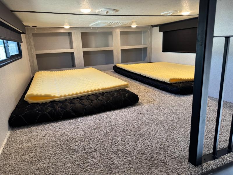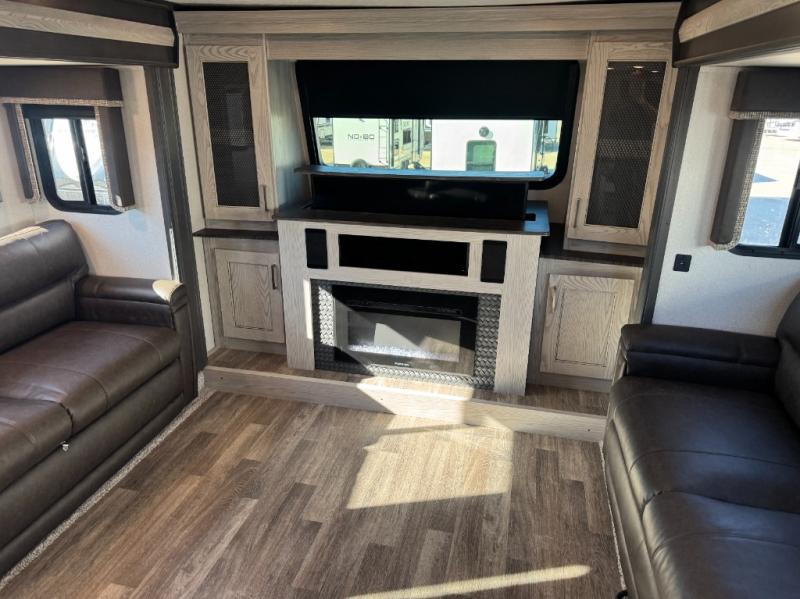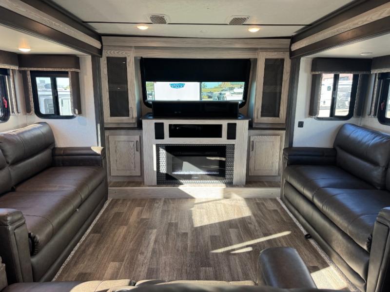 Your family will love this fifth wheel with a loft area over the rear master bedroom and the front living area which includes an entertainment center with a telescoping TV and a fireplace, a front windshield for great views, and dual opposing slides that open up the whole room for added comfort. Your guests can convert the two hide-a-bed sofas at night and you and your spouse will enjoy the rear private bedroom with a slide out queen bed. Let the chef of the family prepare breakfast on the three burner cooktop and the eggs and milk can go back in the residential refrigerator. This model also features unique dual entry doors on opposite sides of the unit for added convenience, and you might like to add a few options such as a washer/dryer and a free-standing table with chairs.