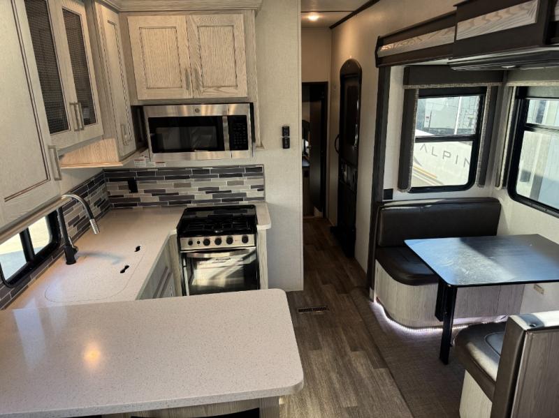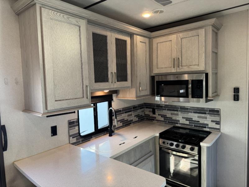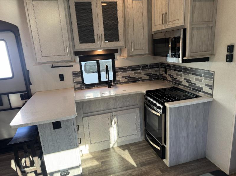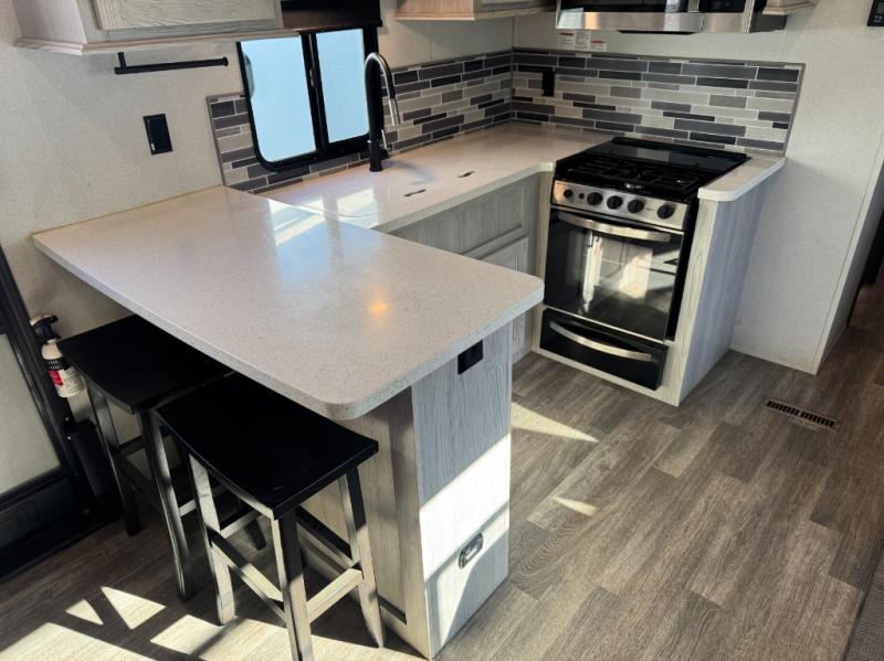 With each Montana High Country fifth wheel by Keystone you will enjoy family-friendly features, lightweight floorplans, and drop-frame construction for maximum storage. Each model is built for four season living with the heated and enclosed underbelly and the astrofoil insulated slide floors and underbelly. The Mystic Ash cabinetry, hardwood decorative slideout fascia, and accent crown molding create a luxurious fifth wheel everyone can get used to. These models include a Whisper Quiet A/C system to cool your space quietly and evenly, plus there is a 35,000 BTU furnace that will allow you to extend your camping season. The Montana High Country fifth wheels are equipped with a Road armor shock absorbing hitch pin for easy towing, and set-up will be a breeze with the Hitch Vision with LED lighting. There are many more features to love about these fifth wheels, like the MaxTurn front cap, the Solera series power awning(s), the residential appliances, and the list goes on!