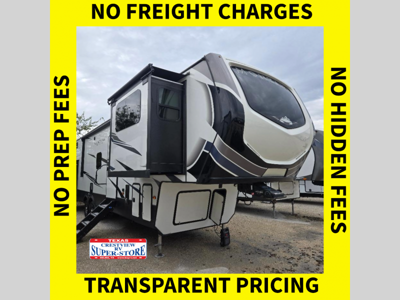 Your family will love this fifth wheel with a loft area over the rear master bedroom and the front living area which includes an entertainment center with a telescoping TV and a fireplace, a front windshield for great views, and dual opposing slides that open up the whole room for added comfort. Your guests can convert the two hide-a-bed sofas at night and you and your spouse will enjoy the rear private bedroom with a slide out queen bed. Let the chef of the family prepare breakfast on the three burner cooktop and the eggs and milk can go back in the residential refrigerator. This model also features unique dual entry doors on opposite sides of the unit for added convenience, and you might like to add a few options such as a washer/dryer and a free-standing table with chairs.