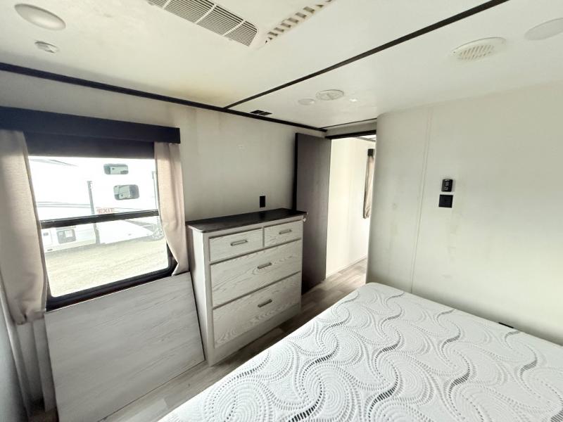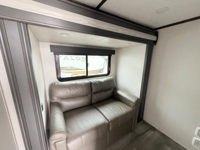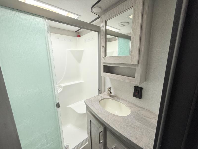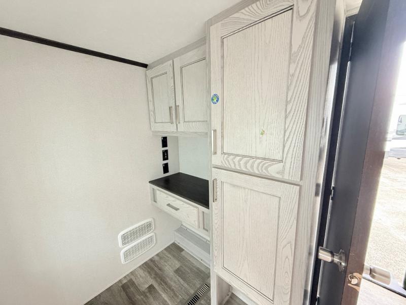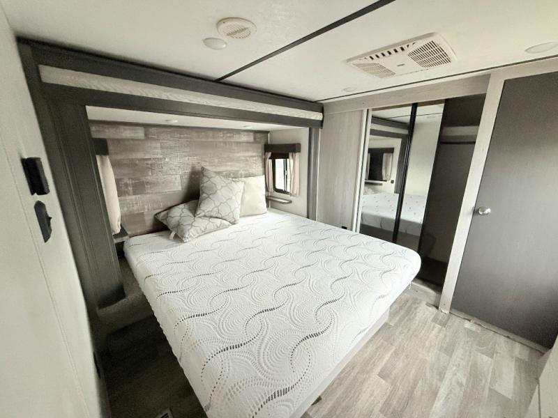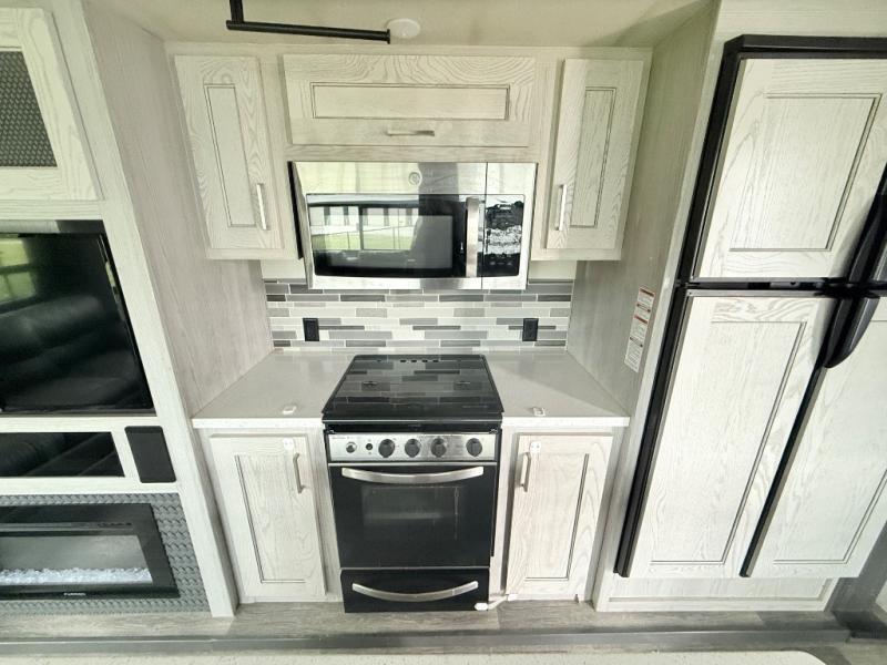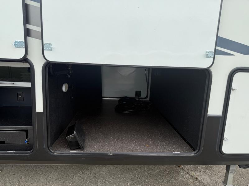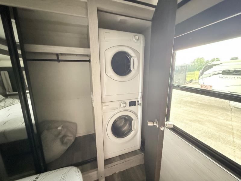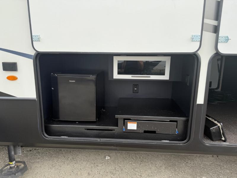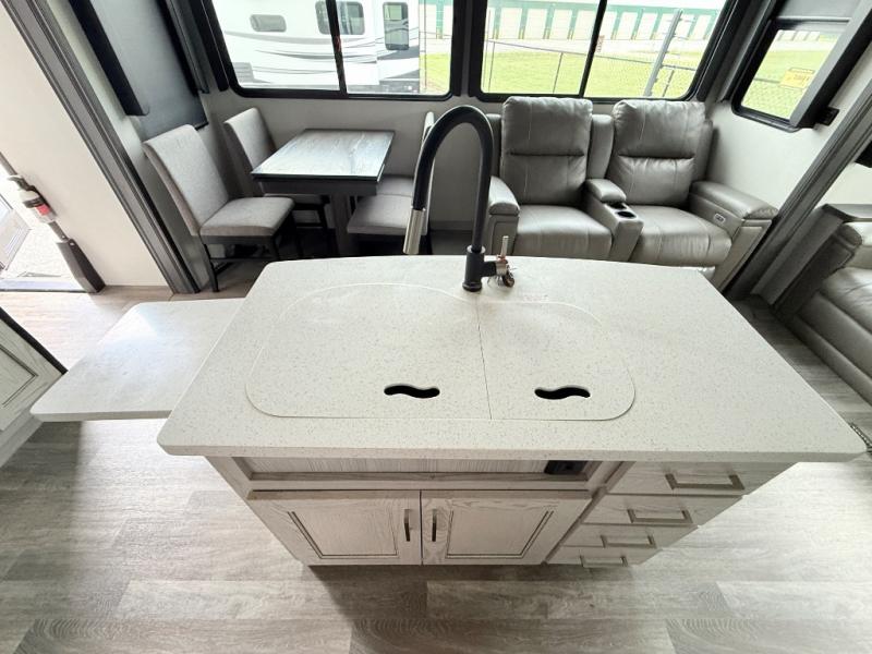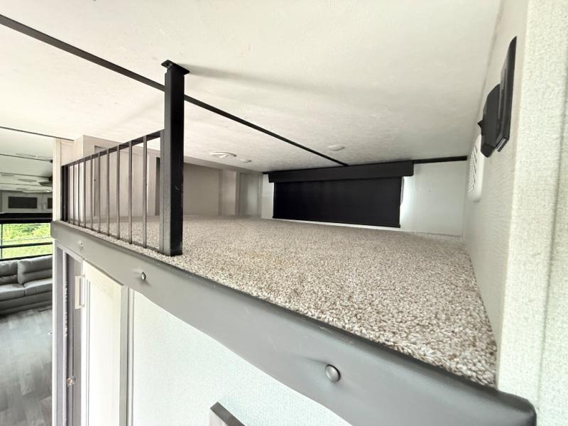 Having an extra room to be utilize as you wish makes living in your RV easy! This bonus room can be your office thanks to the desk, and an extra living space with sleeping space on the hide-a-bed sofa. You can utilize the loft area for storage or more sleeping space. The chef of the family can prepare breakfast on the three burner cooktop or use the handy residential microwave, and the outdoor kitchen will be great for making dinner in the evening. The hide-a-bed sofa in the rear living area along with the power theater seating and booth dinette allow you to relax after a day of hiking or biking and the full bath includes a shower with a seat to easily clean up.