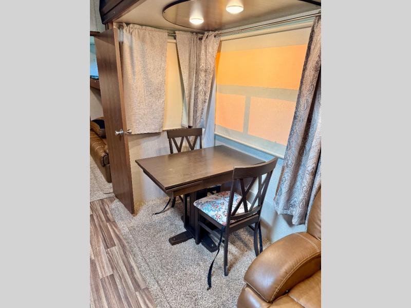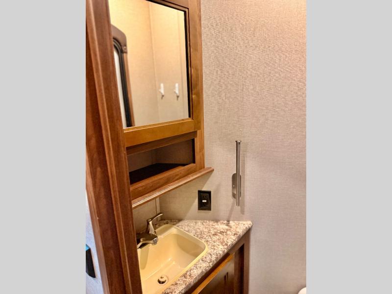 Having an extra room to be utilize as you wish makes living in your RV easy! This bonus room can be your office thanks to the desk, and an extra living space with sleeping space on the hide-a-bed sofa. You can utilize the loft area for storage or more sleeping space. The chef of the family can prepare breakfast on the three burner cooktop or use the handy residential microwave, and the outdoor kitchen will be great for making dinner in the evening. The hide-a-bed sofa in the rear living area along with the power theater seating and booth dinette allow you to relax after a day of hiking or biking and the full bath includes a shower with a seat to easily clean up.