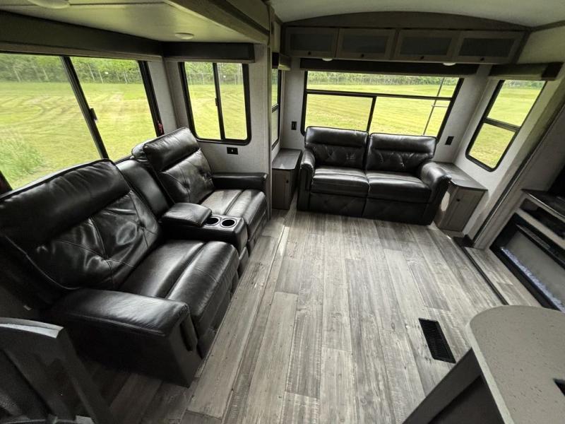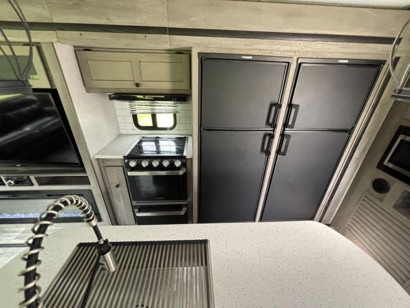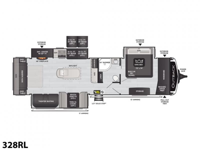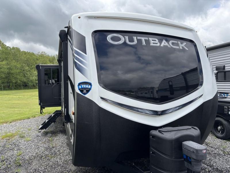When you're ready to tour the countryside in style, choose this Outback travel trailer. From the sofa sleeper, theater seating and fireplace in the rear living area to the vaulted ceiling and large panoramic windows, you will feel the elegance from the moment you step foot into this unit. You will love spending your evenings in the private master suite because of the comfort and relaxation found in the king-size bed slide, and the full-wall wardrobe will easily hold all of the garments and toiletries that you have brought along with you. You can even choose to add a washer/dryer option, and your family friend will love the built-in pet kennel. And the chef will love the kitchen with an island, a skylight adding more natural lighting, extra counter space to serve meals, and two refrigerators!