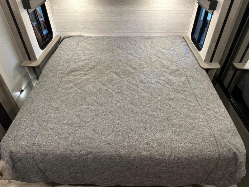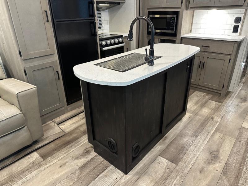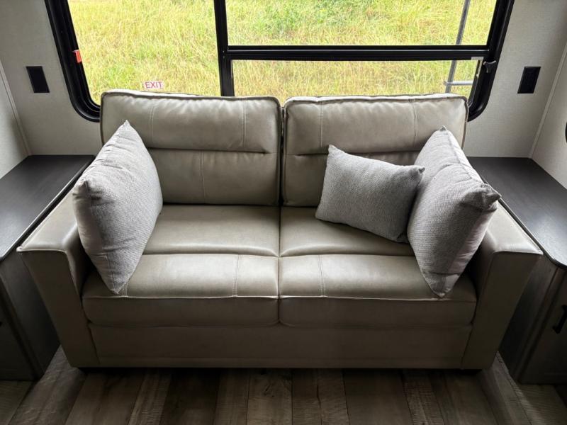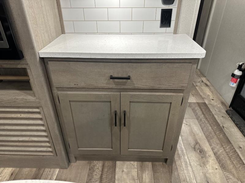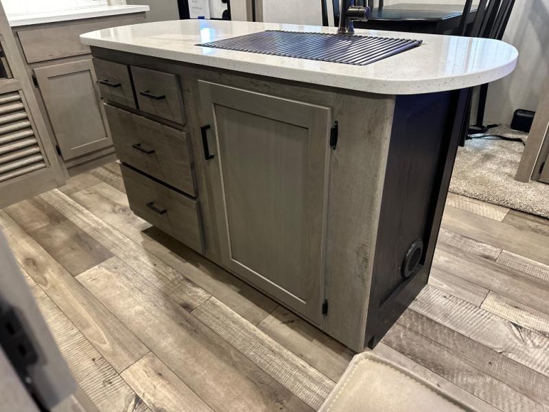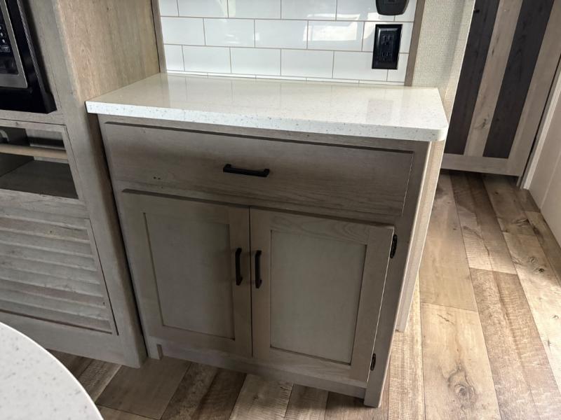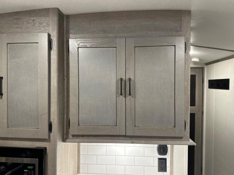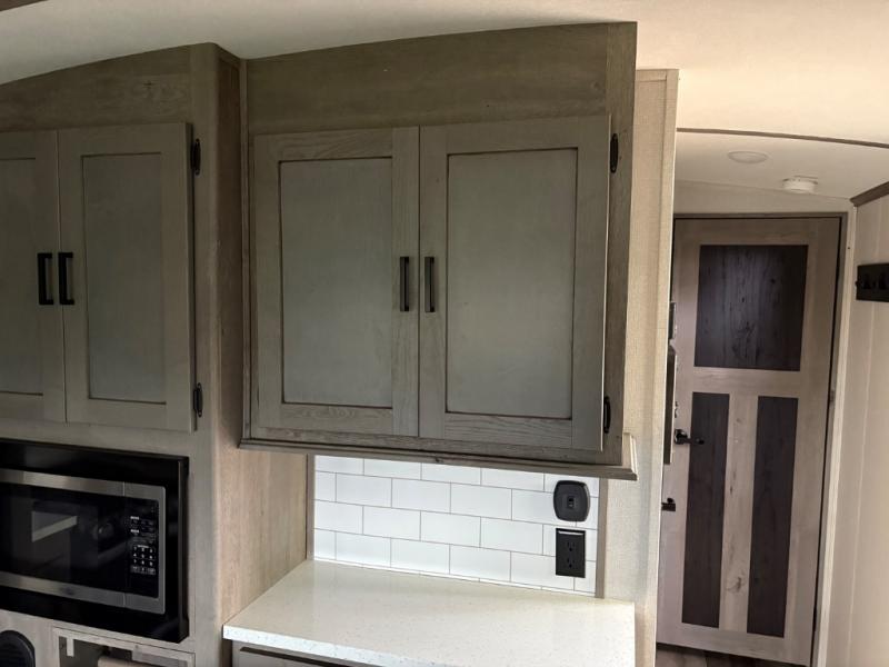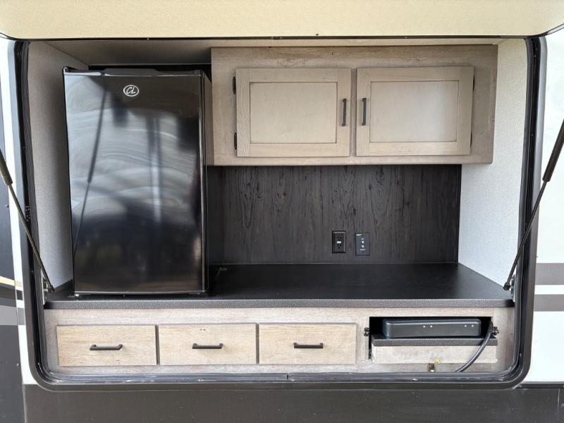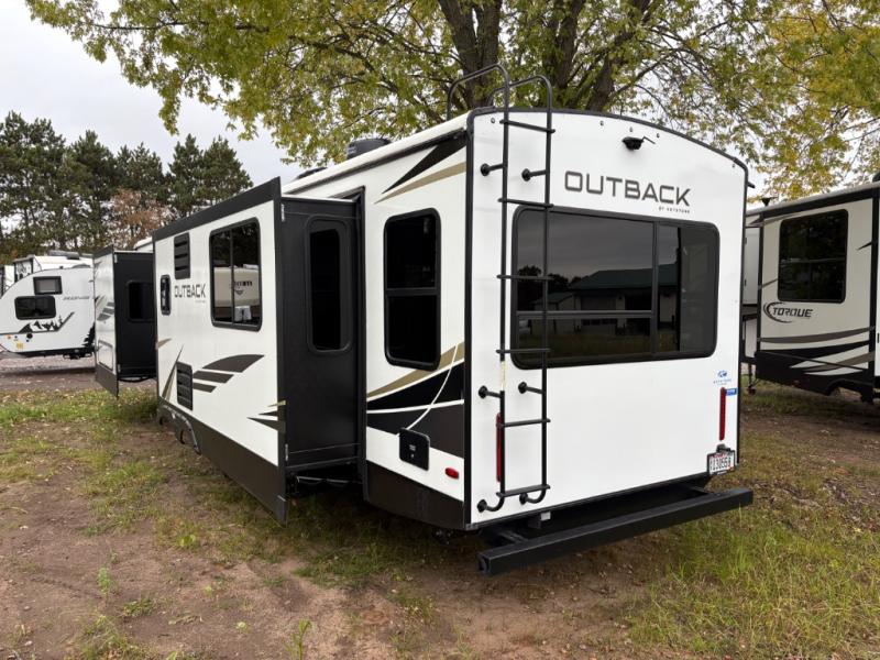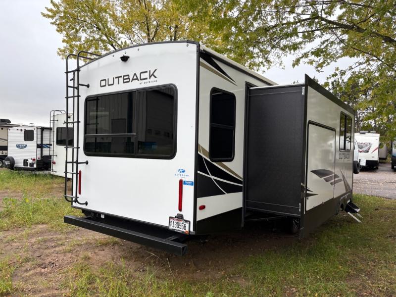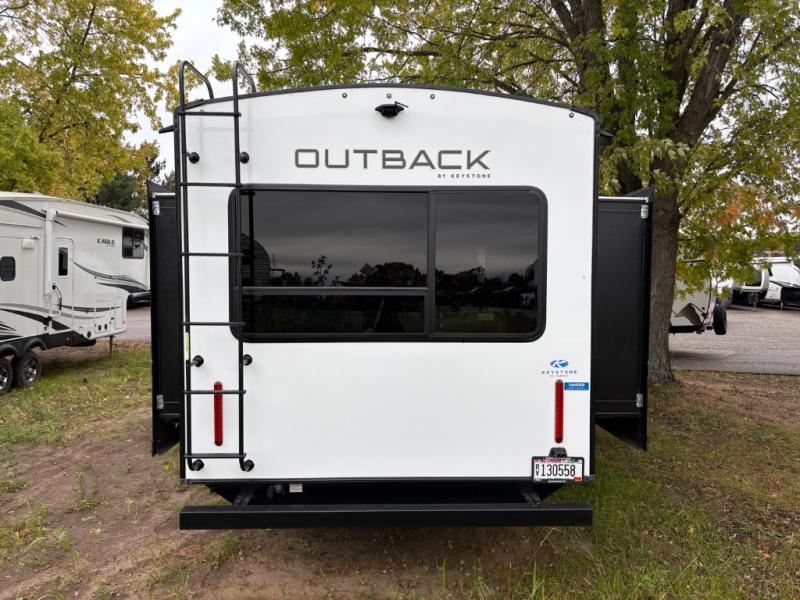 With any Keystone Outback travel trailer and toy hauler you will enjoy a lighter wallboard and white countertops for the modern farmhouse feel with more refined flooring, furniture, and cabinet hardware. You can extend your camping season thanks to the Astro-foil barrier added to the fully enclosed underbelly with ducted heat, the Coleman-Mach Quiet Series A/C offering a significant reduction of in-cabin sound levels, and an upgraded 10 cu. ft. 12V GE refrigerator to mention a few notables. The Lippert Step Above entry steps, the water docking station, the rear ladder, and the HyperDeck high performance, water-resistant RV floor are a few more reasons you will want to own an Outback for years to come!