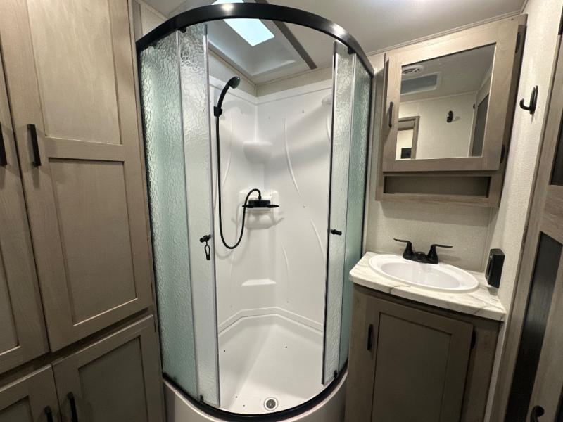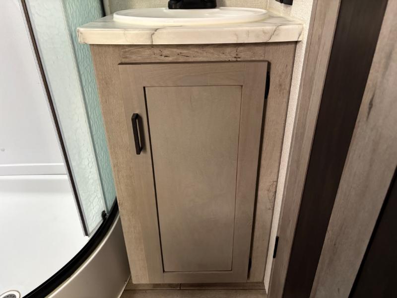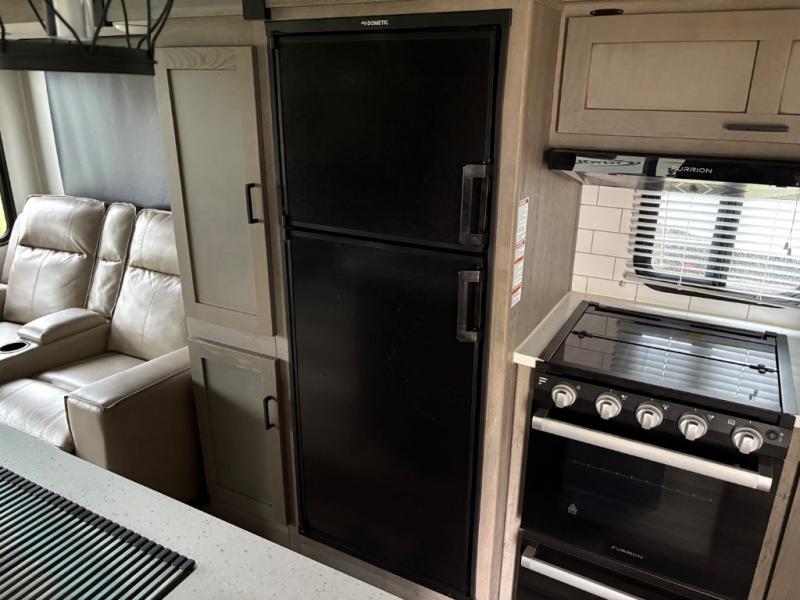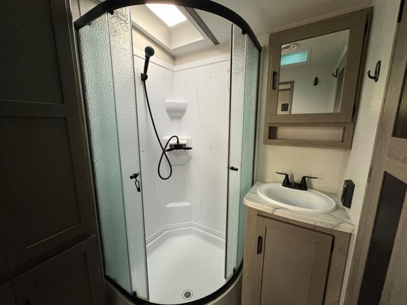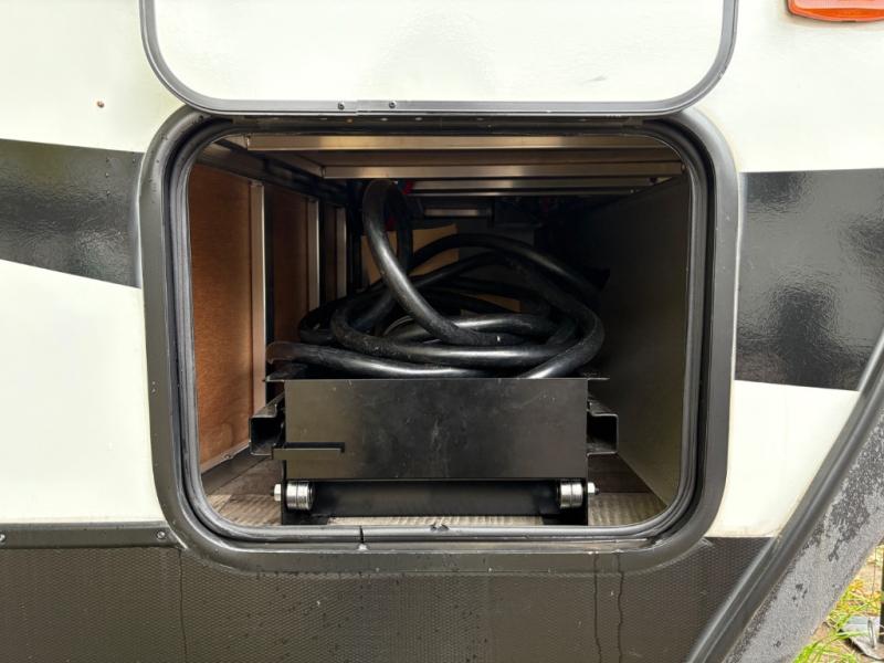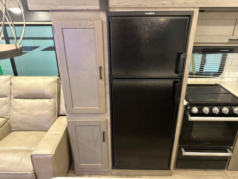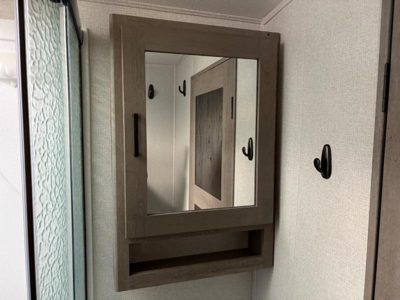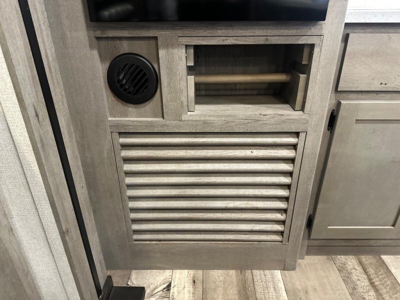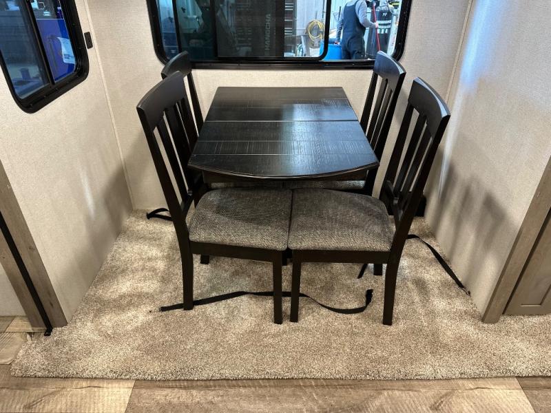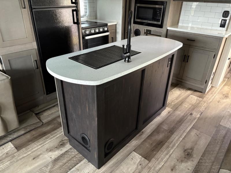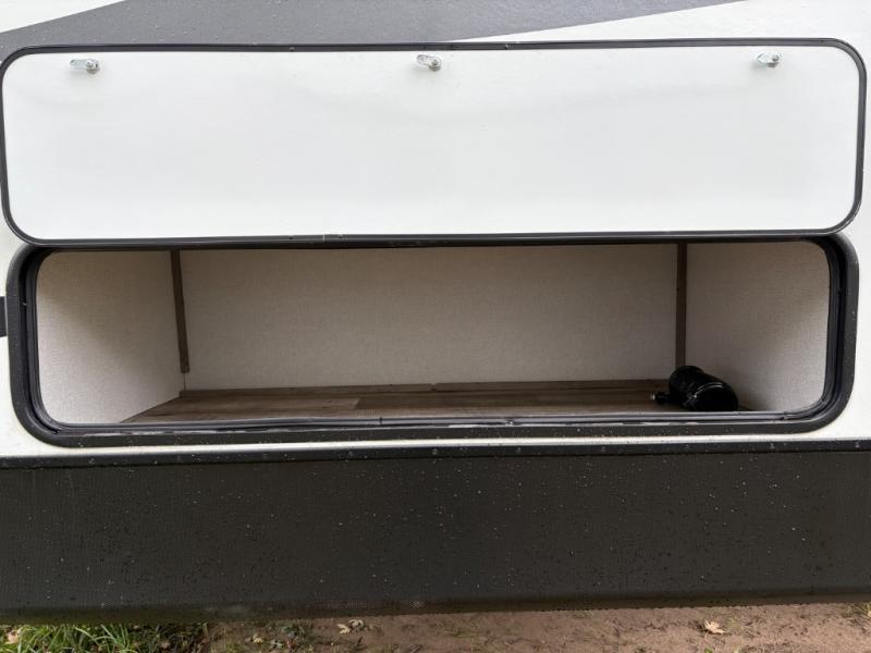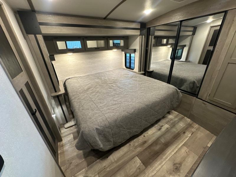 With any Keystone Outback travel trailer and toy hauler you will enjoy a lighter wallboard and white countertops for the modern farmhouse feel with more refined flooring, furniture, and cabinet hardware. You can extend your camping season thanks to the Astro-foil barrier added to the fully enclosed underbelly with ducted heat, the Coleman-Mach Quiet Series A/C offering a significant reduction of in-cabin sound levels, and an upgraded 10 cu. ft. 12V GE refrigerator to mention a few notables. The Lippert Step Above entry steps, the water docking station, the rear ladder, and the HyperDeck high performance, water-resistant RV floor are a few more reasons you will want to own an Outback for years to come!