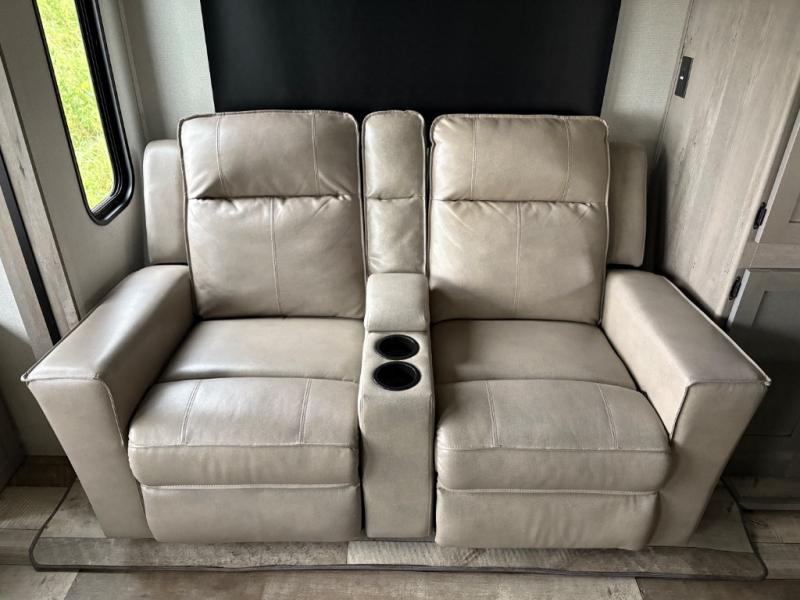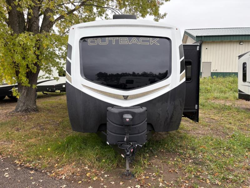 Take your camping expeditions to the next level with this Outback travel trailer! Your family's master chef will appreciate all of the appliances that have been included in both the indoor and outdoor kitchen, like the pantry, the three-burner range top, the kitchen island, and the double door refrigerator. The large skylight located above the island will brighten up the interior with the sun's rays during the day and will allow the glow from the moon to illuminate the space at night. For a comfortable place to spend your evenings, you will love your own king-size bed slide in the private master suite while your guests or kids sleep on the sofa sleeper and booth dinette and someone might even try to sleep on the theater seats. There are options to choose from such an 8 cu. ft. refrigerator in place of the 10 cu. ft. refrigerator and/or a table and chairs in place of the booth dinette.