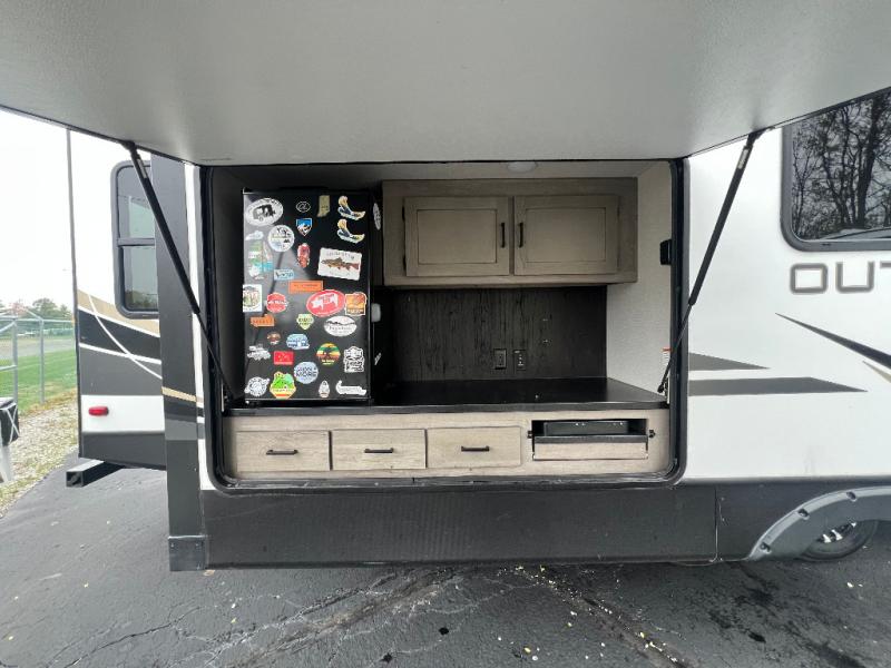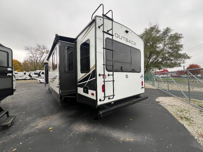 Take your camping expeditions to the next level with this Outback travel trailer! Your family's master chef will appreciate all of the appliances that have been included in both the indoor and outdoor kitchen, like the pantry, the three-burner range top, the kitchen island, and the double door refrigerator. The large skylight located above the island will brighten up the interior with the sun's rays during the day and will allow the glow from the moon to illuminate the space at night. For a comfortable place to spend your evenings, you will love your own king-size bed slide in the private master suite while your guests or kids sleep on the sofa sleeper and booth dinette and someone might even try to sleep on the theater seats. There are options to choose from such an 8 cu. ft. refrigerator in place of the 10 cu. ft. refrigerator and/or a table and chairs in place of the booth dinette.