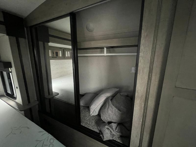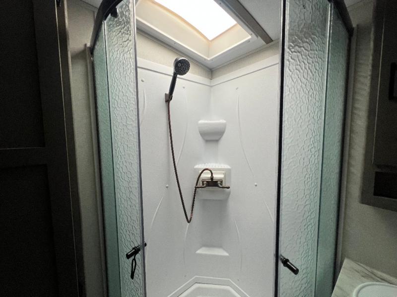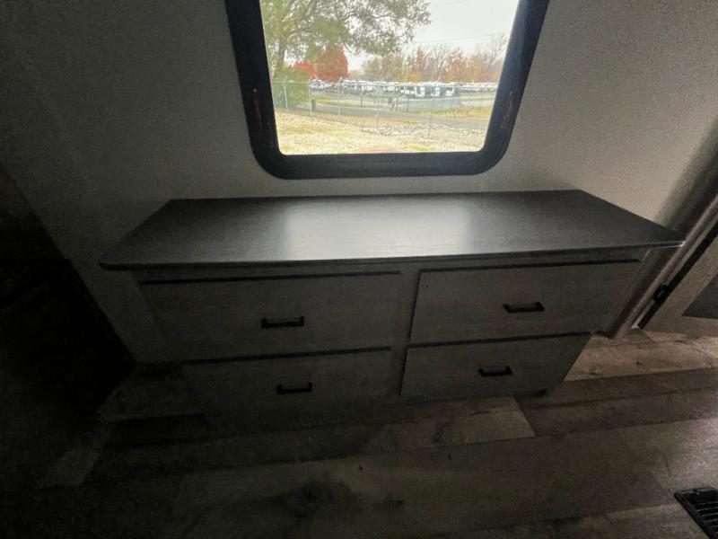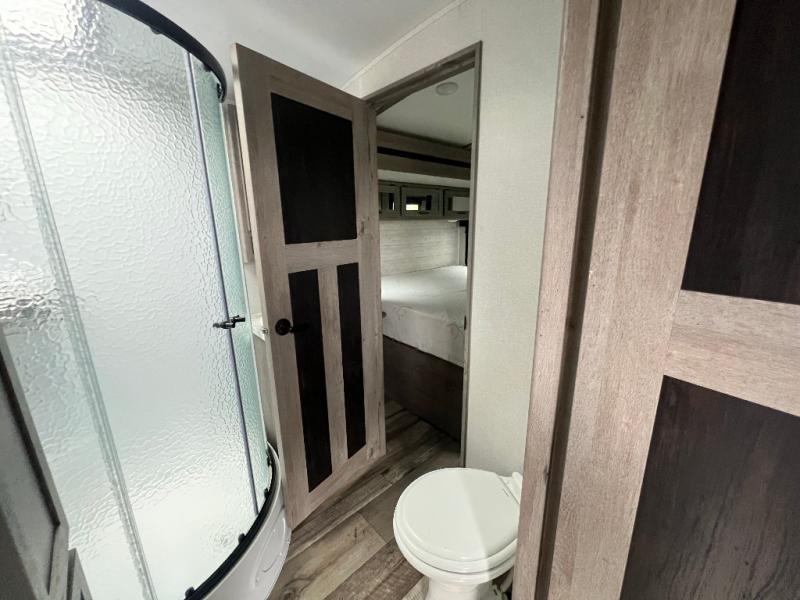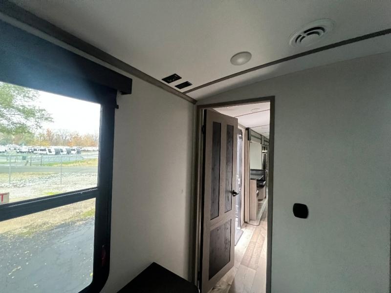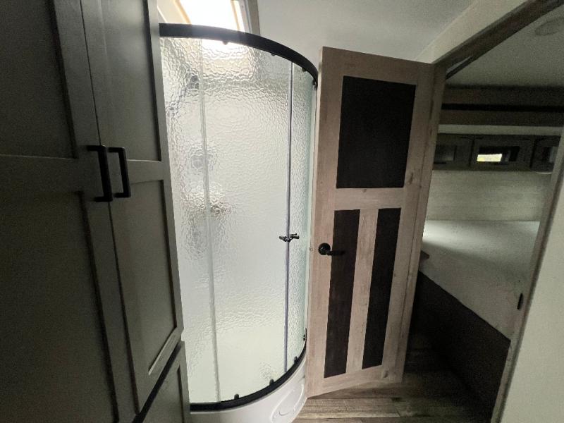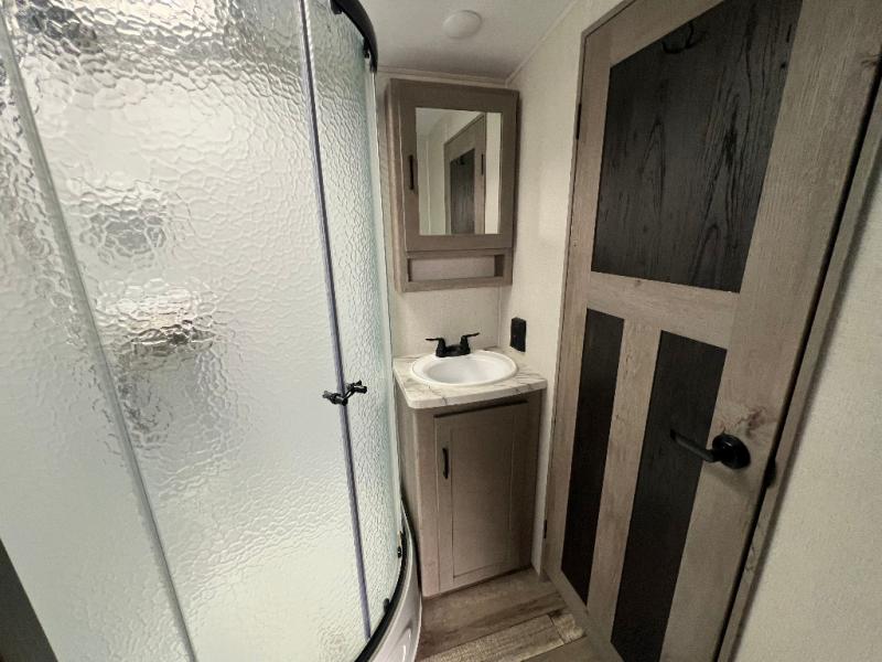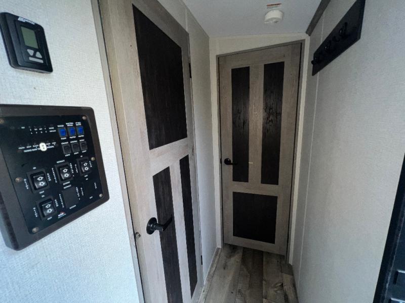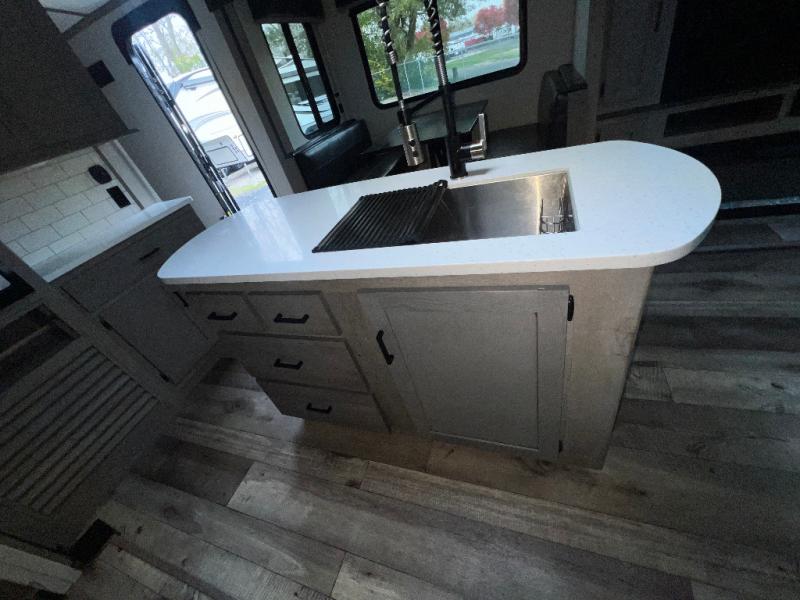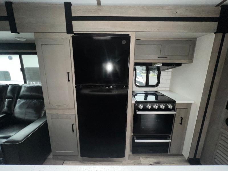 With any Keystone Outback travel trailer and toy hauler you will enjoy a lighter wallboard and white countertops for the modern farmhouse feel with more refined flooring, furniture, and cabinet hardware. You can extend your camping season thanks to the Astro-foil barrier added to the fully enclosed underbelly with ducted heat, the Coleman-Mach Quiet Series A/C offering a significant reduction of in-cabin sound levels, and an upgraded 10 cu. ft. 12V GE refrigerator to mention a few notables. The Lippert Step Above entry steps, the water docking station, the rear ladder, and the HyperDeck high performance, water-resistant RV floor are a few more reasons you will want to own an Outback for years to come!
