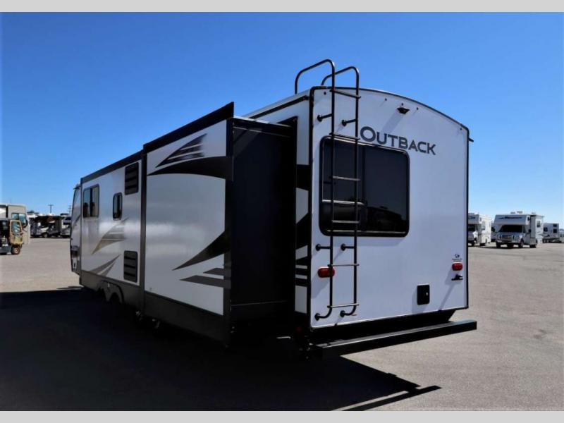 Let this Outback travel trailer be your family's new favorite vacation destination! Whether it is in the rear private bunkhouse or in the front private bedroom, you will find plenty of space to sleep nine to ten people throughout this trailer, and because this unit comes with a built-in kennel, you will also have plenty of space for your pet to feel comfortable while you travel. With the three slides that have been included in this model, you will be able to rest easily in the central living area on the sofa sleeper or booth dinette while you charge your computer or cell phone at the power station. The cook will love having the choice of cooking indoors or outdoors, and you will have the choice of adding an option or two such as a different size refrigerator, theater seating in place of the sofa, and there is more.