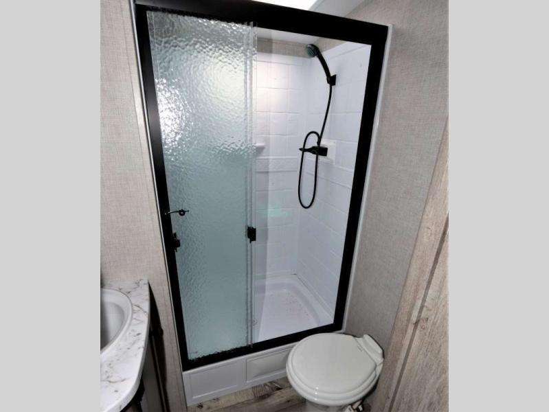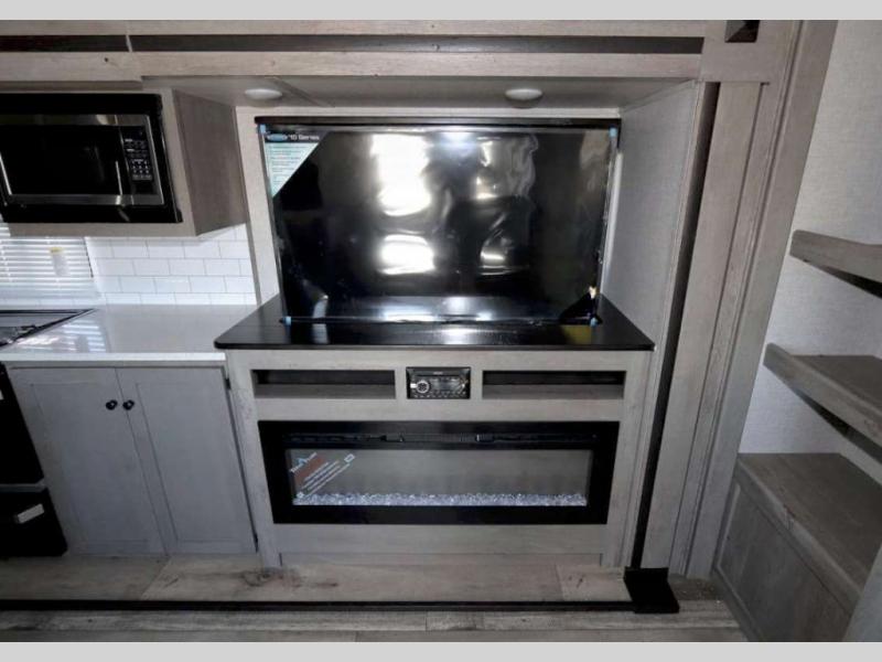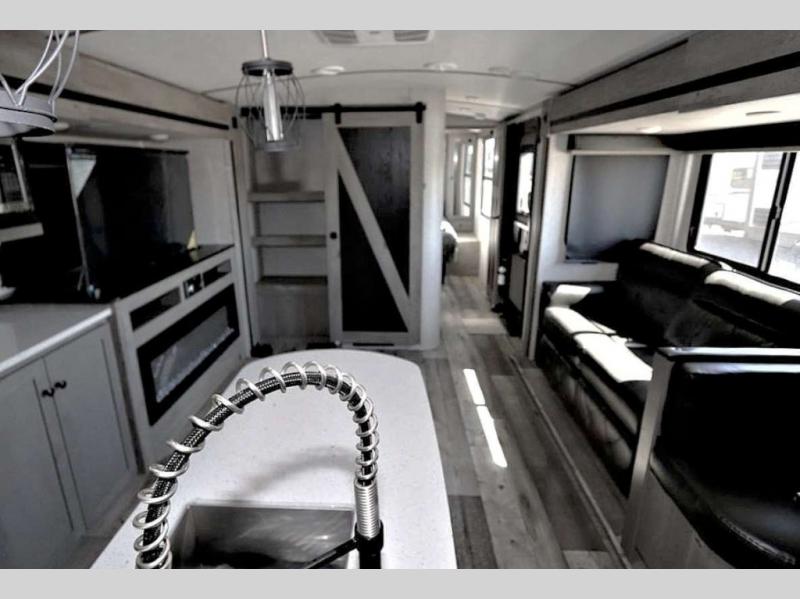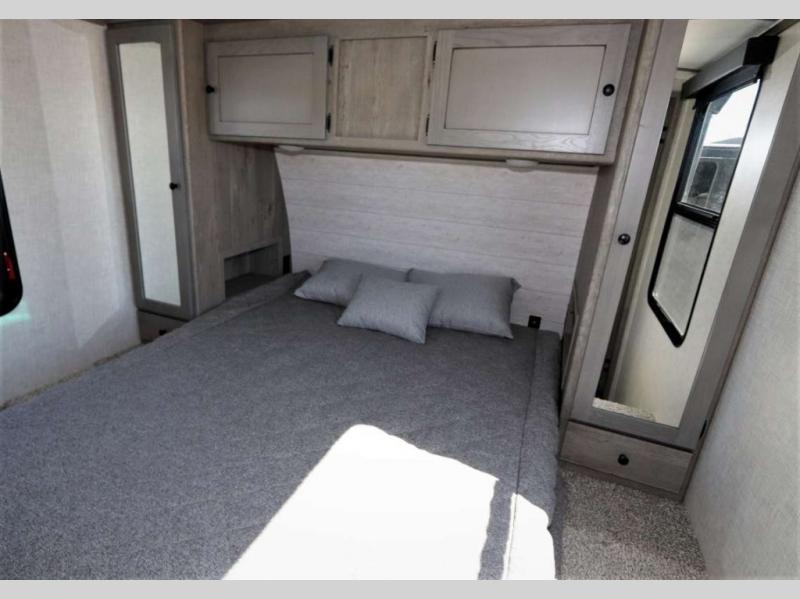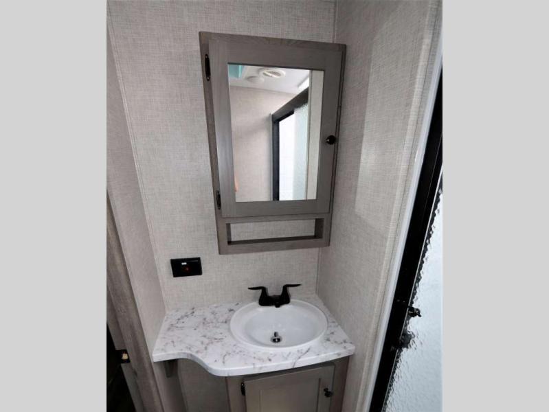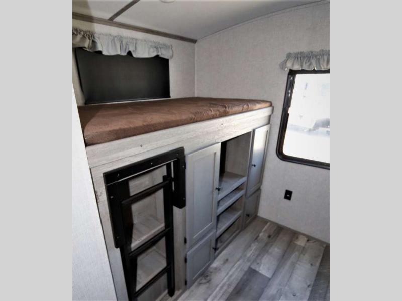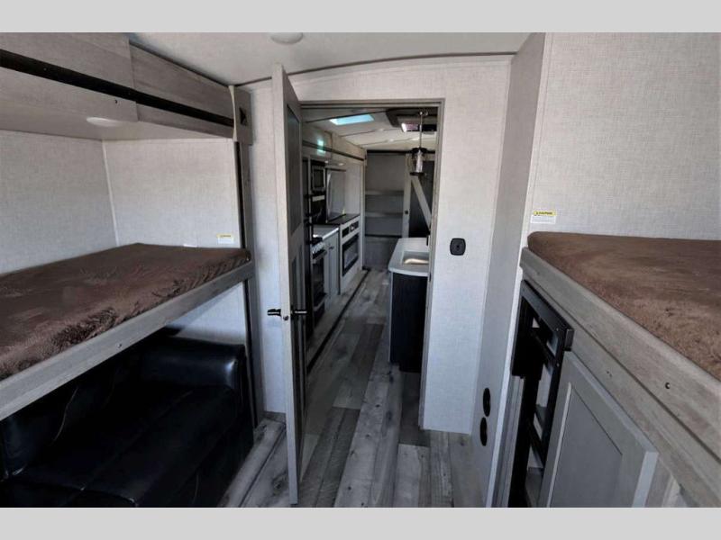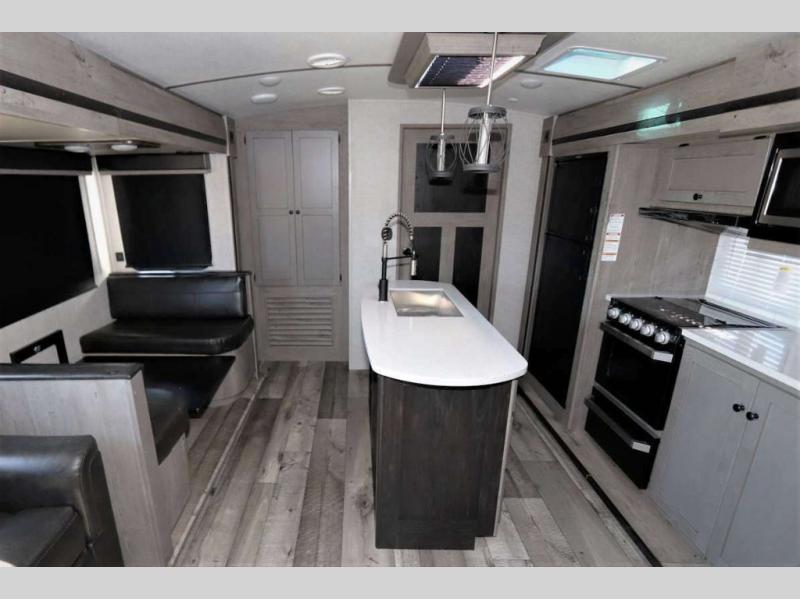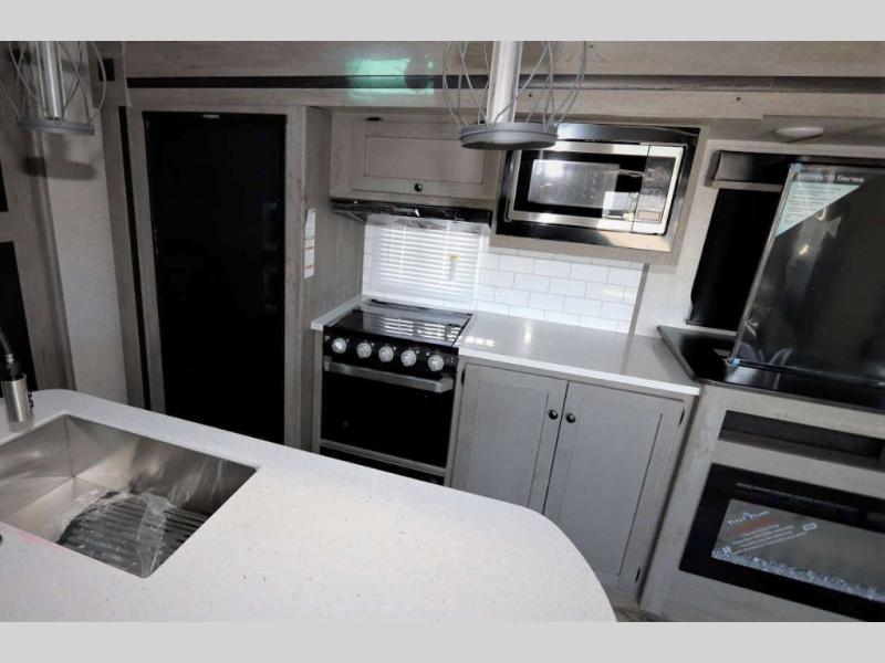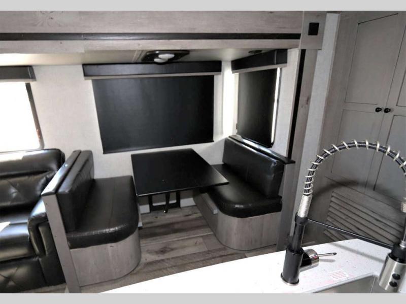 With any Keystone Outback travel trailer and toy hauler you will enjoy a lighter wallboard and white countertops for the modern farmhouse feel with more refined flooring, furniture, and cabinet hardware. You can extend your camping season thanks to the Astro-foil barrier added to the fully enclosed underbelly with ducted heat, the Coleman-Mach Quiet Series A/C offering a significant reduction of in-cabin sound levels, and an upgraded 10 cu. ft. 12V GE refrigerator to mention a few notables. The Lippert Step Above entry steps, the water docking station, the rear ladder, and the HyperDeck high performance, water-resistant RV floor are a few more reasons you will want to own an Outback for years to come!