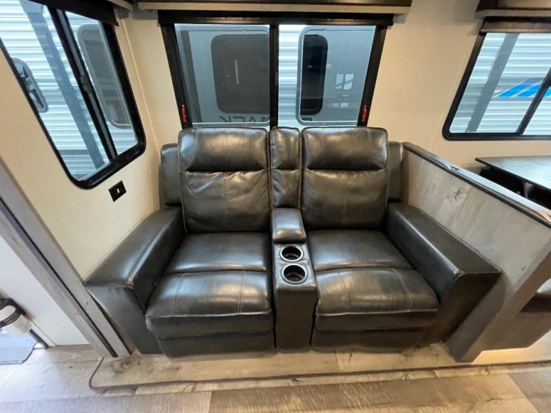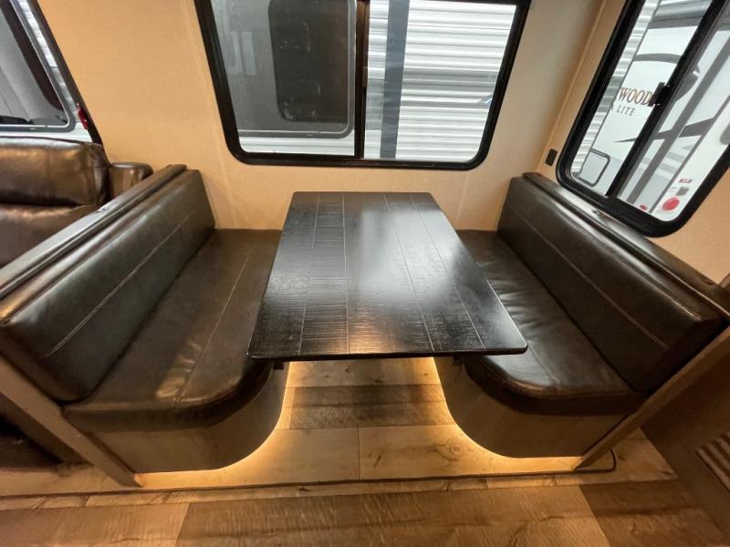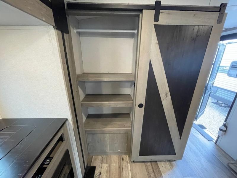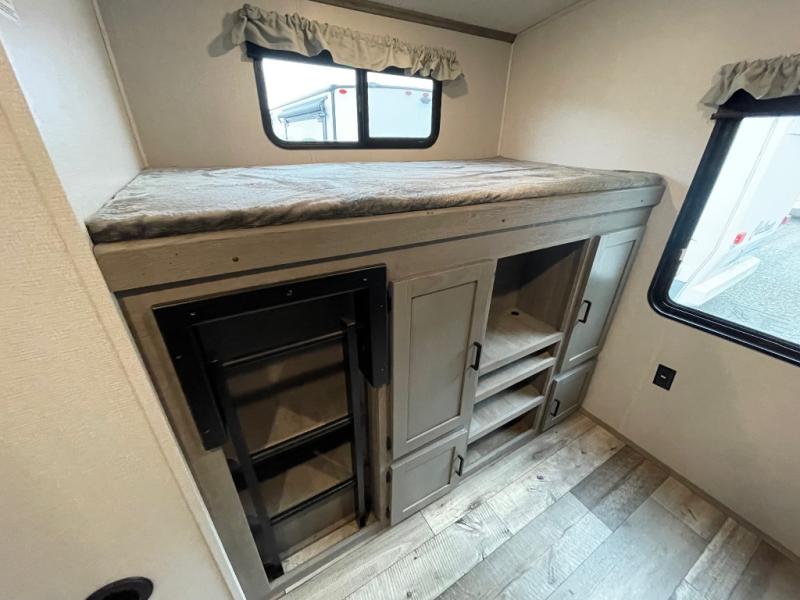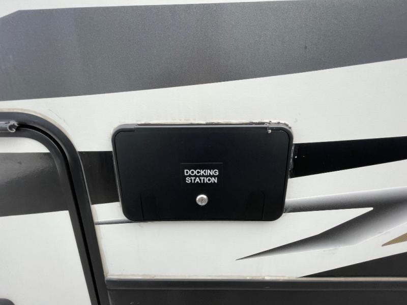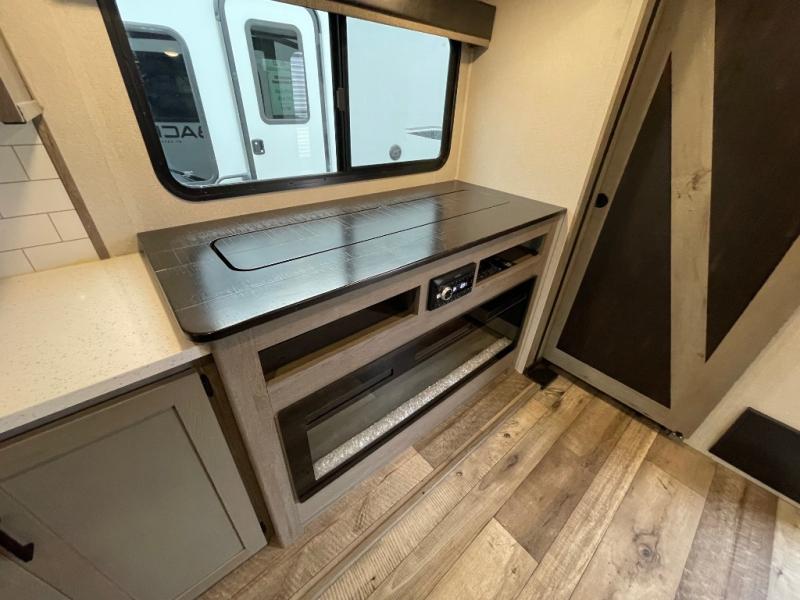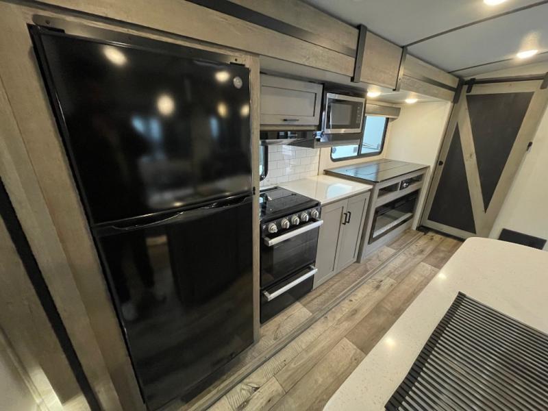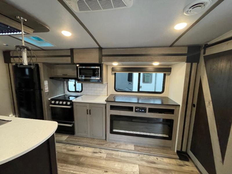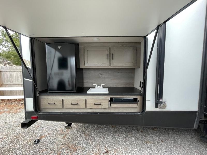 With any Keystone Outback travel trailer and toy hauler you will enjoy a lighter wallboard and white countertops for the modern farmhouse feel with more refined flooring, furniture, and cabinet hardware. You can extend your camping season thanks to the Astro-foil barrier added to the fully enclosed underbelly with ducted heat, the Coleman-Mach Quiet Series A/C offering a significant reduction of in-cabin sound levels, and an upgraded 10 cu. ft. 12V GE refrigerator to mention a few notables. The Lippert Step Above entry steps, the water docking station, the rear ladder, and the HyperDeck high performance, water-resistant RV floor are a few more reasons you will want to own an Outback for years to come!
