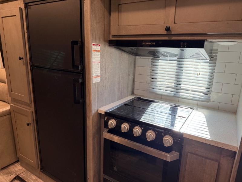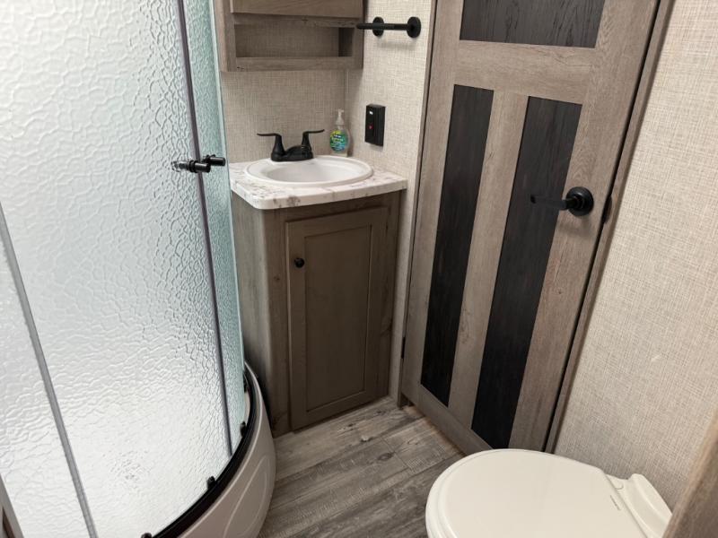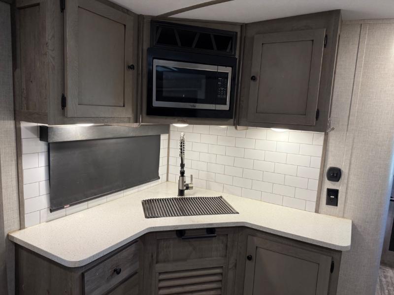 With any Keystone Outback travel trailer and toy hauler you will enjoy a lighter wallboard and white countertops for the modern farmhouse feel with more refined flooring, furniture, and cabinet hardware. You can extend your camping season thanks to the Astro-foil barrier added to the fully enclosed underbelly with ducted heat, the Coleman-Mach Quiet Series A/C offering a significant reduction of in-cabin sound levels, and an upgraded 10 cu. ft. 12V GE refrigerator to mention a few notables. The Lippert Step Above entry steps, the water docking station, the rear ladder, and the HyperDeck high performance, water-resistant RV floor are a few more reasons you will want to own an Outback for years to come!