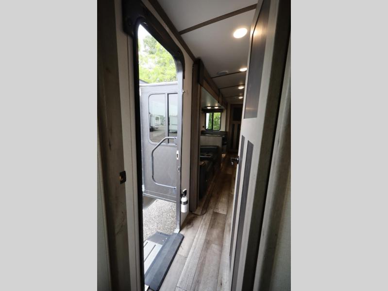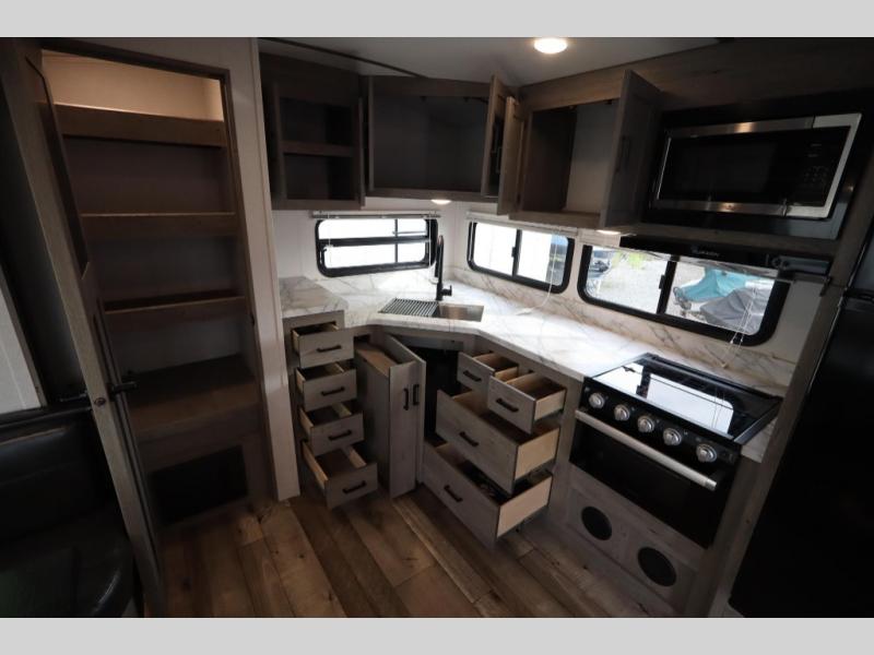 See how easy and convenient camping can be inside this Outback Ultra Lite travel trailer. You will find the rear kitchen layout provides plenty of space to cook without having to move when someone is walking to the opposite end of the trailer. The single slide will let you and your family relax comfortably on the sofa sleeper or the booth dinette, and you will enjoy reading a book while lying on the queen-size bed in the front master suite. And the double-entry bathroom allows you to quickly access it at night from the bedroom, plus the kids can use the hallway entrance.
