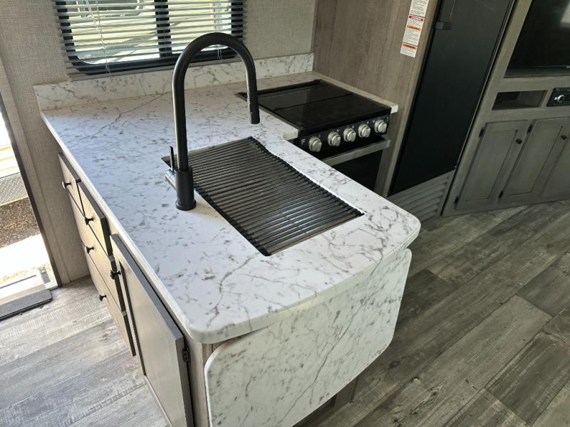 With any Keystone Outback Ultra Lite travel trailer or toy hauler, you will enjoy a beautiful interior that is outfitted with modern style. Some models feature interior sliding barn doors, and all models have extra-tall slide height for more head space. You can extend your camping season thanks to the one-piece polypropylene heated, enclosed underbelly, the 15K BTU A/C with true Race Track ducting, and the upgraded 10-cubic foot 12V gas/electric refrigerator. Some other notable features are the fully walkable 3/8" roof decking and one-piece TPO membrane, the HyperDeck flooring, and the outside shower. These are just a few of the reasons you will want to own an Outback Ultra Lite to explore the outdoors!