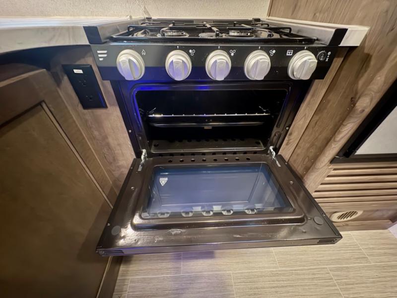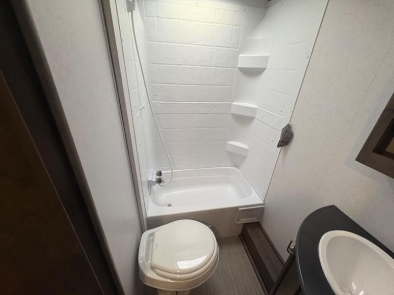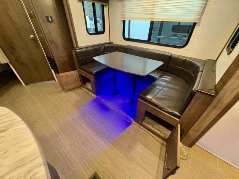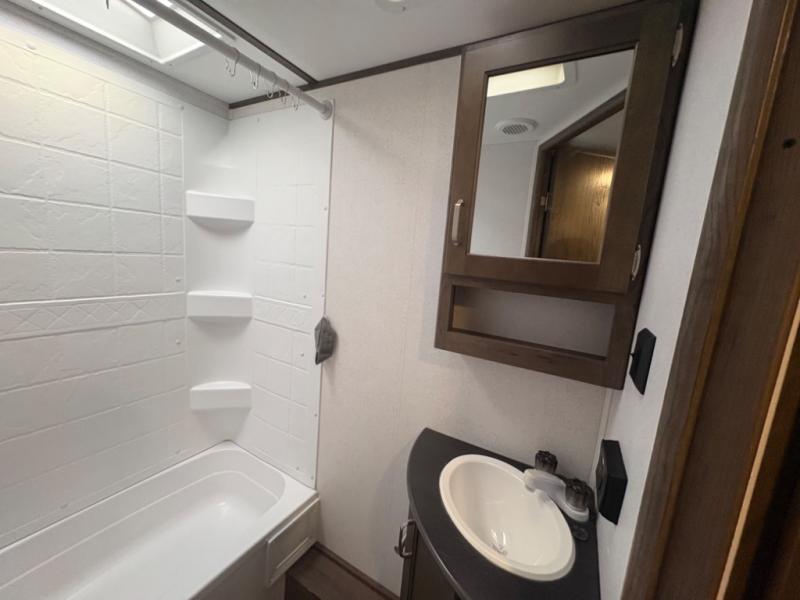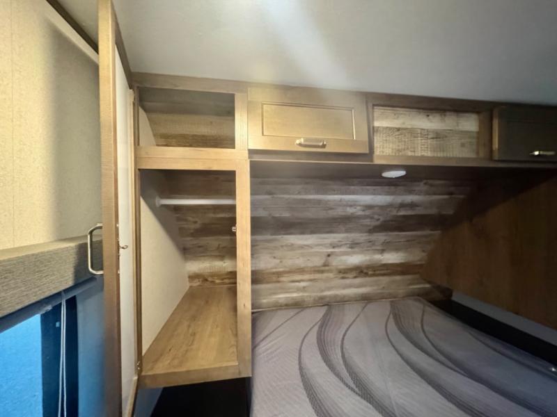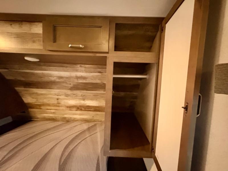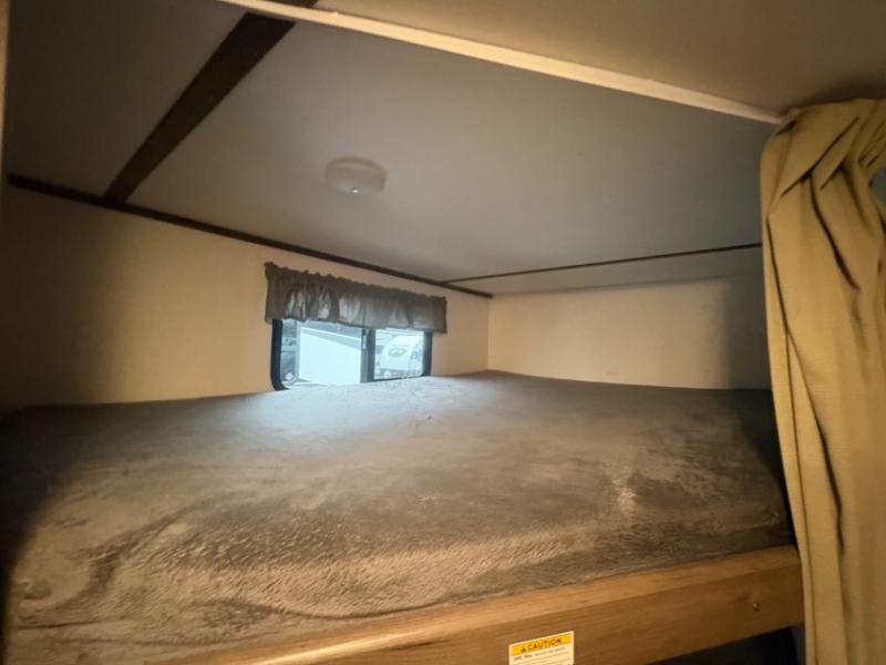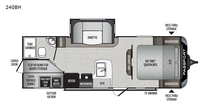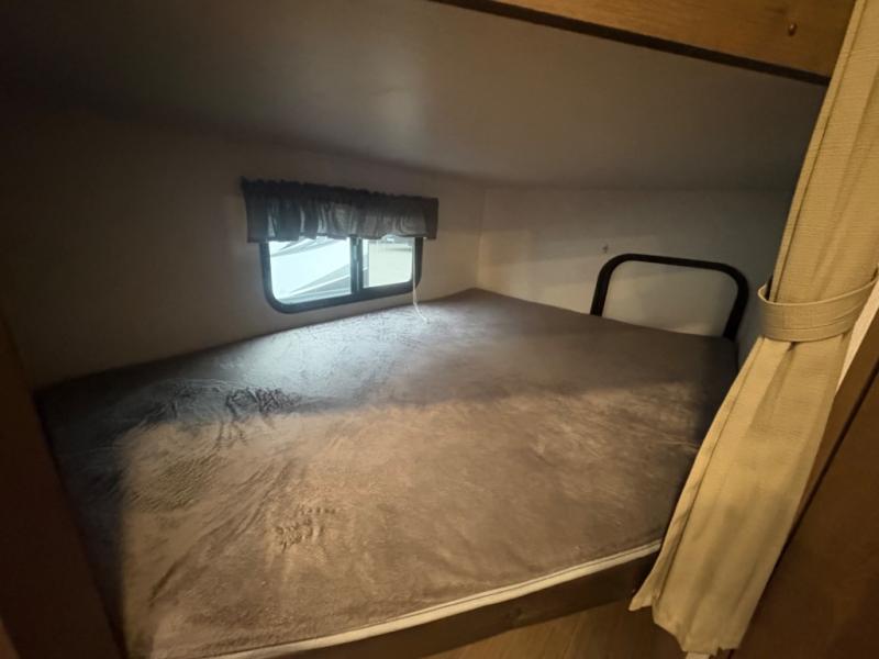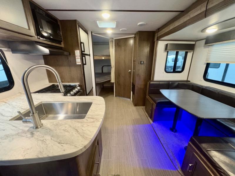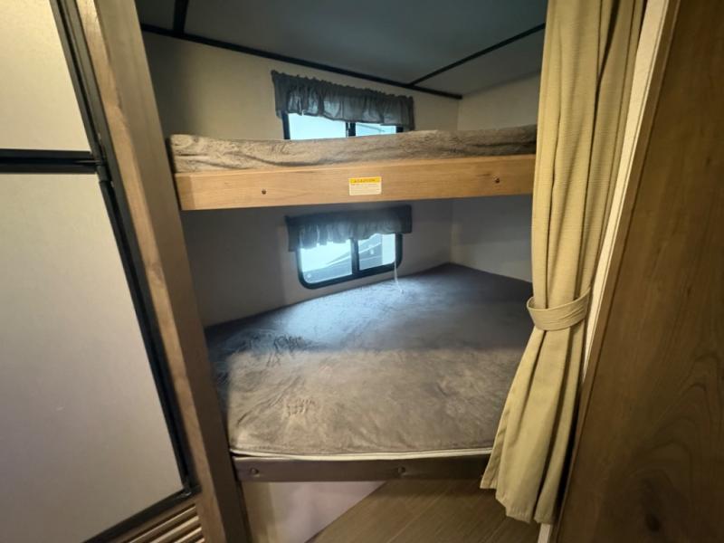 If you have decided to upgrade your RV, this Passport travel trailer is the ticket! You will find comfortable bedding in the private bedroom for yourself and double-size bunks for the kids on the opposite side of the trailer. If extra friends tag along, the U-shaped dinette slide provides additional sleeping space for one to two campers, as well as floor space for everyone. The chef can choose between the inside appliances and the outside kitchen to make meals, and there is a full bathroom conveniently next to the bunks. Step inside to see how roomy and comfortable this Passport will be for you and your family for years to come.