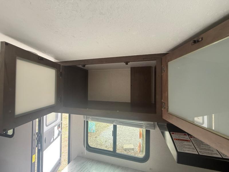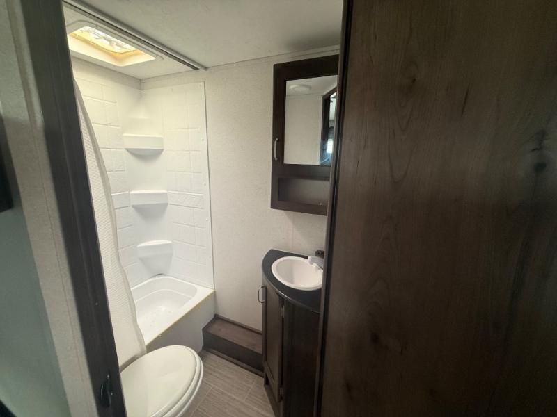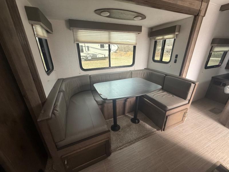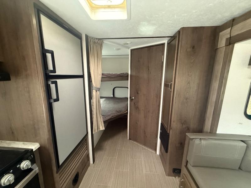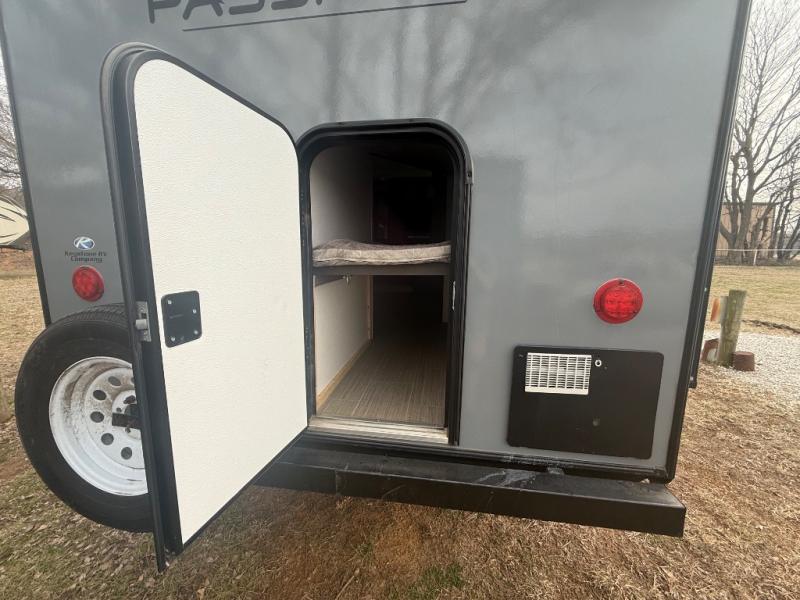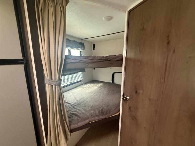 If you have decided to upgrade your RV, this Passport travel trailer is the ticket! You will find comfortable bedding in the private bedroom for yourself and double size bunks for the kids on the opposite side of the trailer. If extra friends tag along, the U-shaped dinette slide provides additional sleeping space for one to two campers, as well as floor space for everyone. The chef can choose between the inside appliances and the outside kitchen to make meals, and there is a full bathroom conveniently next to the bunks. Step inside to see how roomy and comfortable this Passport will be for you and your family for years to come.