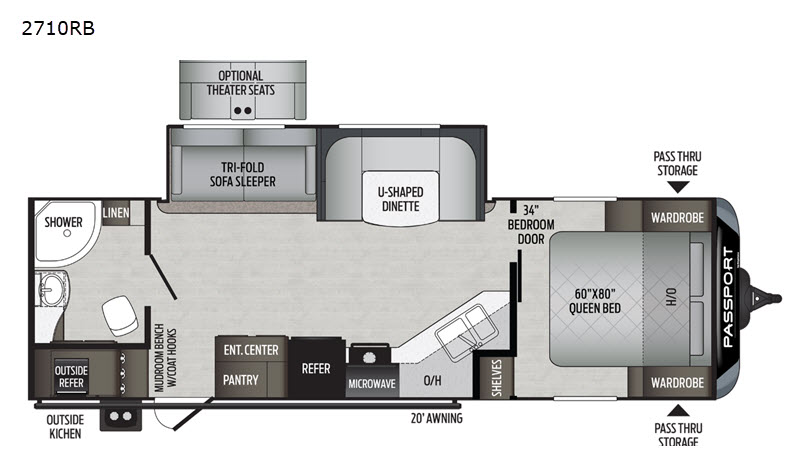 Daydreams can come true in this Passport travel trailer! As you enter this model, you can have a seat on the mud room bench, hang your jacket on the coat hooks, and then grab a drink from the refrigerator. After relaxing on the tri-fold sofa sleeper or U-shaped dinette, be sure to get cleaned up in the rear bathroom with a radius shower. When it's time for bed, the private front bedroom will be calling your name, and the kids or your overnight guests can fold down the furniture to use for their sleeping space. In the morning, you can choose to cook inside with full kitchen amenities, or you can go outside to use the outdoor kitchen.
