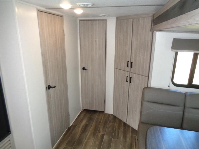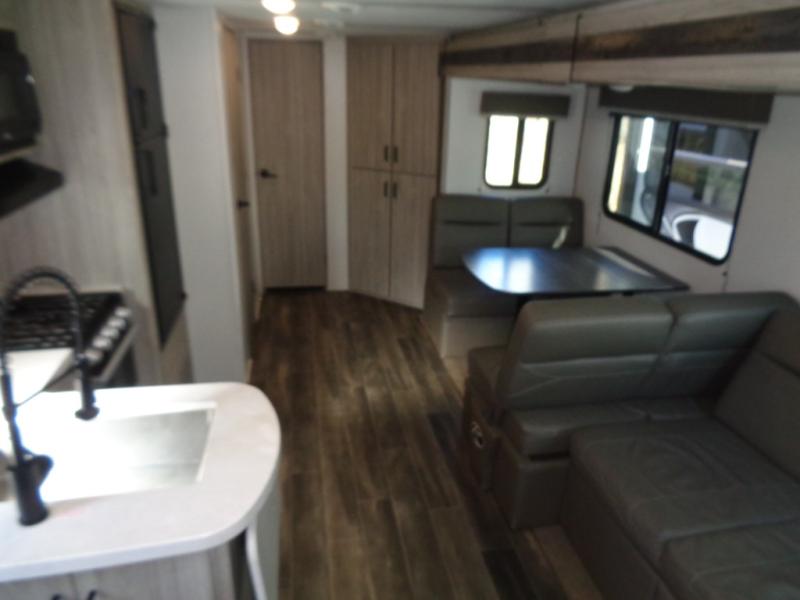 This Passport travel trailer has an amazing amount of storage capabilities with its two exterior pass-through storage compartments! There is also excellent interior storage with the bedside wardrobes, bunkhouse storage, kitchen pantry, and bathroom linen closet. This trailer is also full of sleep space with its queen-size bed up front in the private bedroom, its four bunk beds back in the rear bunkhouse, and its U-shaped dinette and tri-fold sleeper sofa in the main living area. The dinette and sofa rest on a large slide so that you have plenty of room as you spend time indoors, and the kitchen has everything you need to make all of your family's favorite recipes.
