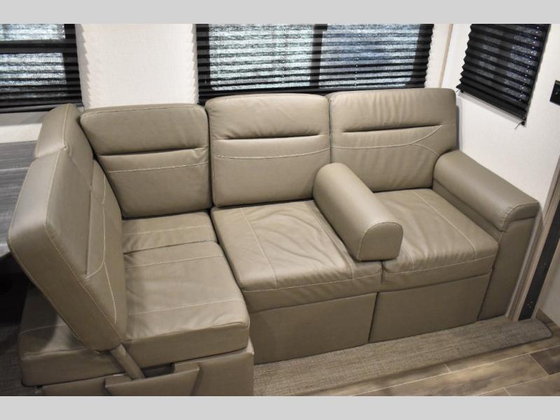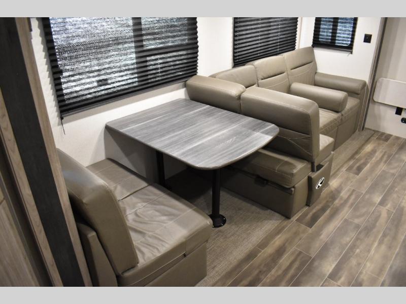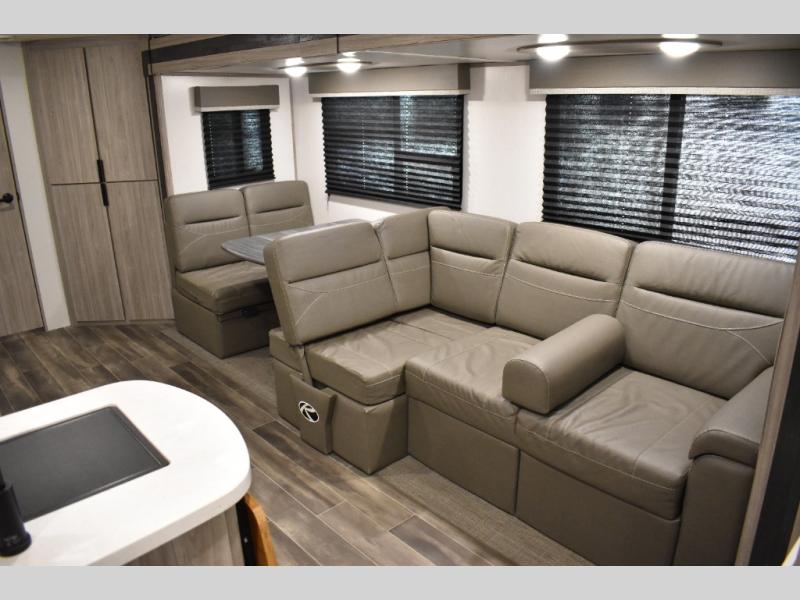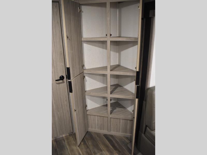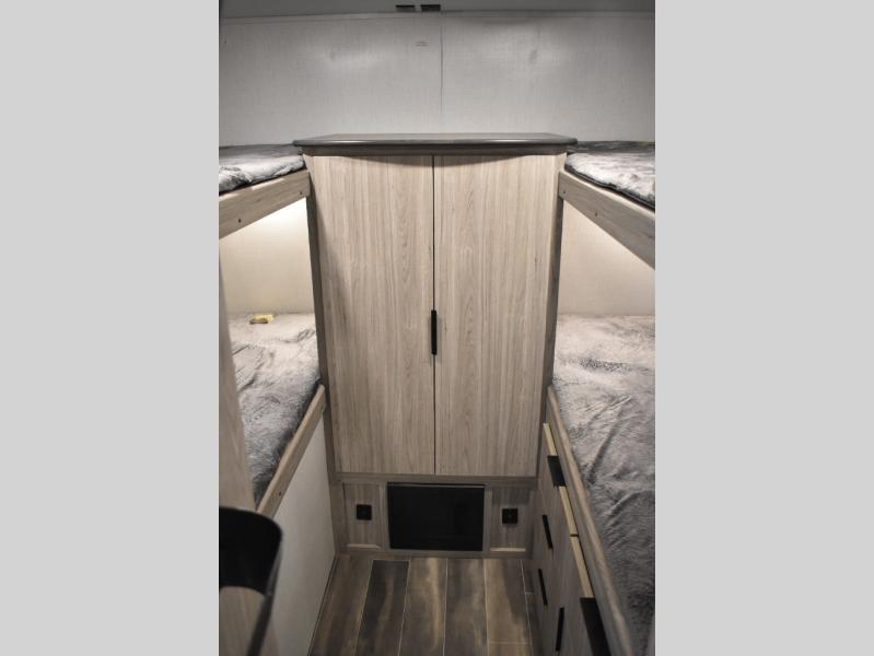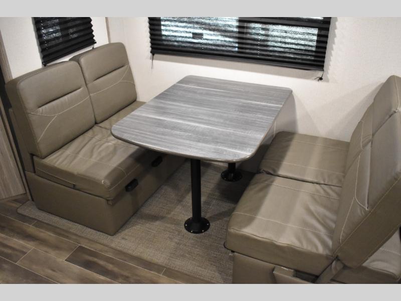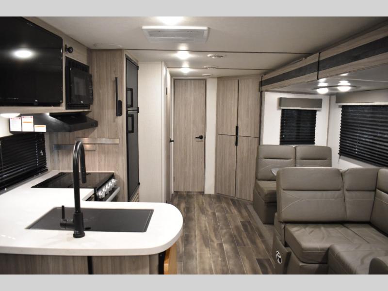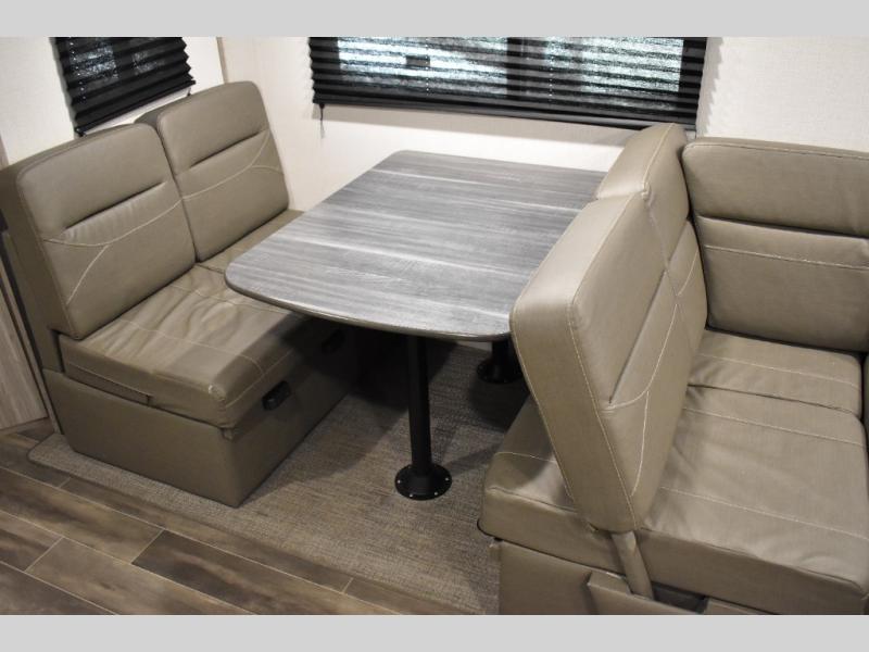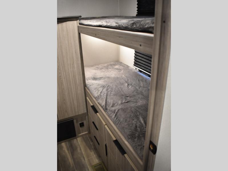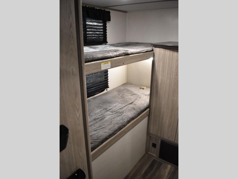 This Passport travel trailer has an amazing amount of storage capabilities with its two exterior pass-through storage compartments! There is also excellent interior storage with the bedside wardrobes, bunkhouse storage, kitchen pantry, and bathroom linen closet. This trailer is also full of sleep space with its queen-size bed up front in the private bedroom, its four bunk beds back in the rear bunkhouse, and its U-shaped dinette and tri-fold sleeper sofa in the main living area. The dinette and sofa rest on a large slide so that you have plenty of room as you spend time indoors, and the kitchen has everything you need to make all of your family's favorite recipes.