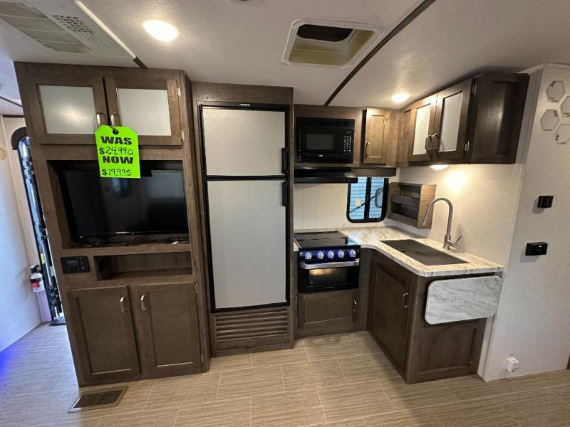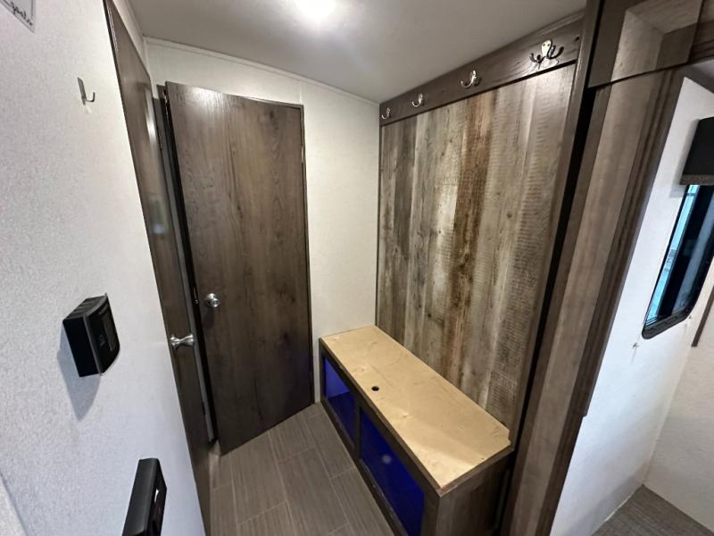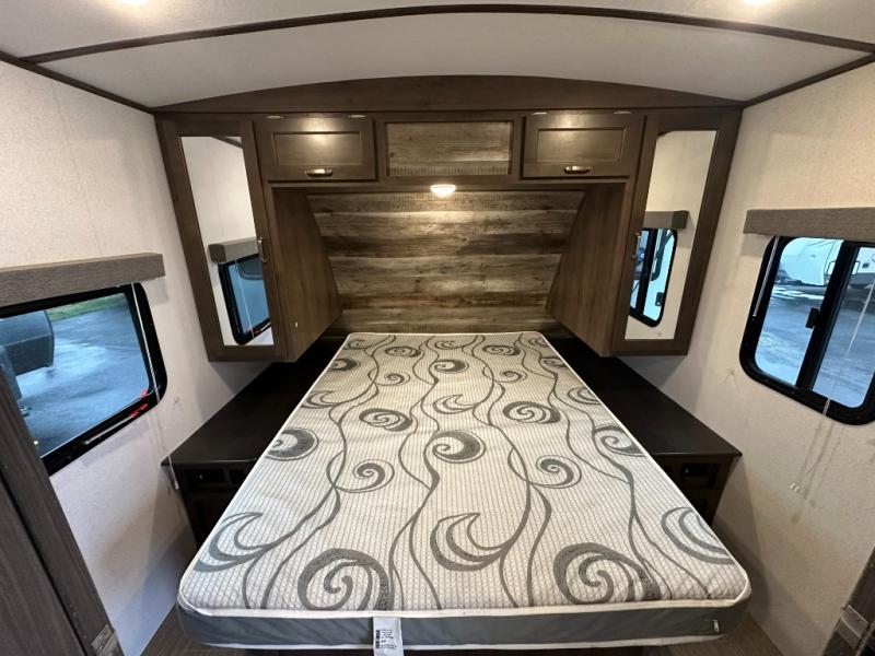 Just imagine you and your family enjoying the great outdoors with inside comforts just steps away in this Passport travel trailer. You can relax under the adjustable electric awning, make a meal at the outside kitchen, and quickly get inside with two exterior entry doors. The private bunkhouse offers three bunk beds to choose from and two flip chairs as well. There is even a slide out that offers more floor space. Everyone will be able to keep their cellphones at 100% with the USB charging ports, and you can grab a snack at any time from the walk-in pantry.