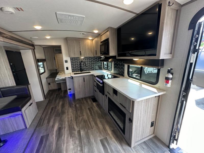 As you peek through this Passport GT travel trailer, you'll find more to love the more that you look! Keystone has included thoughtful features that will enhance your camping experience. Some of these features include the flip-up countertop in the kitchen and the pull-out storage drawer at the entertainment center. The rear bathroom is extremely accommodating with its dual-sink vanity, linen closet, and closet prepped for a washer/dryer, and out in the main living area, there is extra living space when you put the large slide into place. You can also choose to add an optional fireplace to make the interior cozy and inviting.