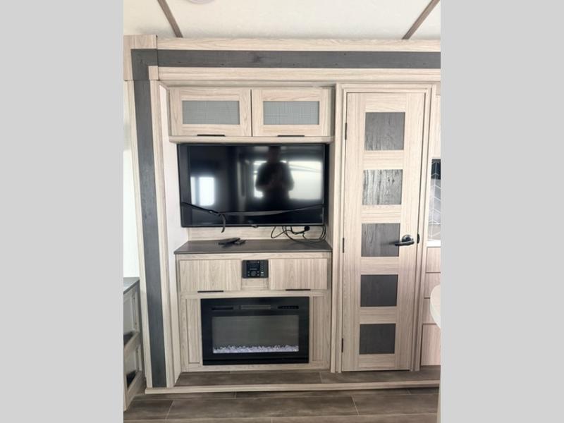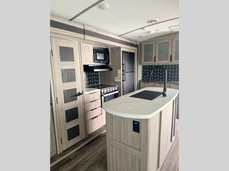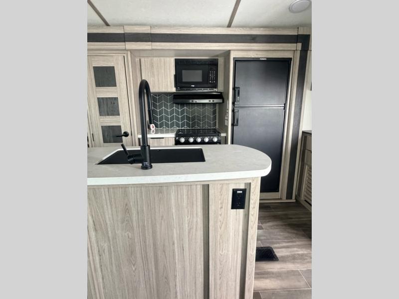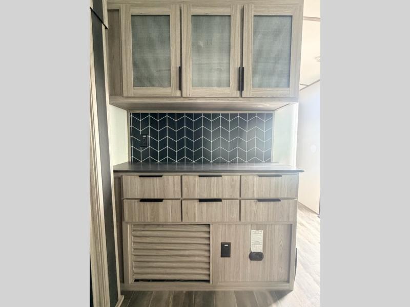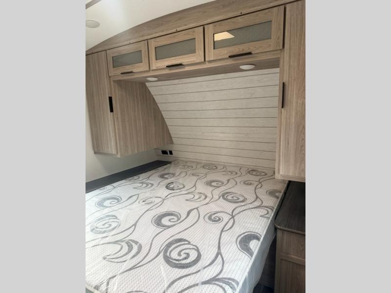 What makes this Passport GT travel trailer so desirable is the exceptional rear living area! This space has two opposing slides so that you never feel cramped while you relax. There is a tri-fold sleeper sofa and theater seating to lounge on, and the entertainment center has a place to add an optional fireplace. Since the kitchen is included within this same space, you won't have to go far when you want a snack while you're watching a movie. Just head over to the pantry to grab some chips, or you can quickly use the microwave to heat up something from the 8-cubic foot refrigerator. The curio cabinet is also a nice touch to the kitchen because it is both stylish and functional.