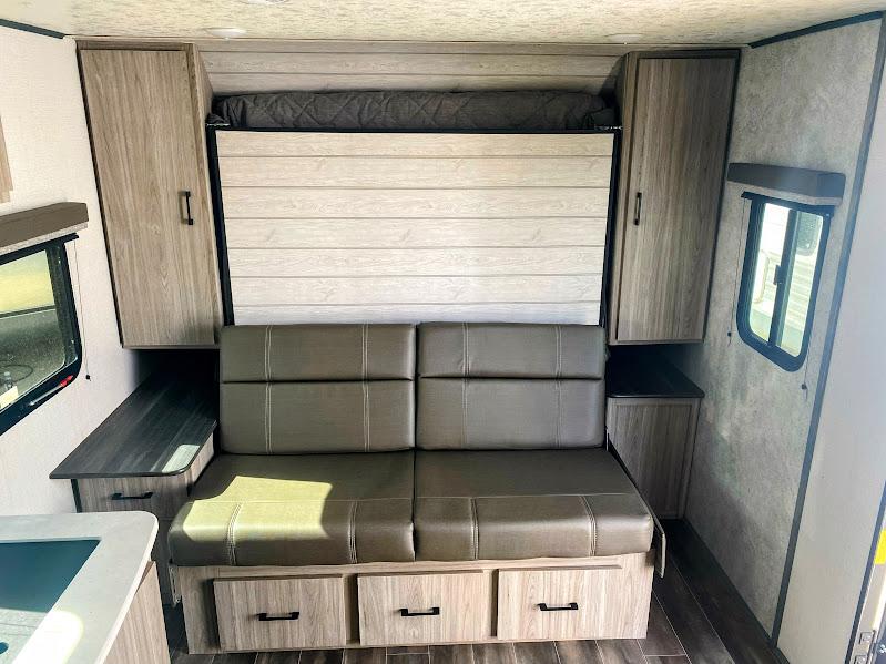 This Passport SL travel trailer has a functional interior that allows you to have lots of sleeping space without taking up too much interior space! The double size bunks can accommodate travel gear when you use the exterior rear cargo door with the flip up bunk. The Murphy bed can be pushed out of the way to reveal a sofa for afternoon lounging, and the booth dinette can also transform from a dining area into a sleeping area. Outside, you'll enjoy cooking some burgers at the outdoor kitchen while you stay protected underneath the 15' awning, and the pass-through storage is going to allow you to bring some extra equipment.