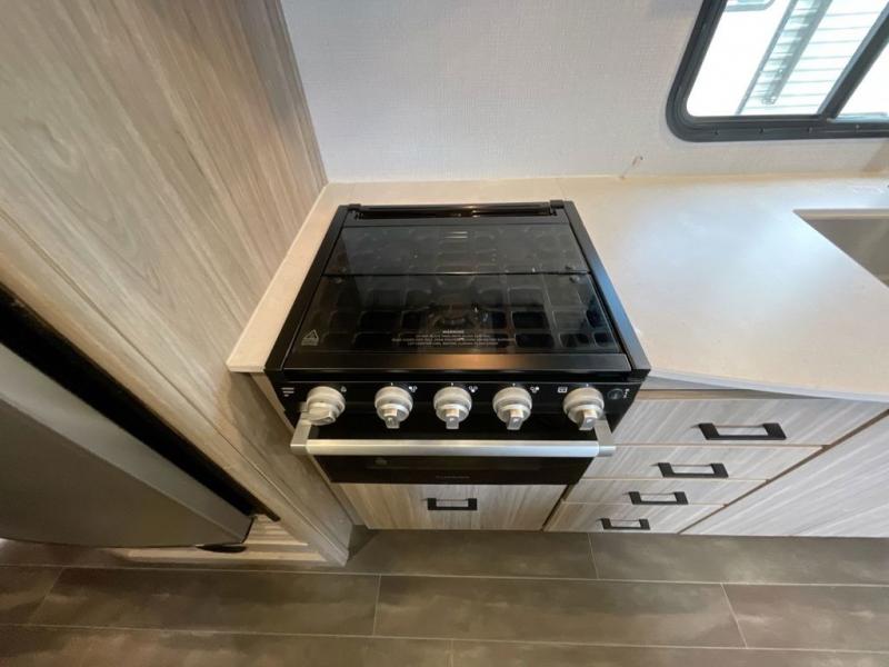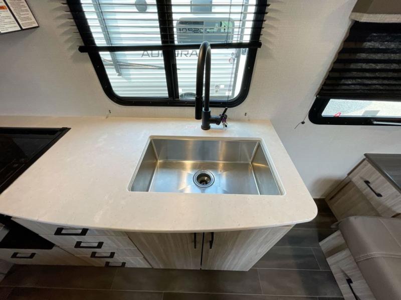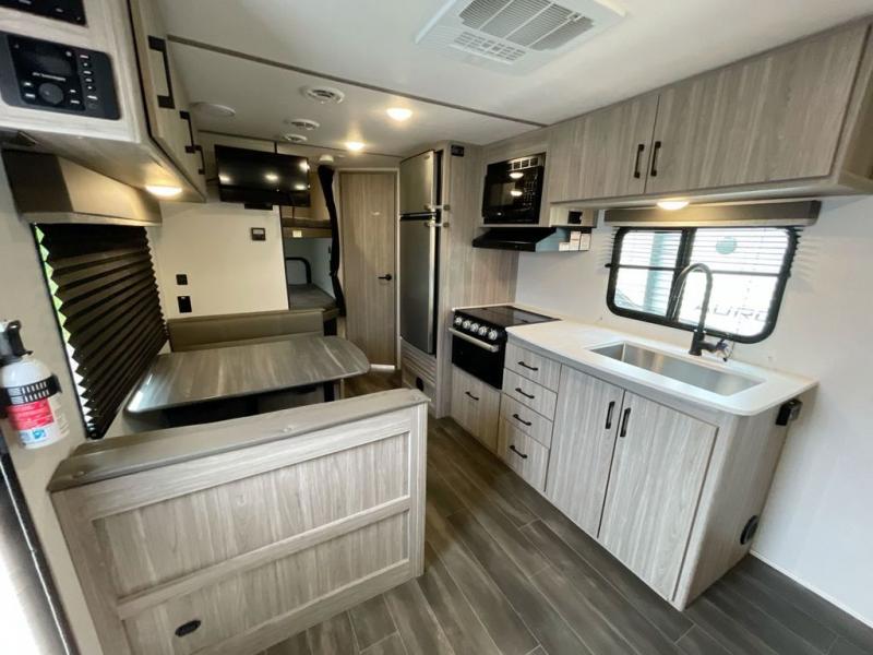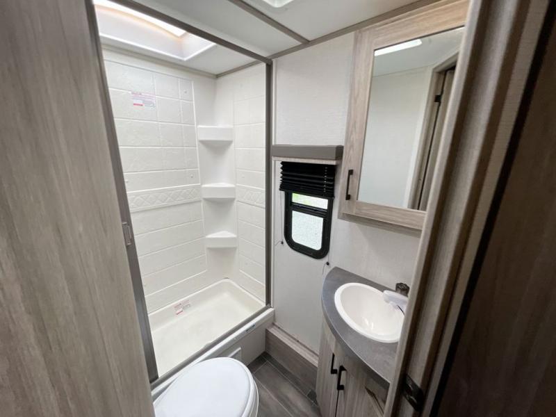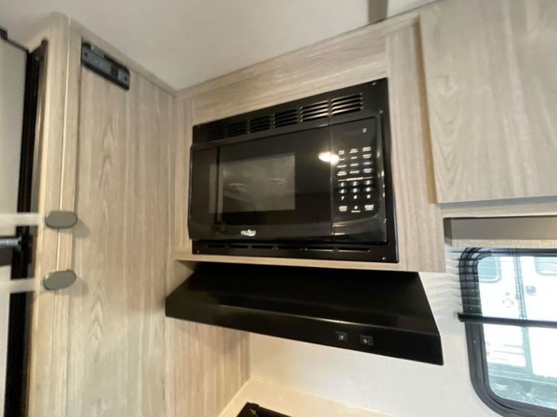 The Passport SL travel trailers by Keystone RV come in a compact design with travel-friendly lengths that are lightweight and easy to tow behind many smaller crossover SUVs. You will find several residential-style features such as durable Armstrong vinyl flooring, upgraded window treatments and valances, and bathroom countertops. The exterior shower with hot and cold water is very useful as you get cleaned up before entering the RV, wash your pets, or even rinse a few dishes outside. The Passport also now contains a HyperDeck flooring system which is a high-performance, water-resistant RV floor that comes as a breakthrough design from the Keystone Innovation Lab. This flooring is more resilient, stronger, and lighter than traditional laminated wood construction.