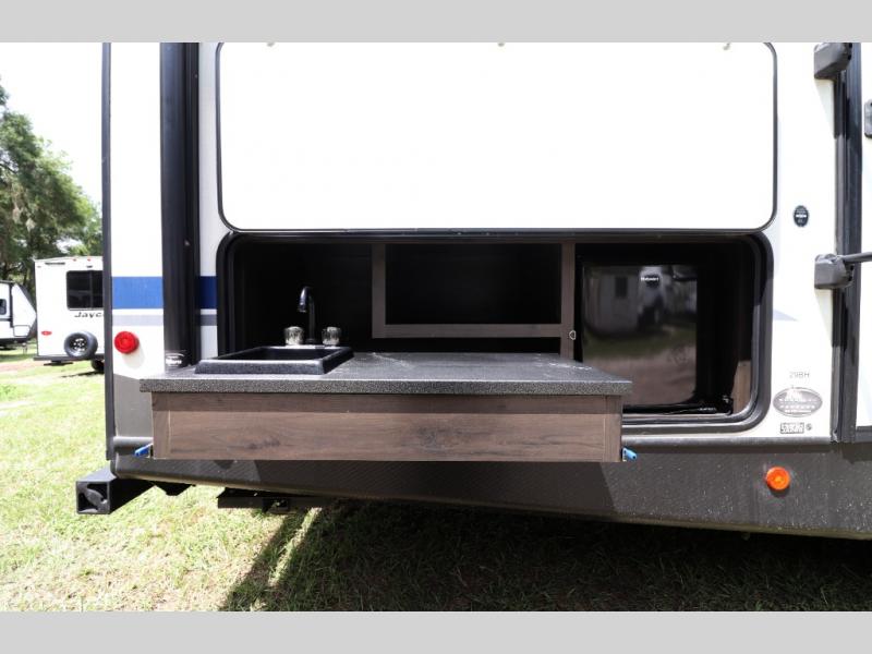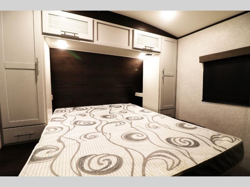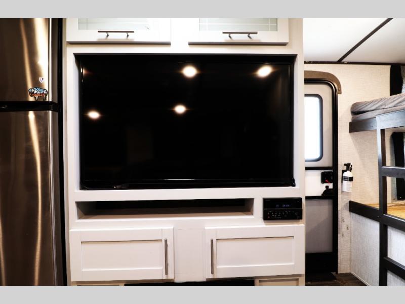 The Premier 29BHPR showcases aerodynamic front fiberglass cap, sleek frameless tinted windows, aluminum-framed laminated sidewalls, radius roof, and bold Keystone graphics. The oversized pass-through storage compartment gives you room for all your gear, while the power awning with built-in lighting lets you enjoy evenings outside with ease.