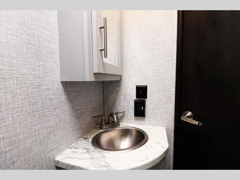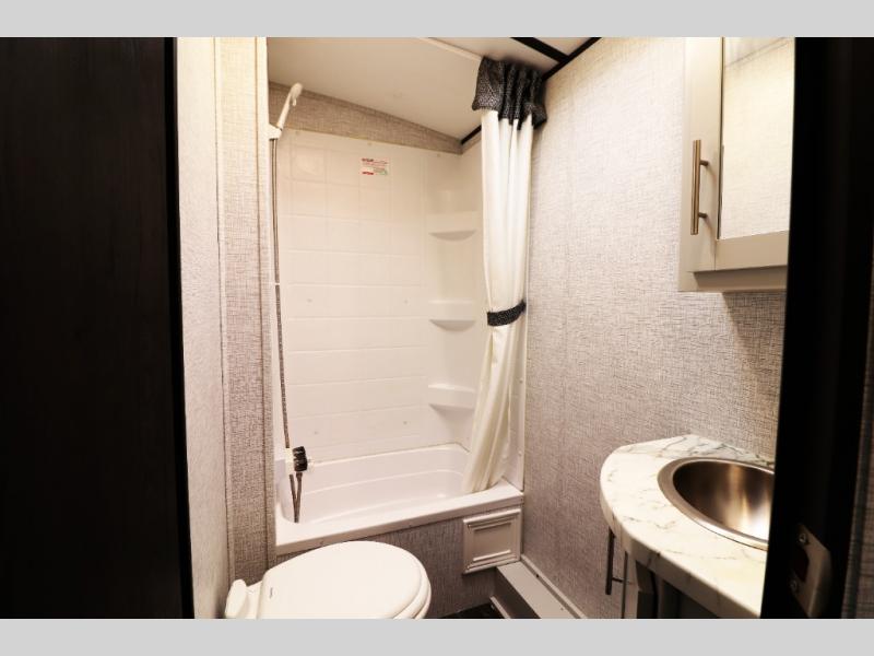 Full Bathroom with Exterior Entry Door – convenient for beach days or campground traffic