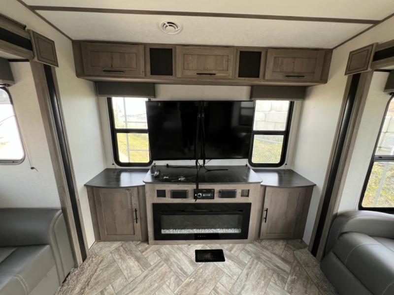 Step inside this Keystone Springdale fifth wheel and see just how easy camping can be. This unit features three slides for added interior space, a rear entertainment center, and a front master suite. In the bedroom, you will find a comfortable queen bed for you to enjoy a good night's rest and closets on either side for you to keep your clothes neat and tidy, plus there is also a wardrobe. You even have access to the dual-entry bath, which will come in very handy at night. The rear wall offers a full entertainment area with a 50" LED TV. If it is a lazy day, turn on the TV and enjoy a movie with a blanket in front of the fireplace. There are plenty of overhead cabinets for all of your storage needs, plus some lower cabinets as well!