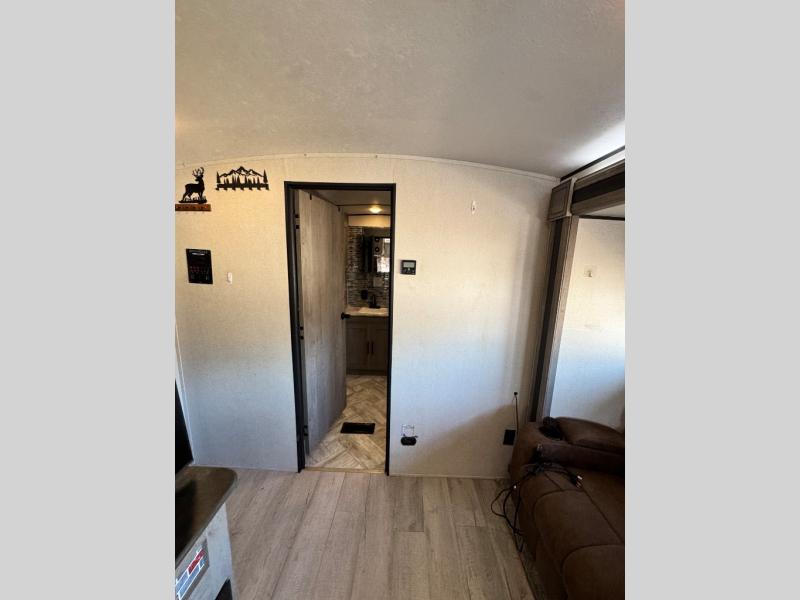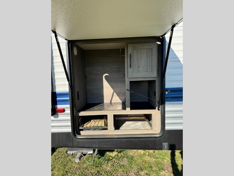 You will love camping in this comfortable Springdale travel trailer! The cook in the family will love having this kitchen and the walk-in pantry for all of your non-perishables. There is even a small fridge outside for a few drinks, so you don't have to walk all the way back into the trailer for a cold beverage, and the outdoor cooktop will be especially helpful when you prepare dinner when visiting with others relaxing under the 21' power awning. Once your adventures are done for the day, you can fall asleep in the private front bedroom, and there is a booth dinette and sofa in the main living area that can be used for relaxing, eating, sleeping and enjoying one another's company.