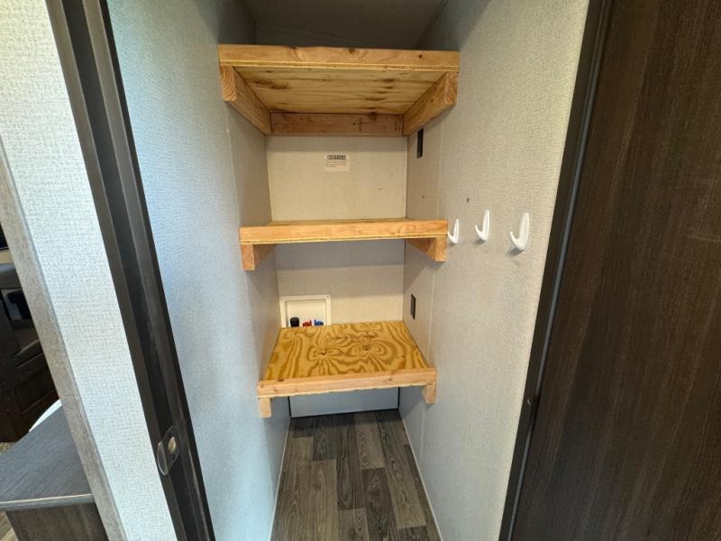 In this Keystone Springdale travel trailer, you have plenty of room for hosting and sleeping up to nine individuals throughout your vacation. There is a queen bed in the front private bedroom, double-size bunks in the rear, plus a sofa and a booth dinette that folds down so that you can have an extra sleeping space. You will have places for relaxing, cooking, playing games, or talking late into the night with your loved ones. Don't be afraid to bring along as much as you want. You have a walk-in pantry, a few overhead cabinets, and dual closets in the bedroom for storing your travel items.
