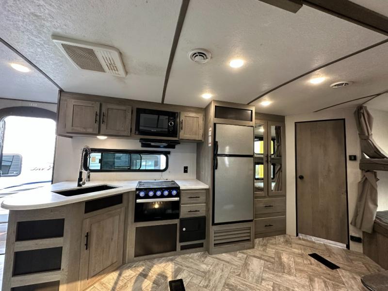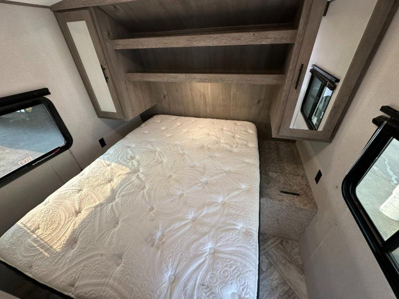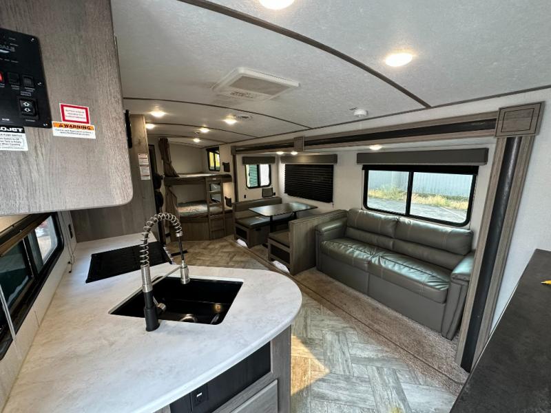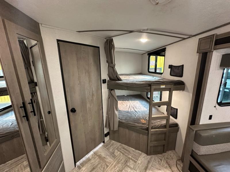 This is the perfect travel trailer for a larger family or one that likes to travel with extra guests. This Keystone Springdale features double entry doors, a set of double-size bunks, and a large slide for added interior space. In the private front bedroom, there is a sliding door for more privacy while you get changed into your pajamas or sleep on the queen bed. In the back, there are double-size bunks with a bunk ladder for your kids or friends to use, and the convenience of the full bathroom being located right next to these bunks is super nice, especially at night. The exterior entry into the bathroom also makes it easy to access when enjoying the outdoors without having to run through the entire trailer to get to the bathroom!