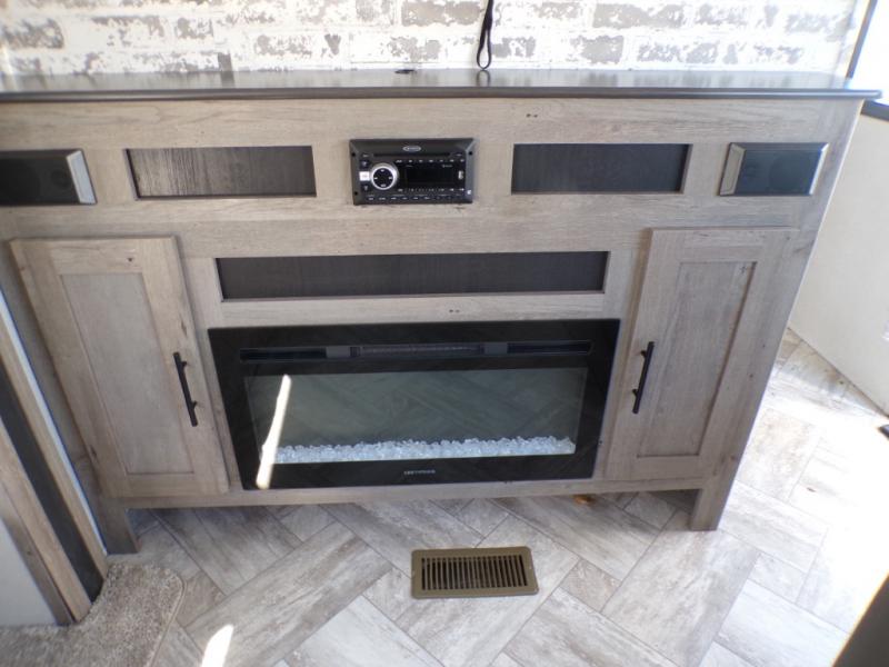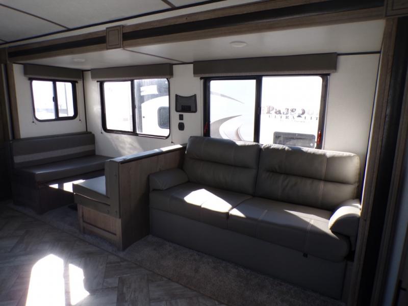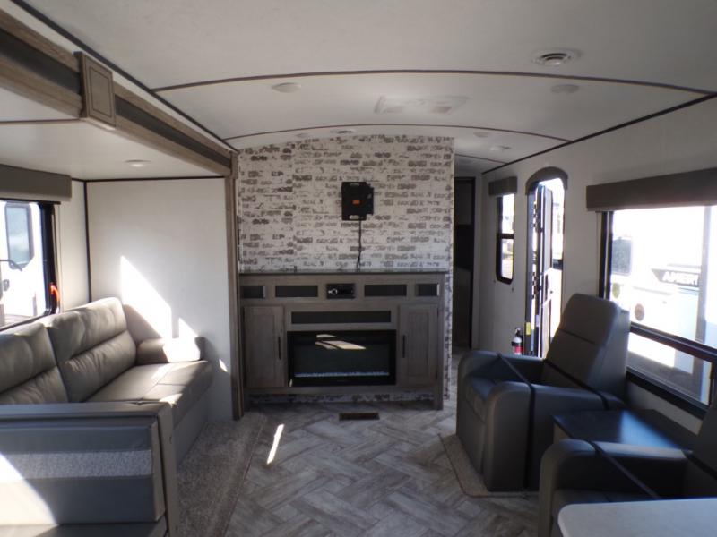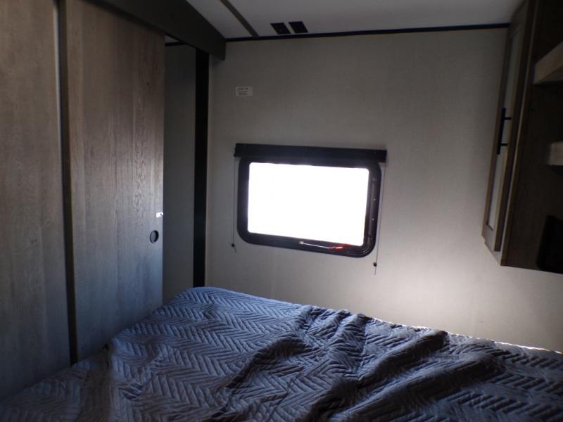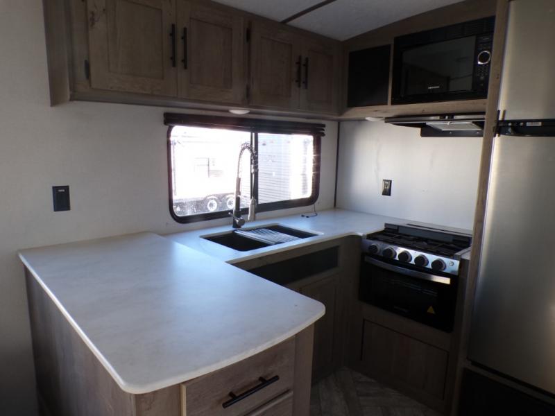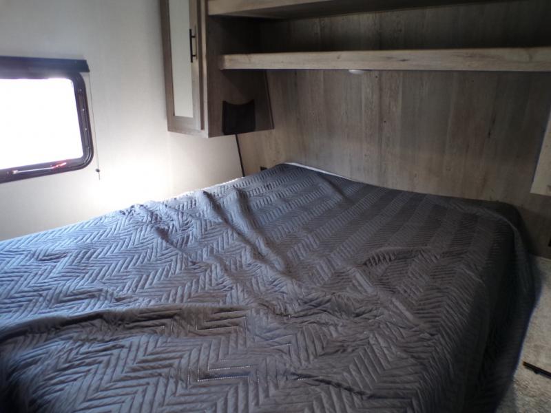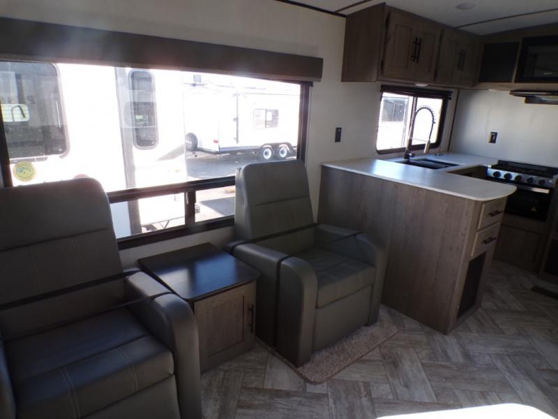 The rear kitchen in this Springdale travel trailer is great because of the U-shaped countertop which gives you plenty of room for prepping your meals and cleaning up as well as all the appliances and the pantry. There are a few seating choices throughout where you can relax, play games, or eat meals, like the two recliners with a table in between to place your drinks and keys, the sofa, and the booth dinette. The private master bedroom up front has a queen bed which is perfect for a good night's rest, and storage on each side plus above the head of the bed.
