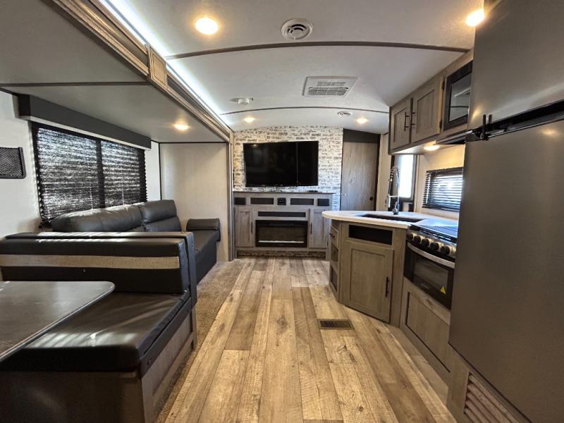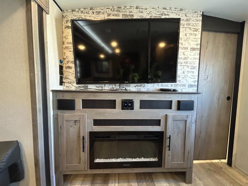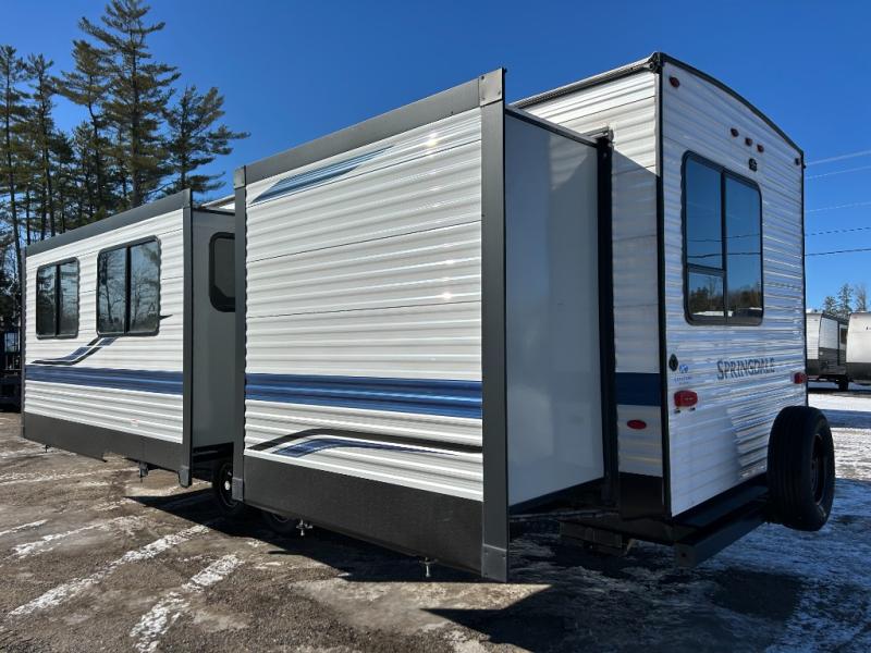 If you find yourself dreaming about weekend adventures, then you need to stop dreaming and start living those adventures with this Springdale travel trailer! You will be able to access this trailer easily because of the two entry doors that have been added, and if you would rather just be outside, you can stay protected underneath the 18' power awning while you cook up a meal at the outdoor kitchen. Inside, you will find that there is a theater room/bunkhouse in the back that has a flip-up bunk with a fun lounger below so that you can watch the 50" HDTV with premium audio in comfort, and there is a second bunk that your child or guest can enjoy. The cook will love all the kitchen amenities inside as well, plus the main living area is a great place to gather and relax by the fireplace.